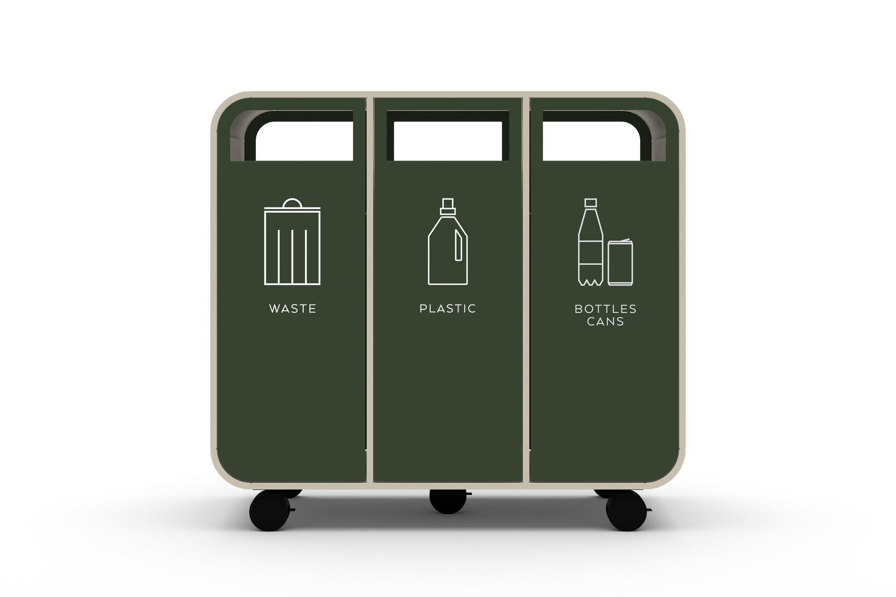 Mobilt affaldssortering med kabinet i laminat. Fem hjul hvoraf to er låsbare (foran). Soft close med magnet i hver dør. Udtræk til affaldsposer og gummimåtte medfølger. Vælg farven på dørene. Metaldør (3 mm tykkelse). Symboler waste, plastic og bottles/ cans. Egnede affaldssække 85-125 liter.