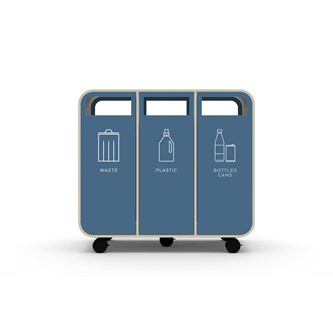 Mobilt affaldssortering med kabinet i klarlakeret MDF. Fem hjul hvoraf to er låsbare (foran). Soft close med magnet i hver dør. Udtræk til affaldsposer og gummimåtte medfølger. Vælg farven på dørene. Metaldør (3 mm tykkelse). Symboler waste, plastic og bottles/ cans. Egnede affaldssække 85-125 liter.