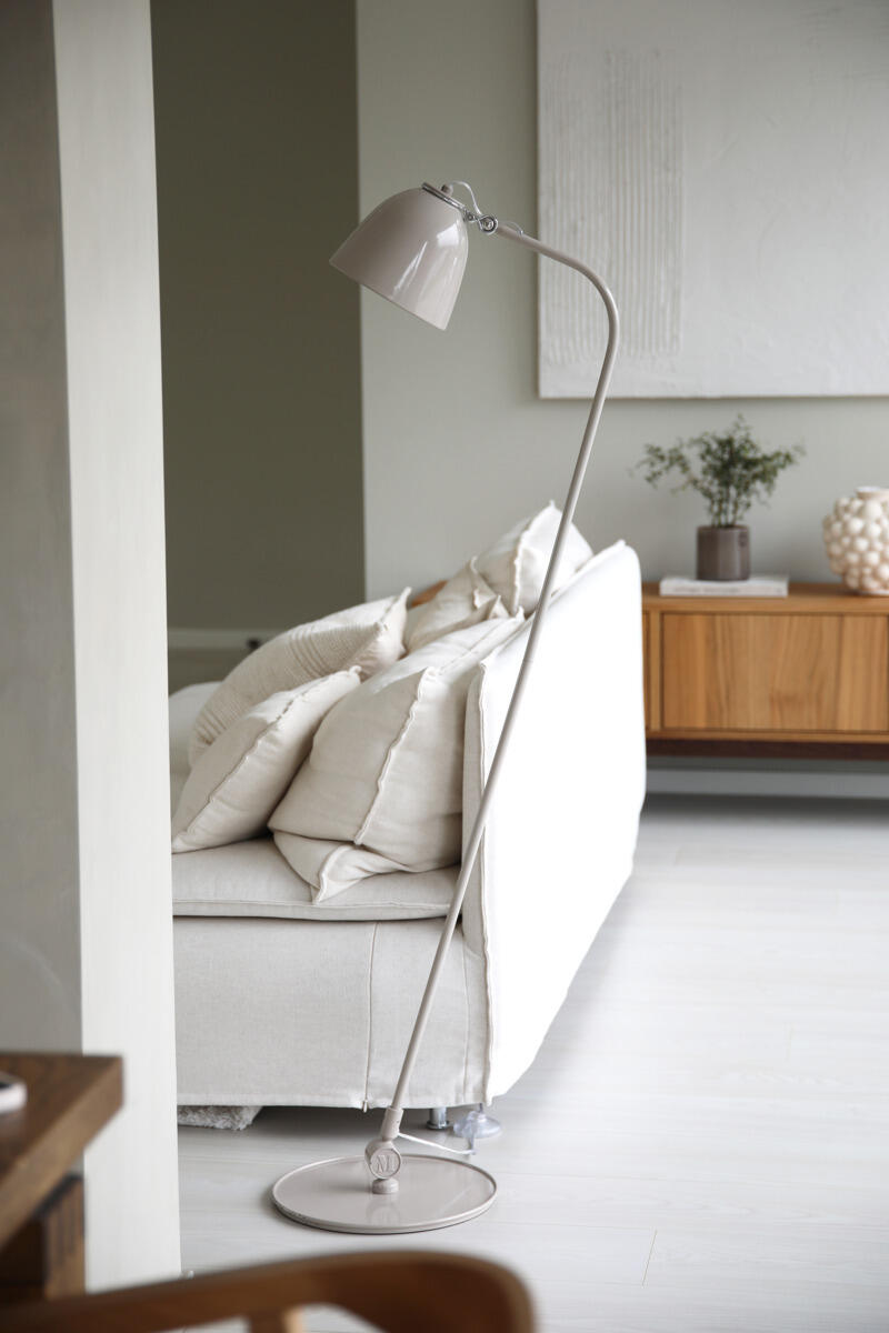 Gulvlampe i strukturlakeret metal med gennemtænkte detaljer. Designet er både veludført og legende. Armaturet er ikke dæmpbart. Maks. watt: 42. Sokkel E27. Ledning 2,4 m. Lyskilde købes separat.