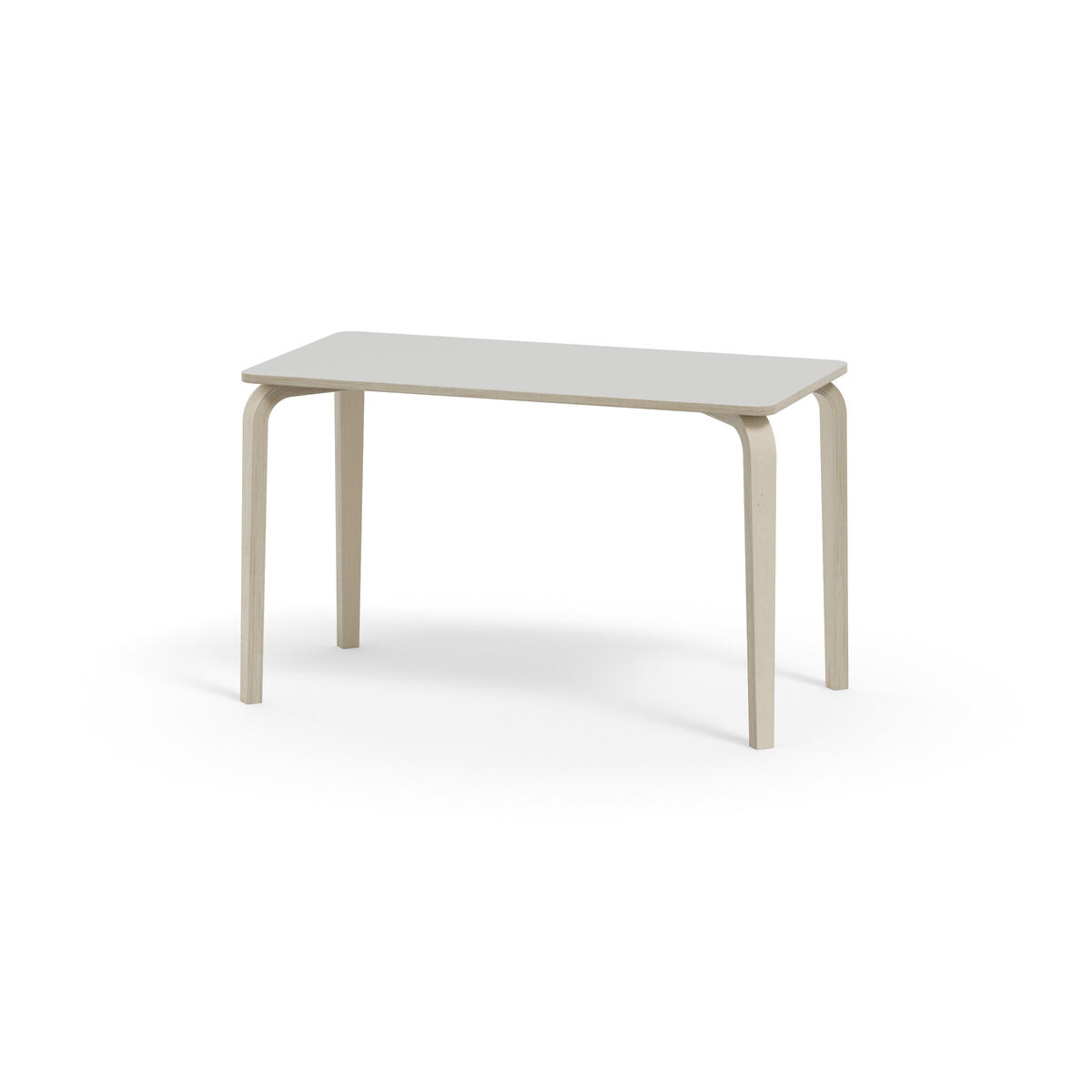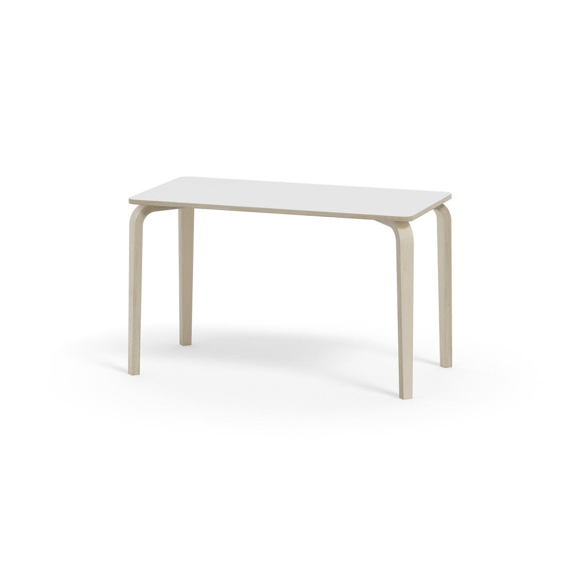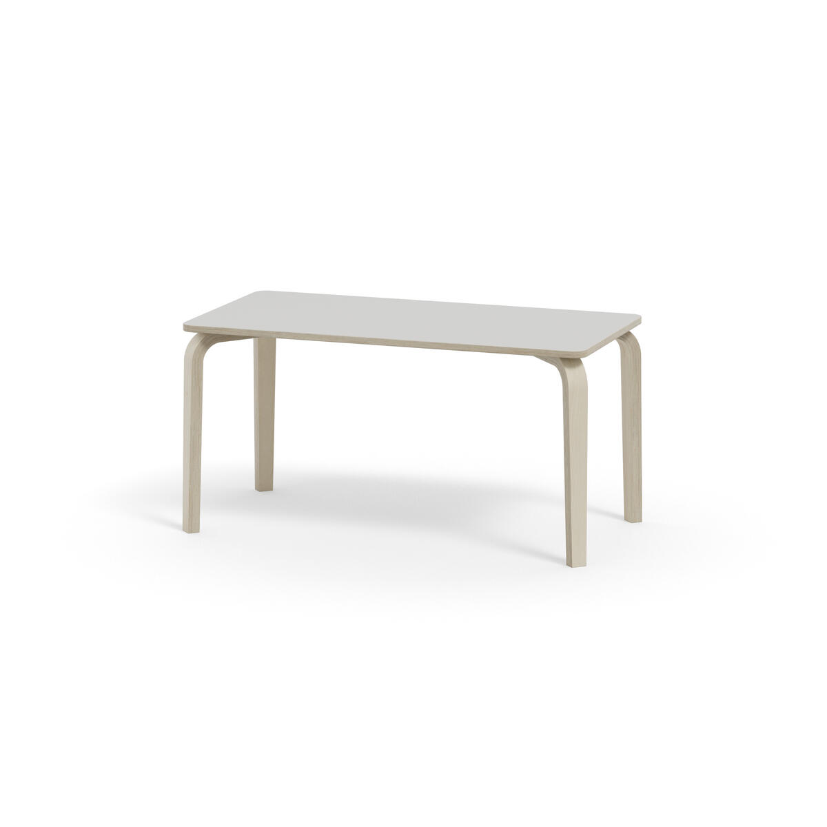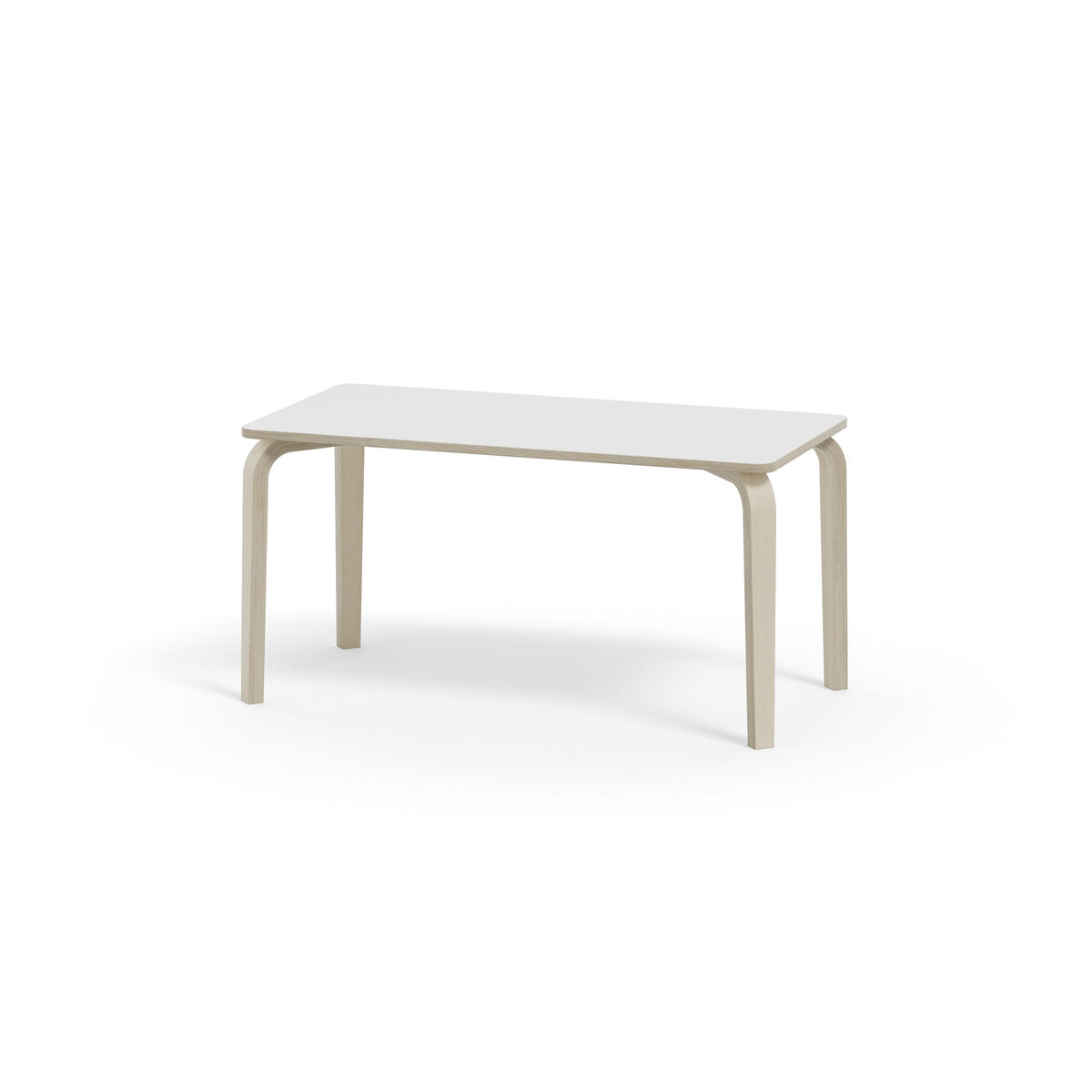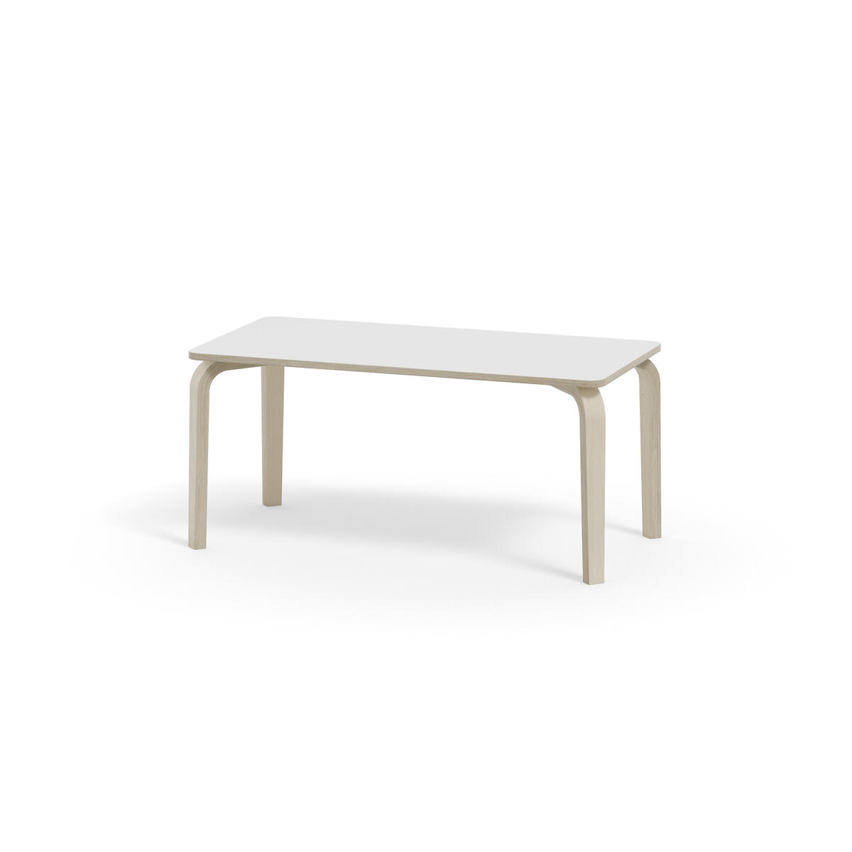 Bordserien Arcus har et praktisk design uden sarg, hvilket giver mere plads til benene. Overfladen er beklædt med laminat. Hjørneradius på 40 mm. Formspændte bordben i hvidpigmenteret birkekrydsfiner med let tilspidset form.