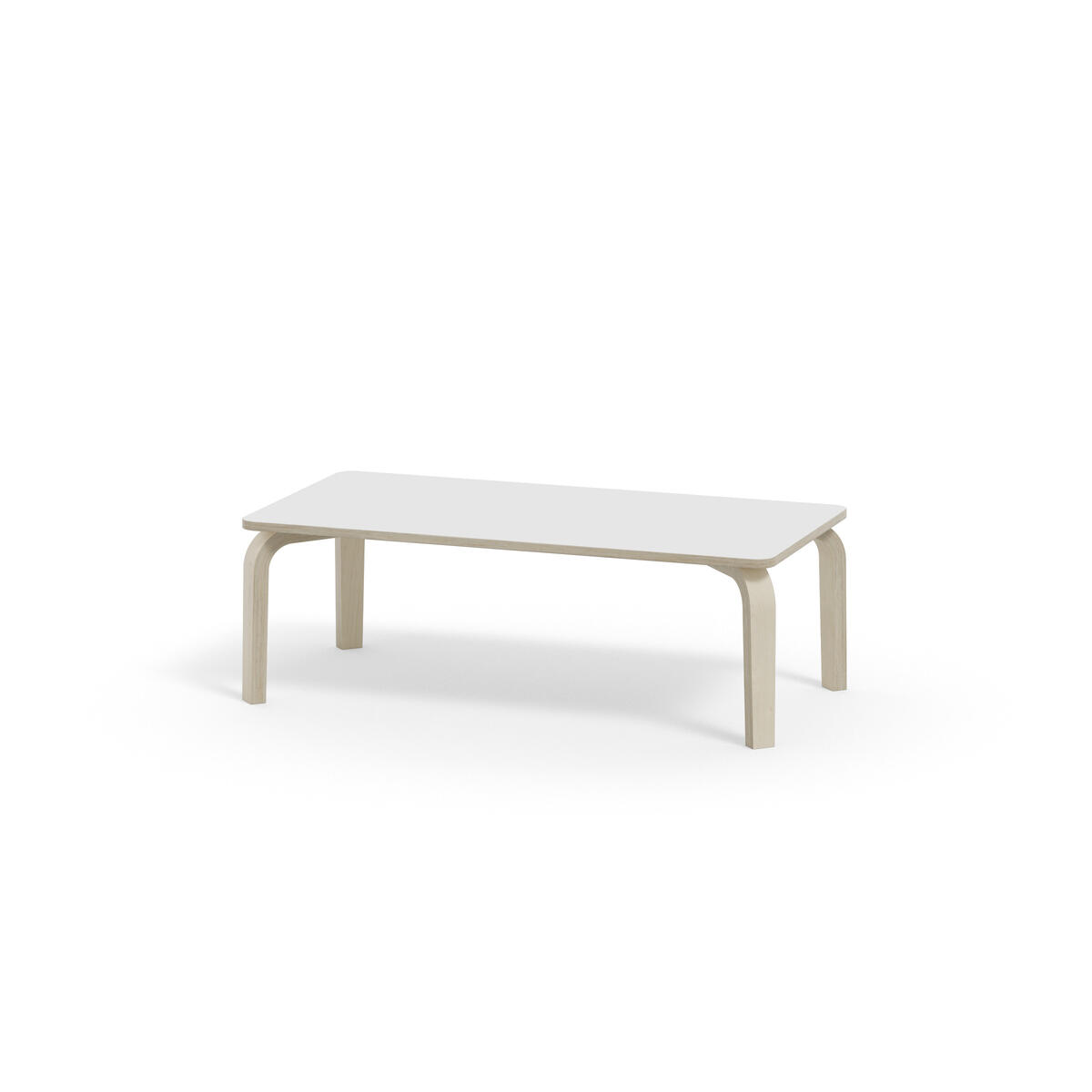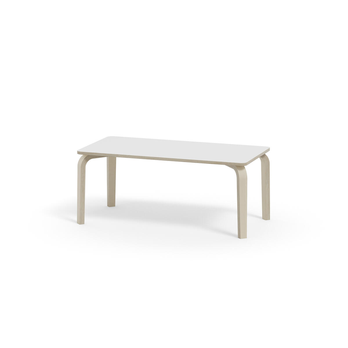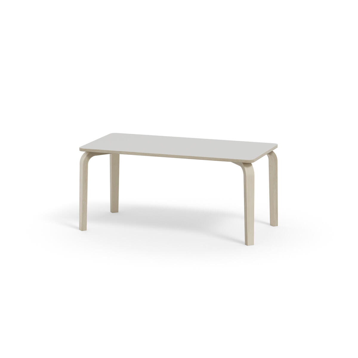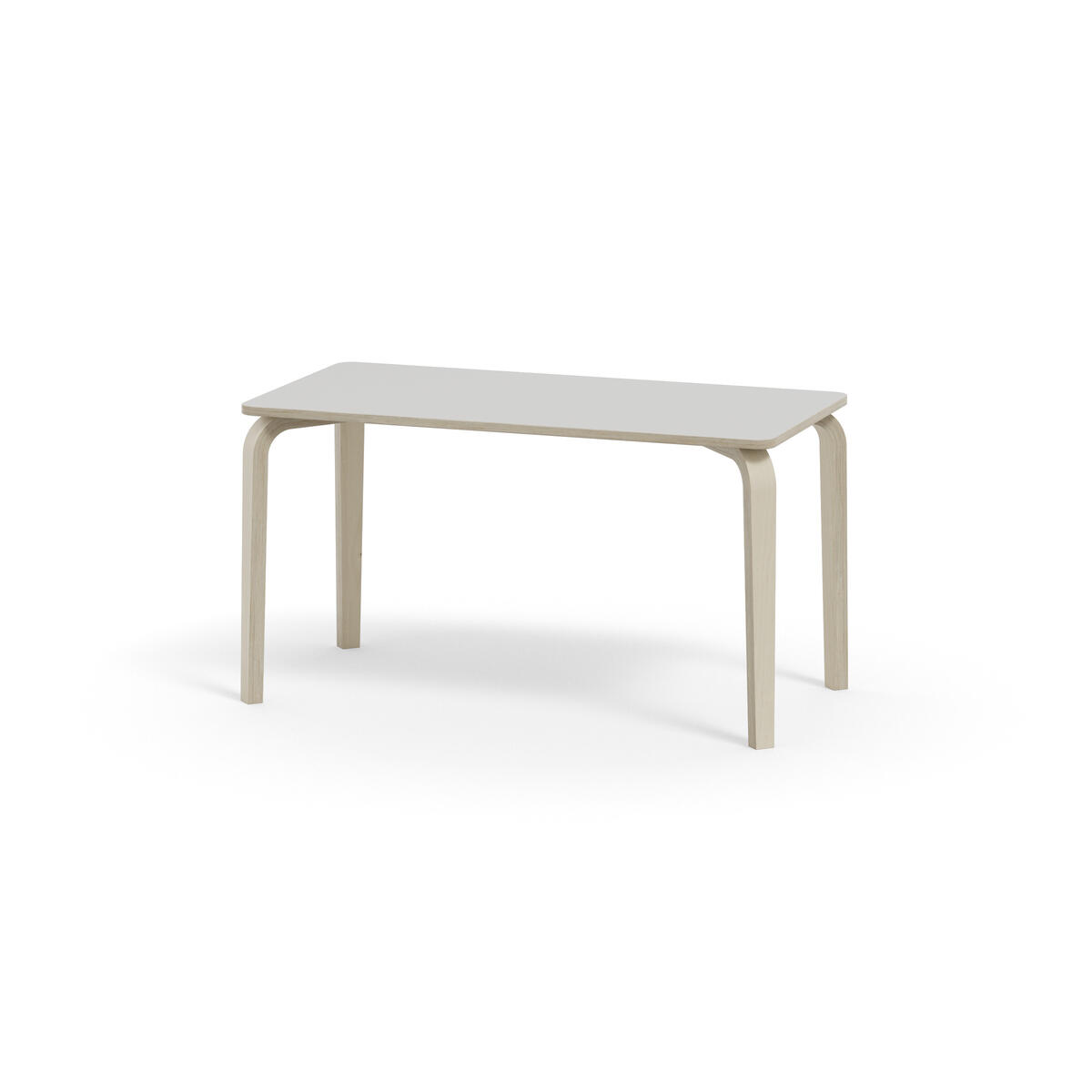 Bordserien Arcus har et praktisk design uden sarg, hvilket giver mere plads til benene. Overfladen er beklædt med laminat. Hjørneradius på 40 mm. Formspændte bordben i hvidpigmenteret birkekrydsfiner med let tilspidset form.