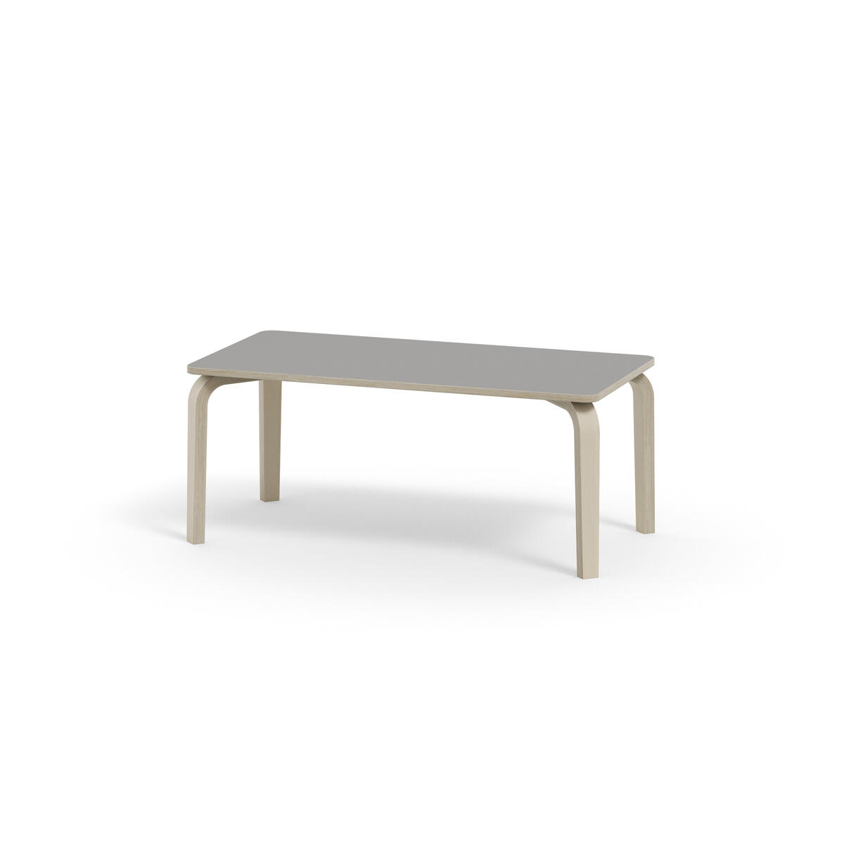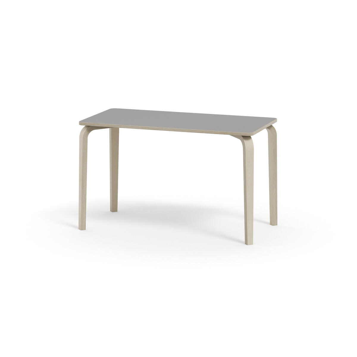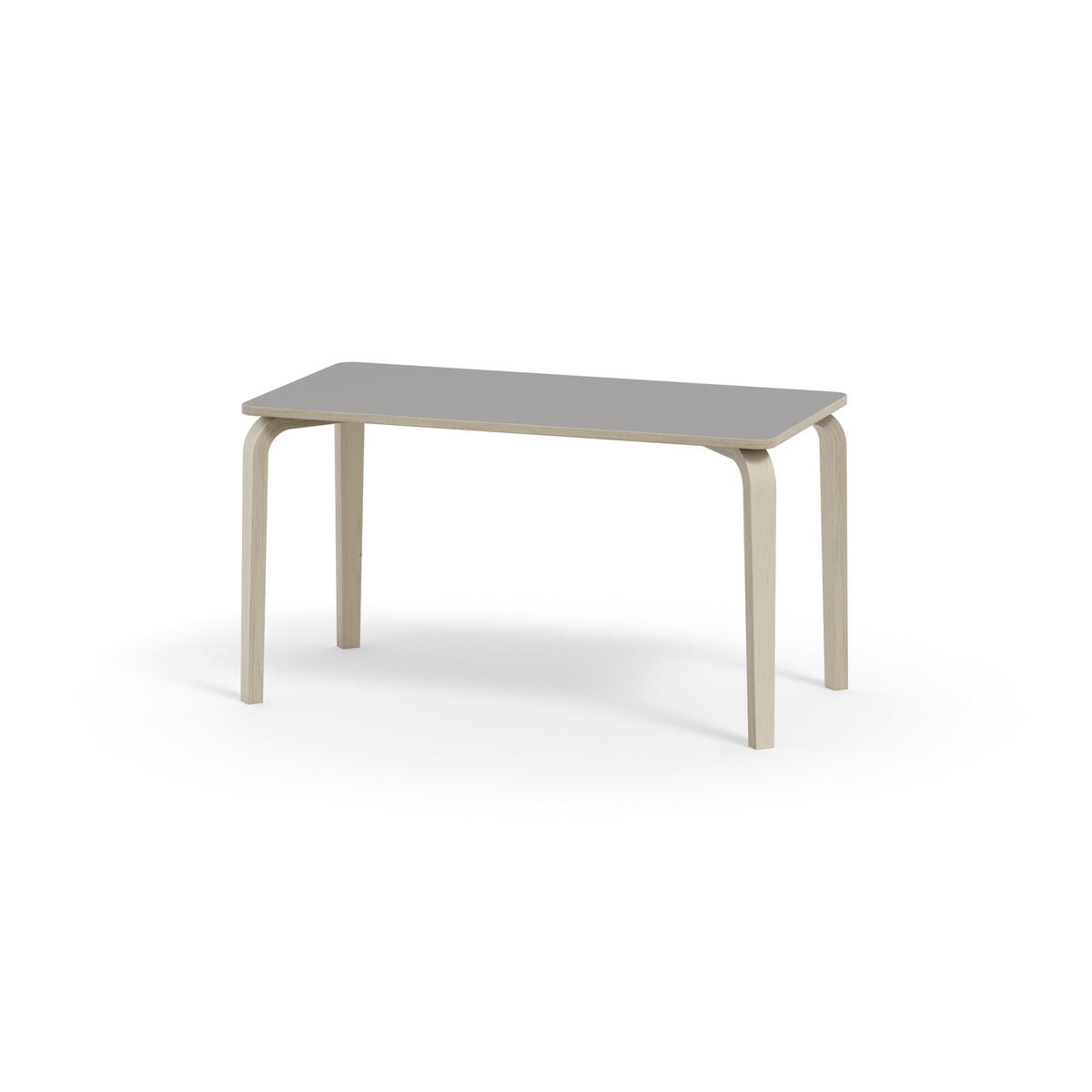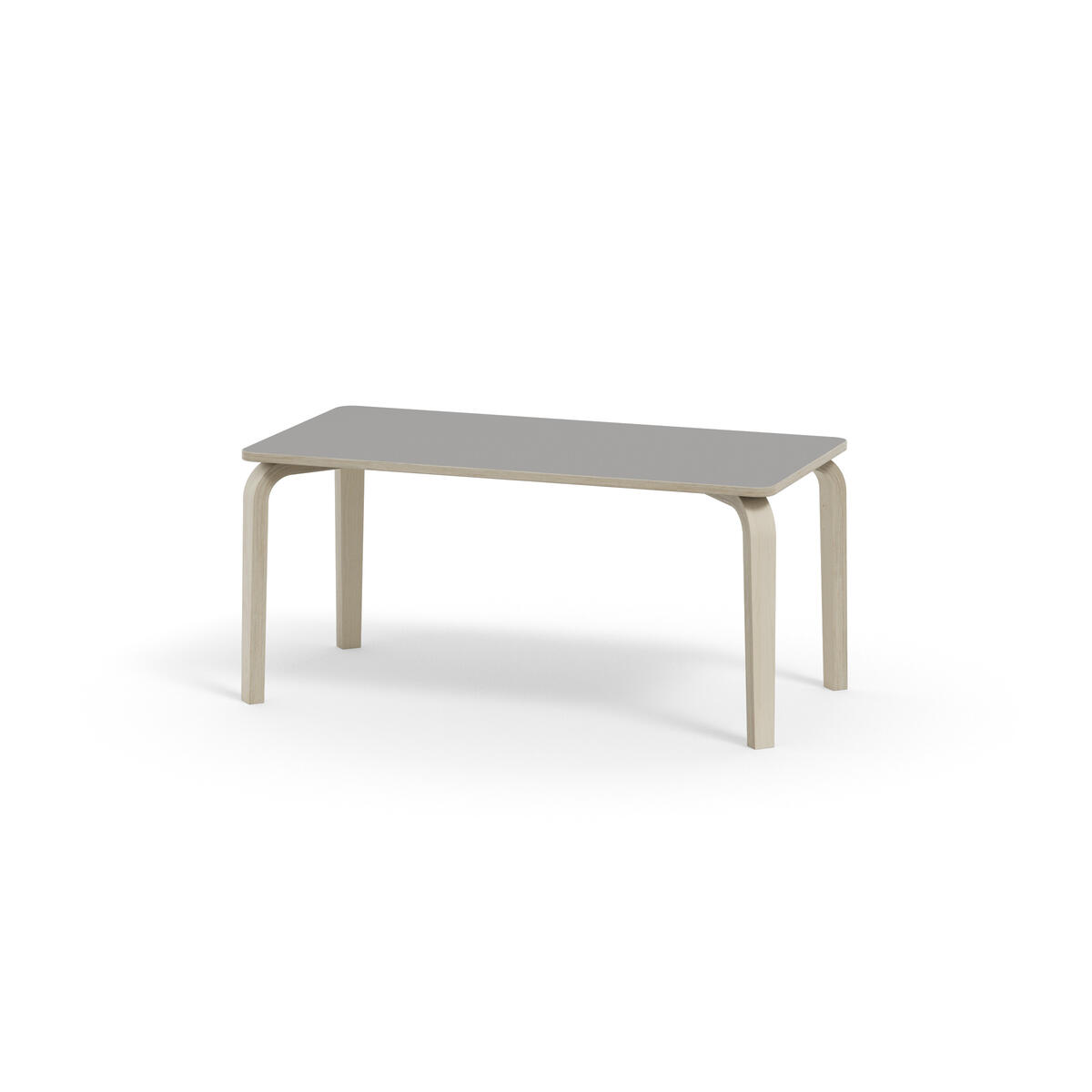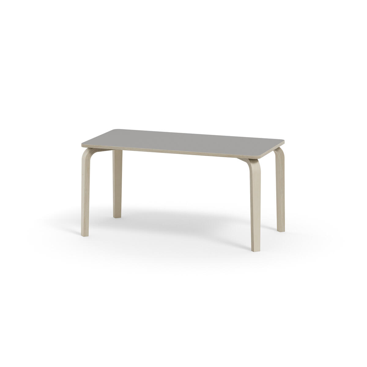 Bordserien Arcus har et praktisk design uden sarg, hvilket giver mere plads til benene. Overfladen er beklædt med laminat. Hjørneradius på 40 mm. Formspændte bordben i hvidpigmenteret birkekrydsfiner med let tilspidset form.