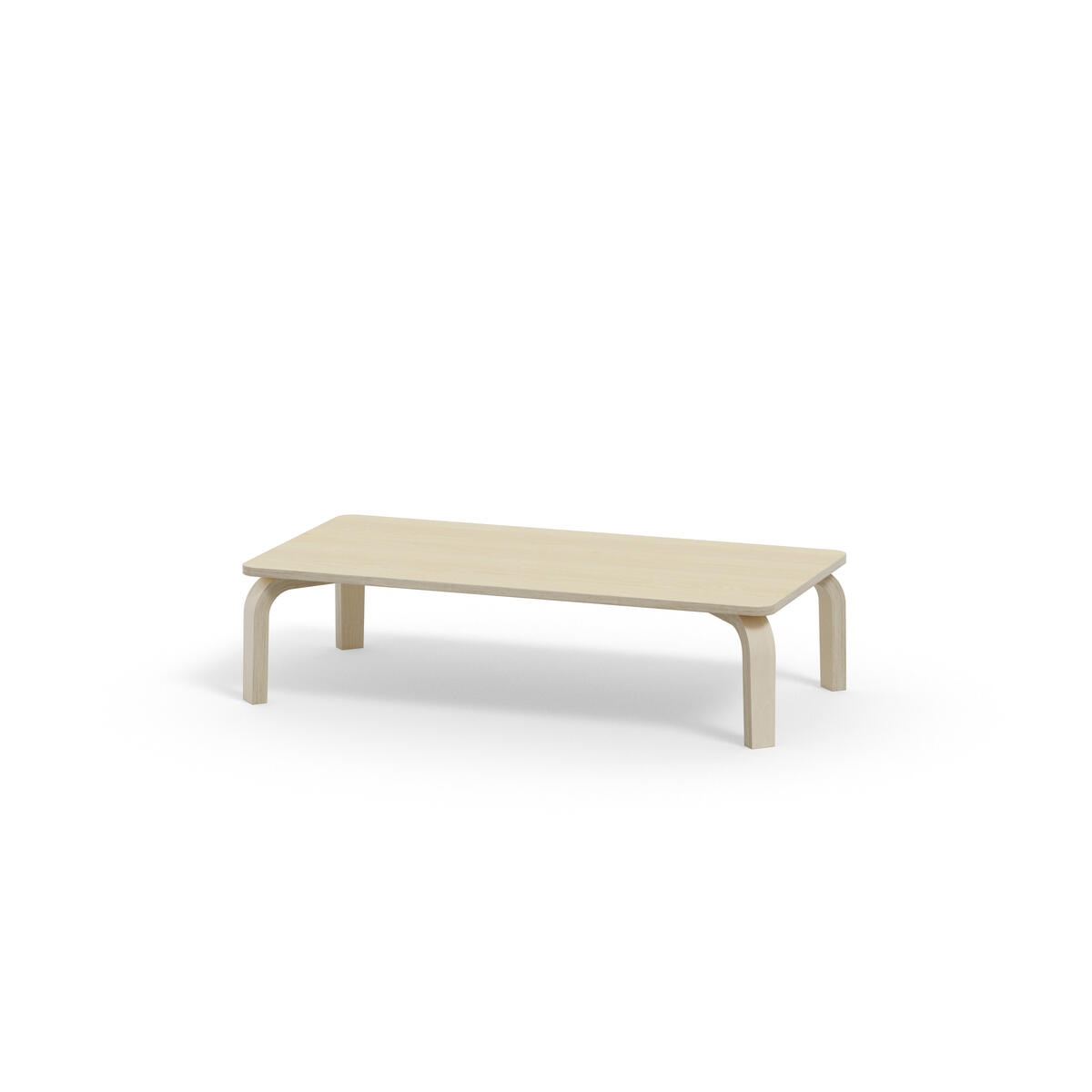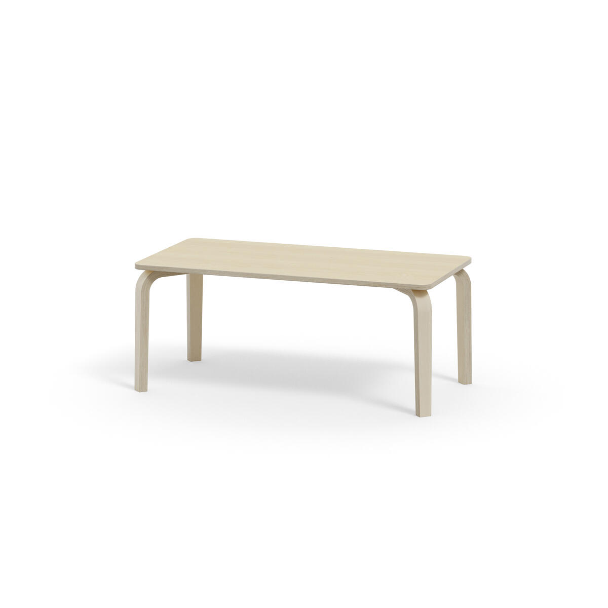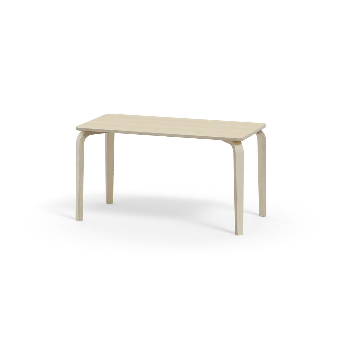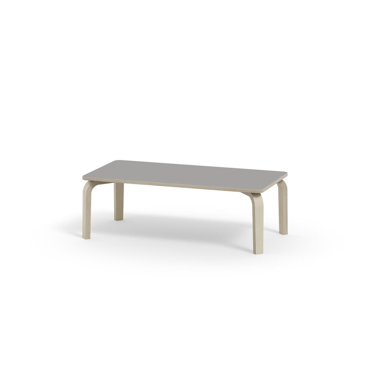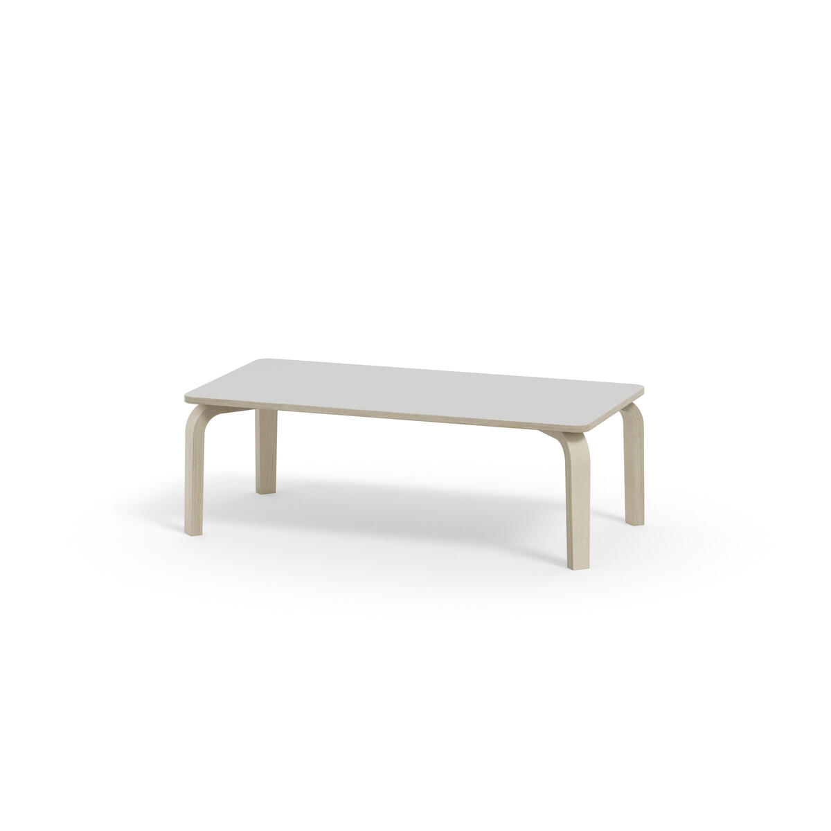 Bordserien Arcus har et praktisk design uden sarg, hvilket giver mere plads til benene. Overfladen er beklædt med laminat. Hjørneradius på 40 mm. Formspændte bordben i hvidpigmenteret birkekrydsfiner med let tilspidset form.