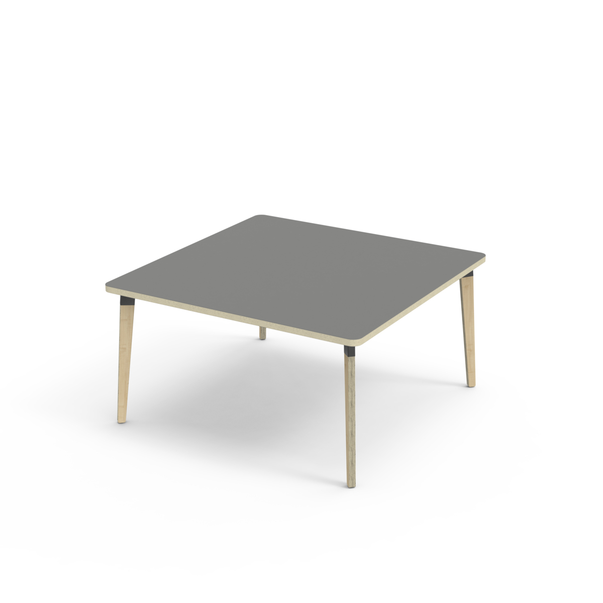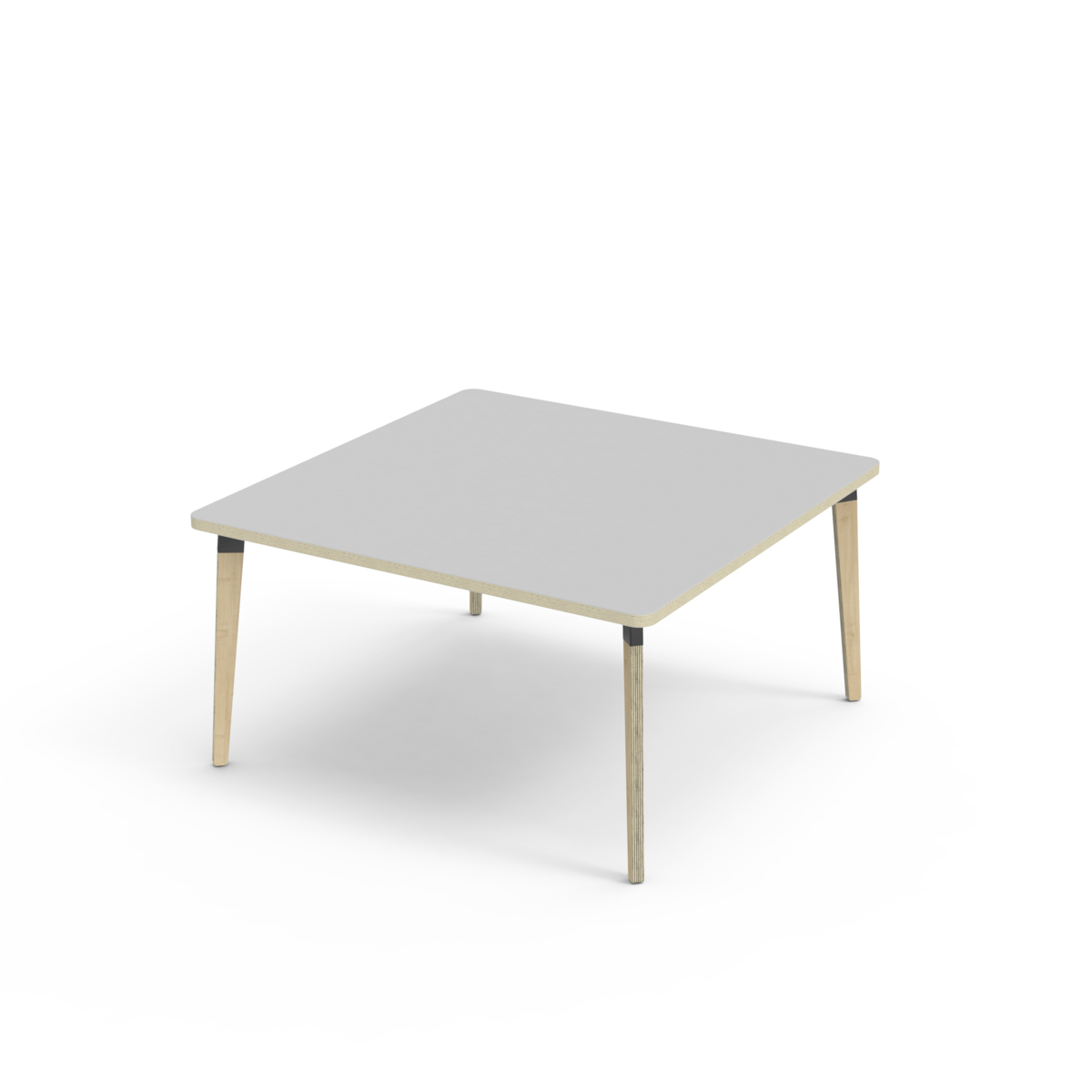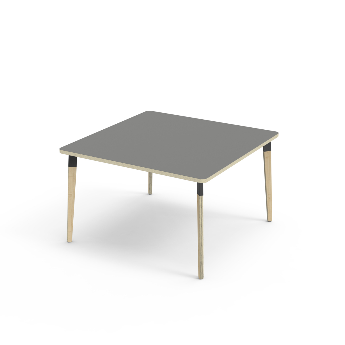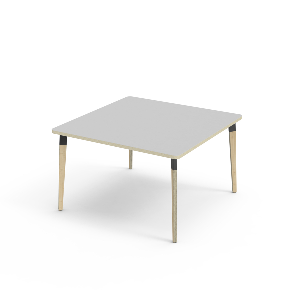 Bordpladen er lyddæmpende og belagt med højtrykslaminat, hvilket giver en holdbar og slidstærk overflade. Med en hjørneradius på 40 mm har bordet et moderne og stilrent design. De rektangulære ben er lavet af klarlakeret birkefiner og monteret i robuste sorte manchetter, som sikrer både stabilitet og holdbarhed. Benene er let vinklet ud mod hjørnerne af bordpladen, hvilket giver et elegant udtryk. Samlingen er nem og problemfri – du skal blot fastgøre metaldelene i de forberedte monteringspunkter på bordpladen.