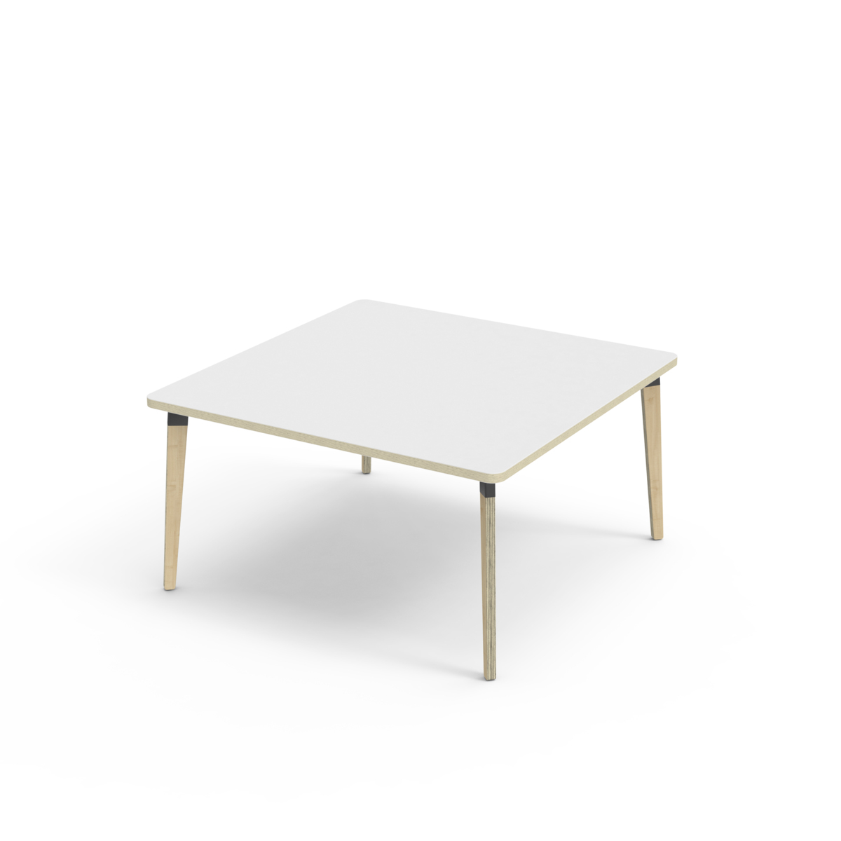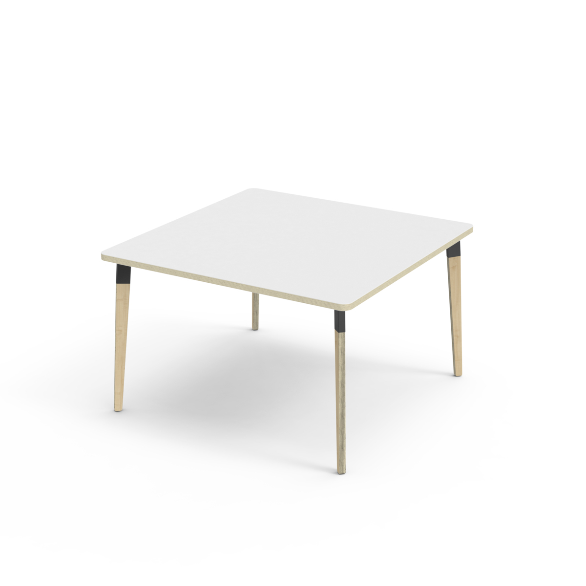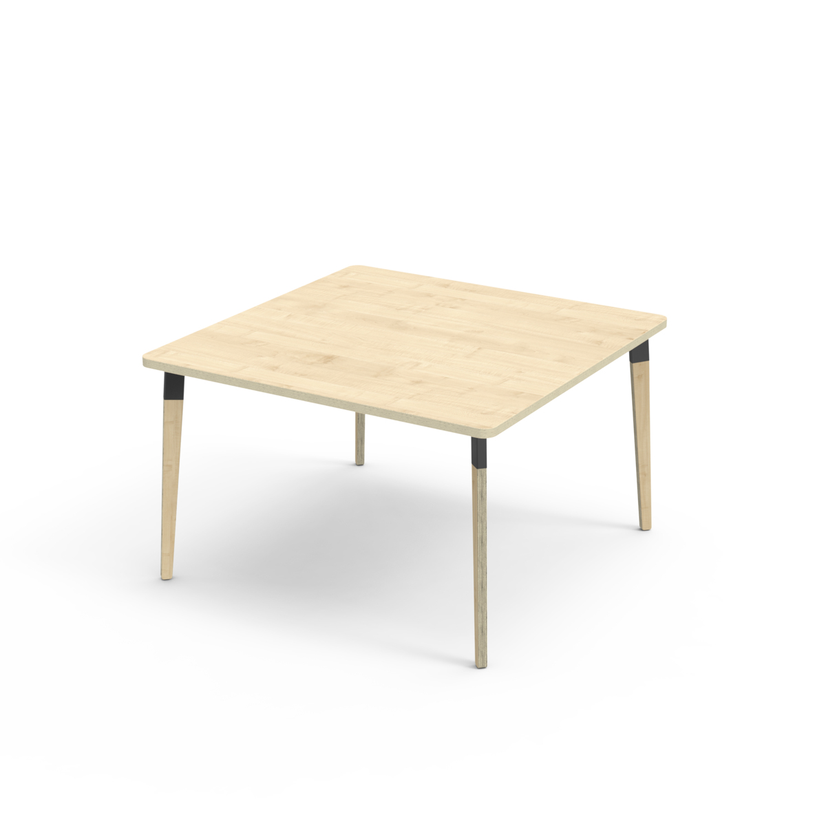 Bordpladen er lyddæmpende og belagt med højtrykslaminat, hvilket giver en holdbar og slidstærk overflade. Med en hjørneradius på 40 mm har bordet et moderne og stilrent design. De rektangulære ben er lavet af klarlakeret birkefiner og monteret i robuste sorte manchetter, som sikrer både stabilitet og holdbarhed. Benene er let vinklet ud mod hjørnerne af bordpladen, hvilket giver et elegant udtryk. Samlingen er nem og problemfri – du skal blot fastgøre metaldelene i de forberedte monteringspunkter på bordpladen.