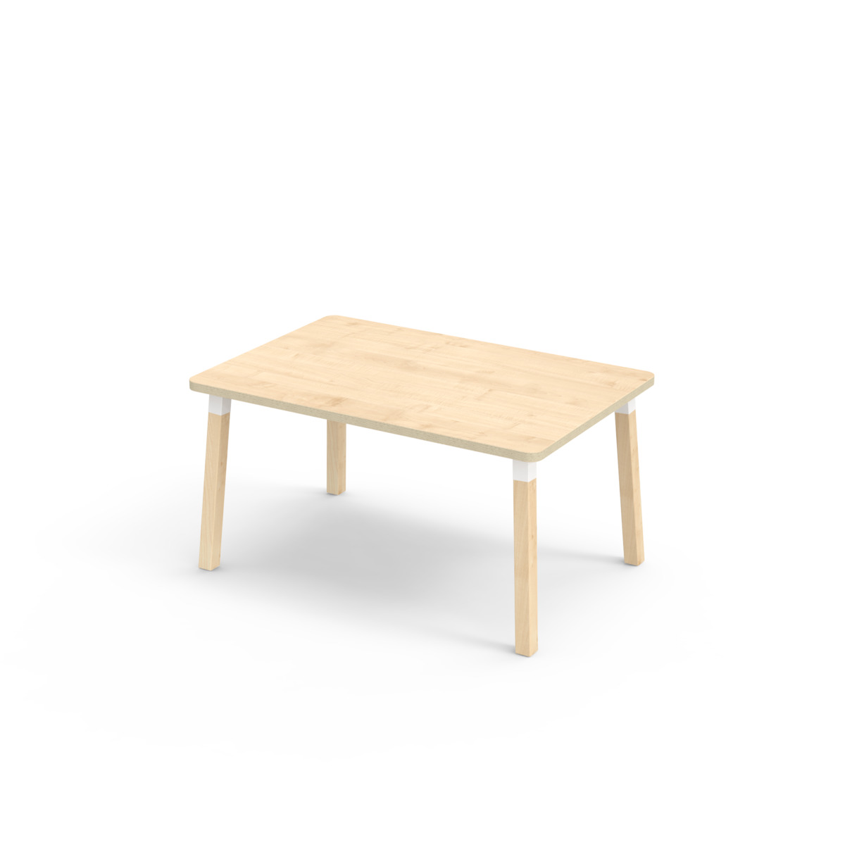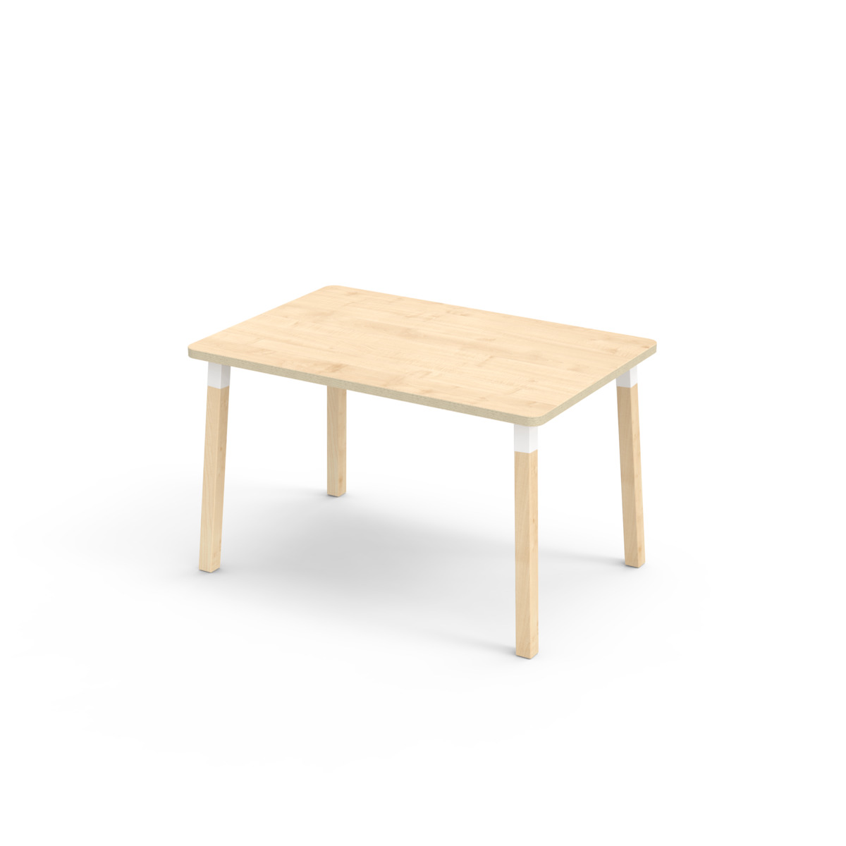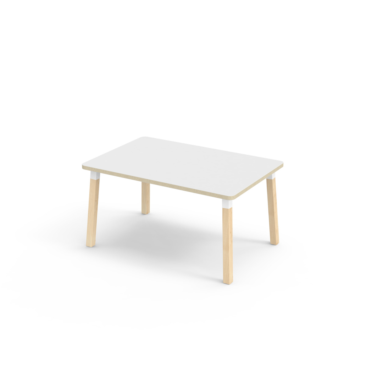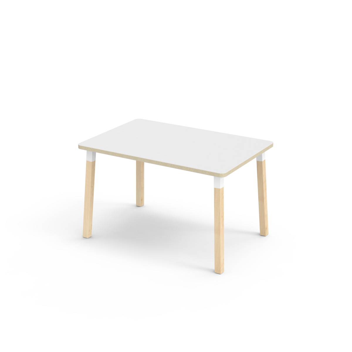 Bordplade belagt med laminat. Med en hjørneradius på 40 mm får bordet et moderne og stilrent design. Benene er fremstillet af klarlakeret massiv birk og monteret i en robust hvid manchet. Denne konstruktion sikre både stabilitet og holdbarhed. Benene er let vinklet ud mod bordpladens hjørner, hvilket giver bordet et unikt og æstetisk udseende. Monteringen er enkel og let – du skal blot fastgøre metaldelene i de forberedte monteringspunkter i bordpladen.