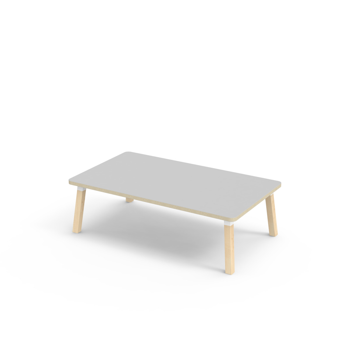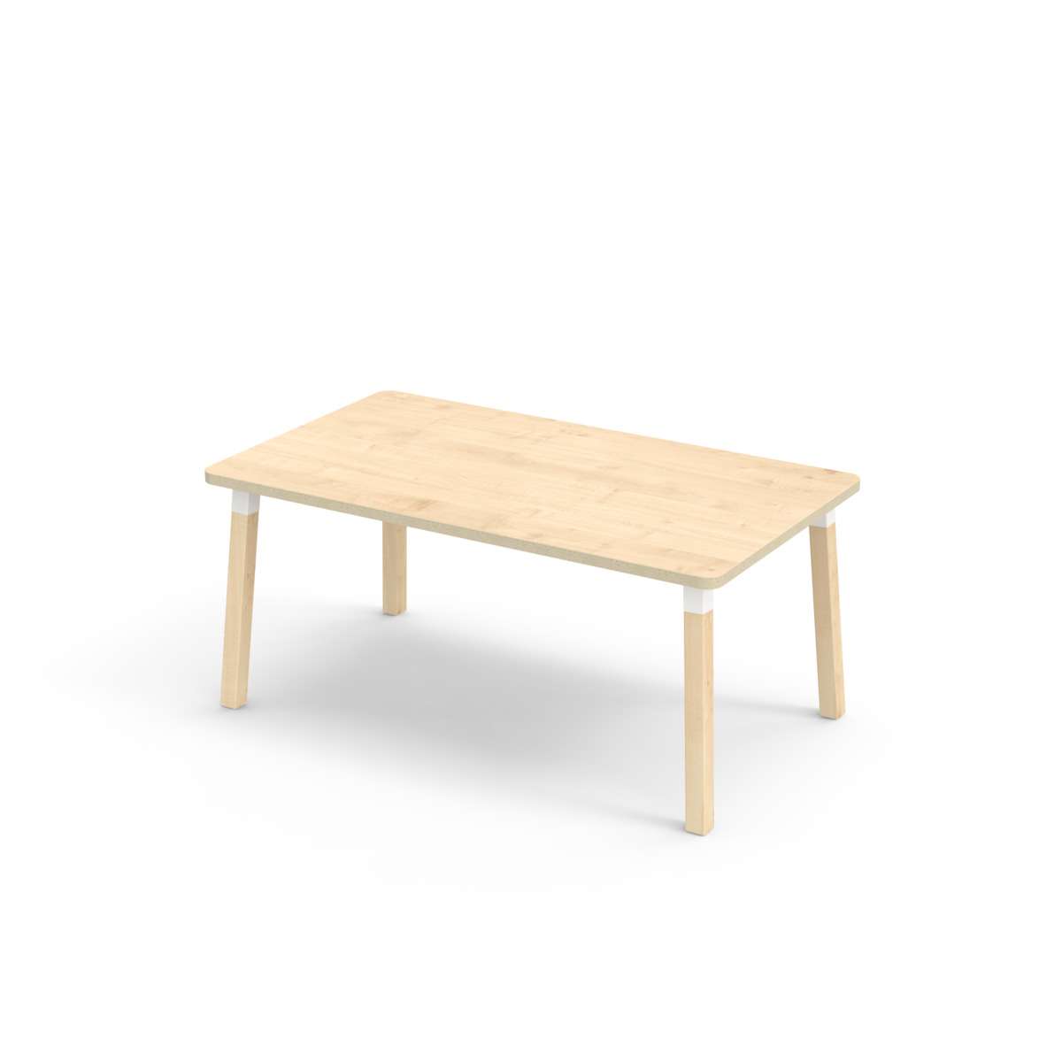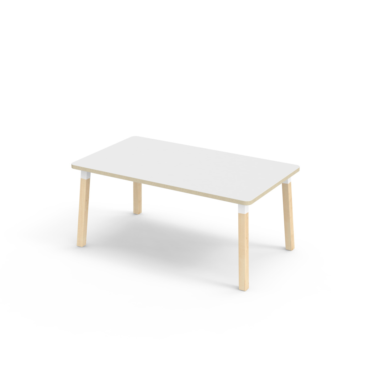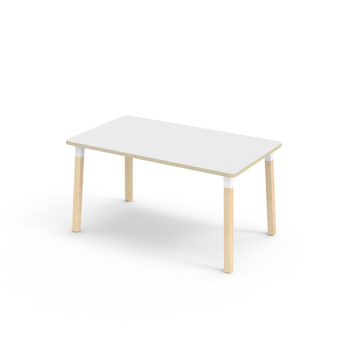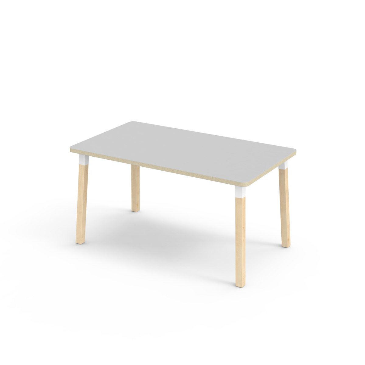Bordplade belagt med laminat. Med en hjørneradius på 40 mm får bordet et moderne og stilrent design. Benene er fremstillet af klarlakeret massiv birk og monteret i en robust hvid manchet. Denne konstruktion sikre både stabilitet og holdbarhed. Benene er let vinklet ud mod bordpladens hjørner, hvilket giver bordet et unikt og æstetisk udseende. Monteringen er enkel og let – du skal blot fastgøre metaldelene i de forberedte monteringspunkter i bordpladen.