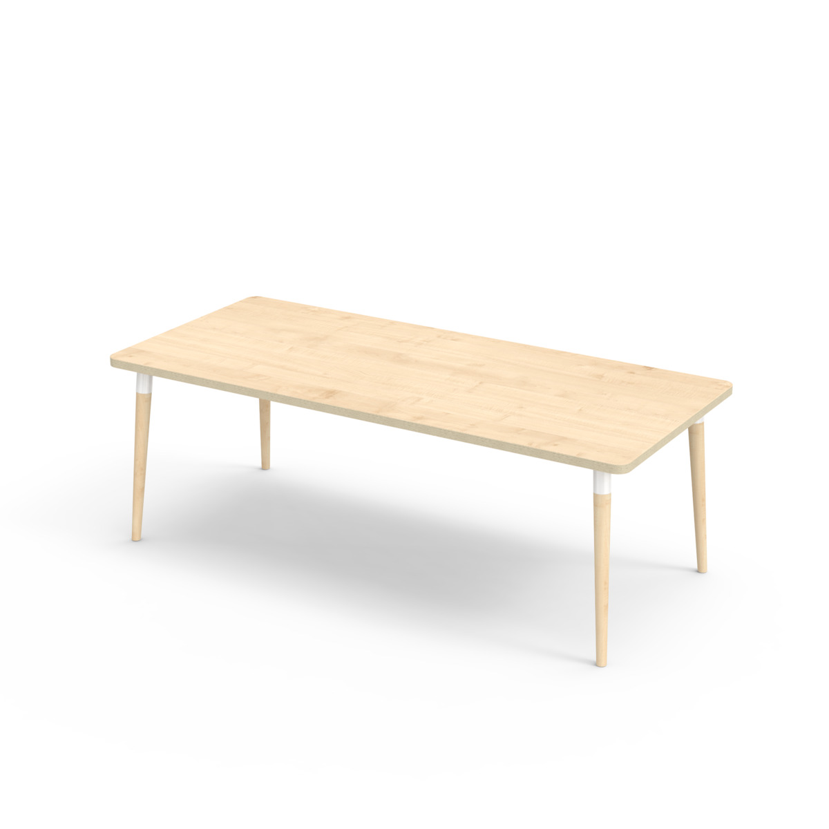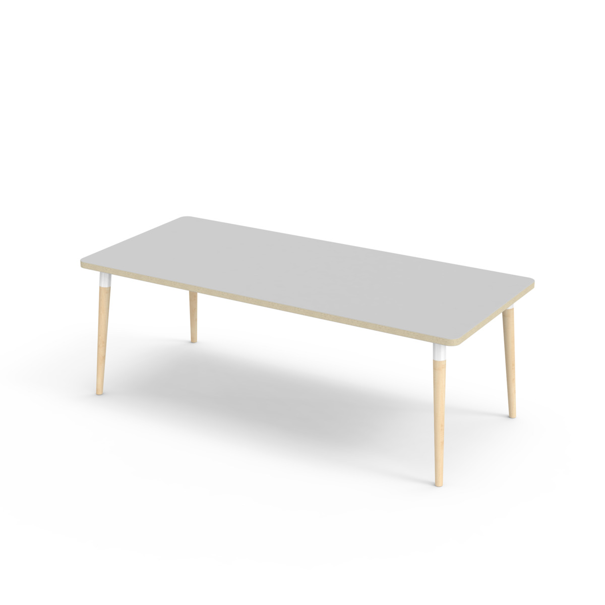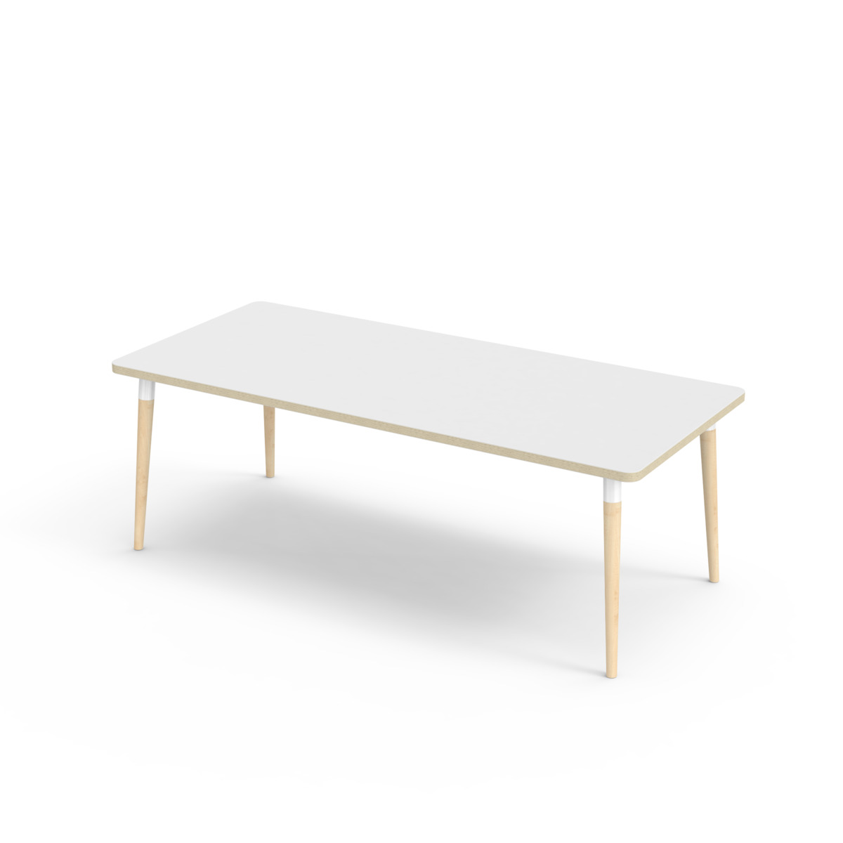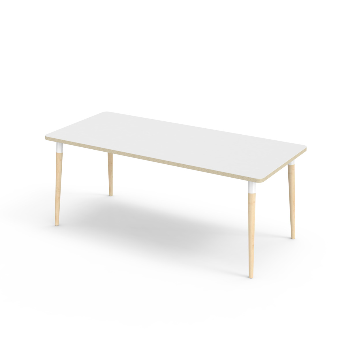 Bordplade belagt med laminat. Med en hjørneradius på 40 mm får bordet et moderne og stilrent design. Benene er fremstillet af klarlakeret massiv birk og monteret i en robust hvid manchet. Denne konstruktion sikre både stabilitet og holdbarhed. Benene er let vinklet ud mod bordpladens hjørner, hvilket giver bordet et unikt og æstetisk udseende. Monteringen er enkel og let – du skal blot fastgøre metaldelene i de forberedte monteringspunkter i bordpladen.
