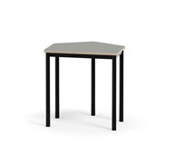 Sekskantet bordplade belagt med støjreducerende højtrykslaminat og lysabsorberende på undersiden. Justerbare fødder til tilpasning til ujævne overflader. Understel i sort RAL 9005.