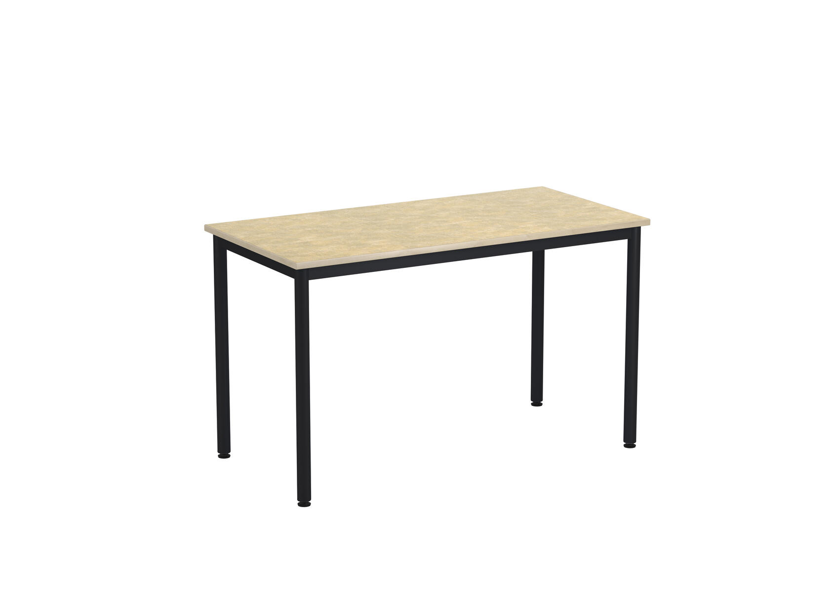 Lyddæmpende bordplade i slidstærkt højtrykslaminat med lydabsorbent på undersiden. Justerbare stilleskruer sikrer, at bordet står stabilt selv på ujævne overflader. Understel i sort RAL 9005.