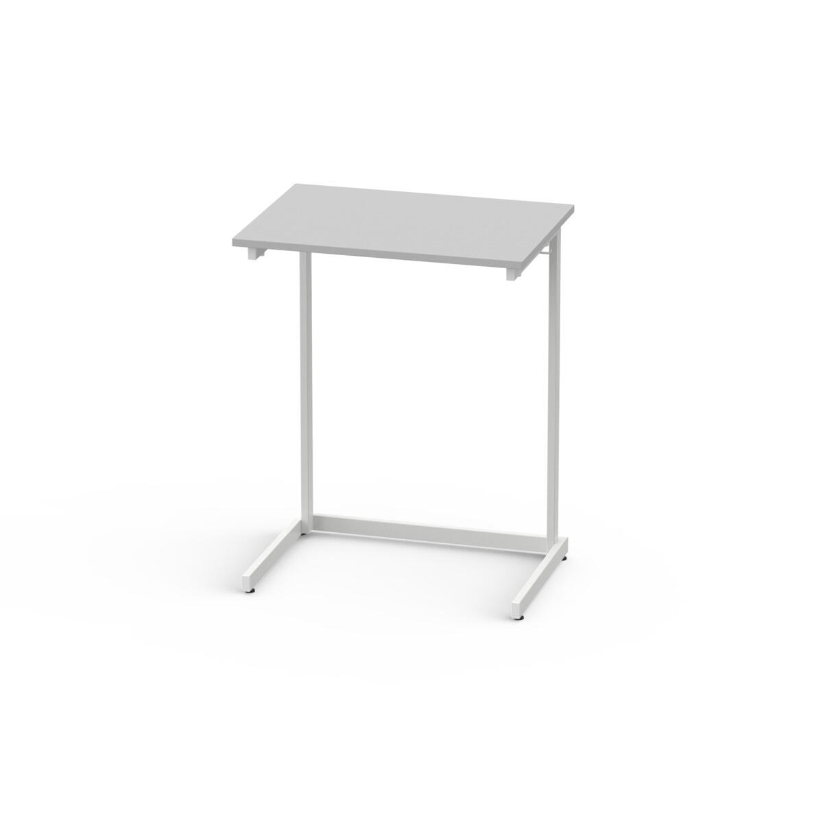 Lex bord med L-formet understel, der gør det muligt at stable bordene (maks. 6 stk.). Udstyret med taskekrog. Helsvejst understel i hvid, RAL 9003. Bordplade i højtrykslaminat. Fire justerbare fødder. Som tilvalg kan skuffeskinner monteres under bordpladen. Opbevaringsskuffe kan tilkøbes under varenr. 23416.