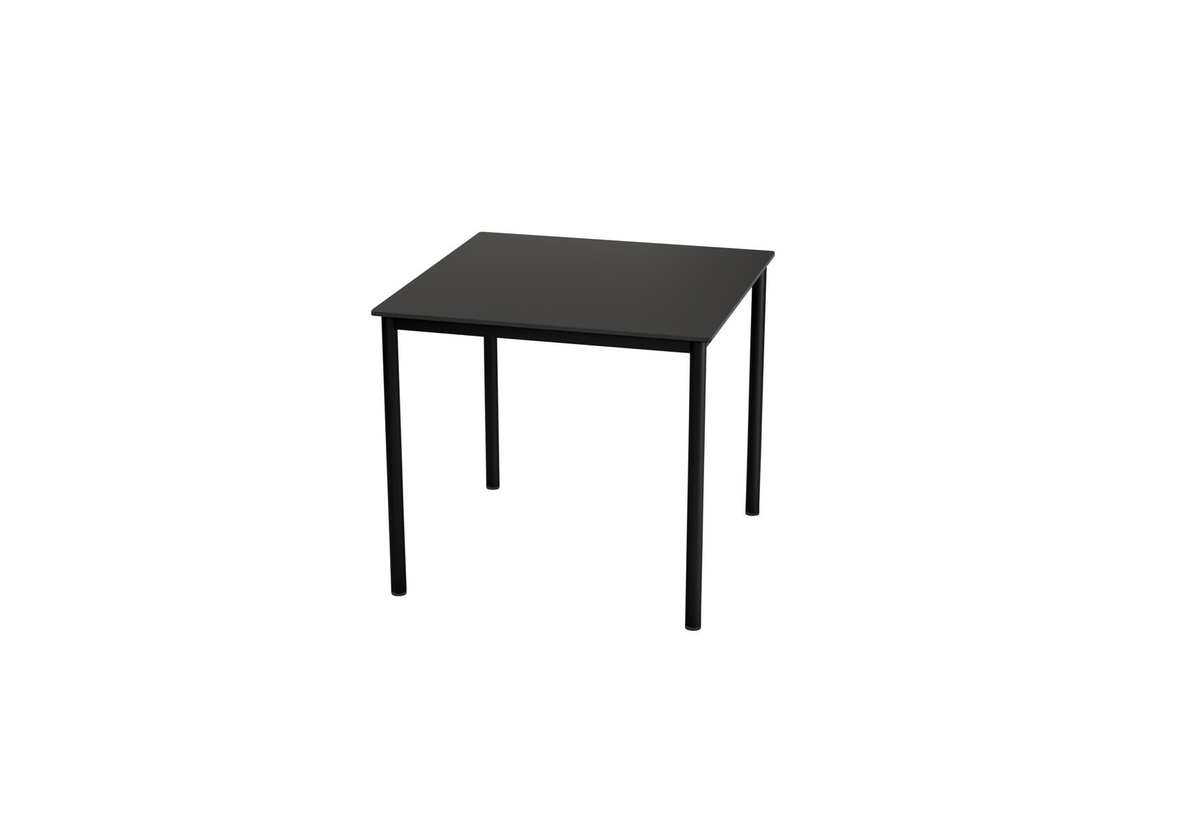 Bordplade i 12 mm kompaktlaminat. Vælg mellem 2 ben med stilleskruer og 2 ben med hjul, eller kun ben med plastprop. Fuldsvejset stel 9005. Mål: 80x80xH72 cm. Leveres færdigmonteret.