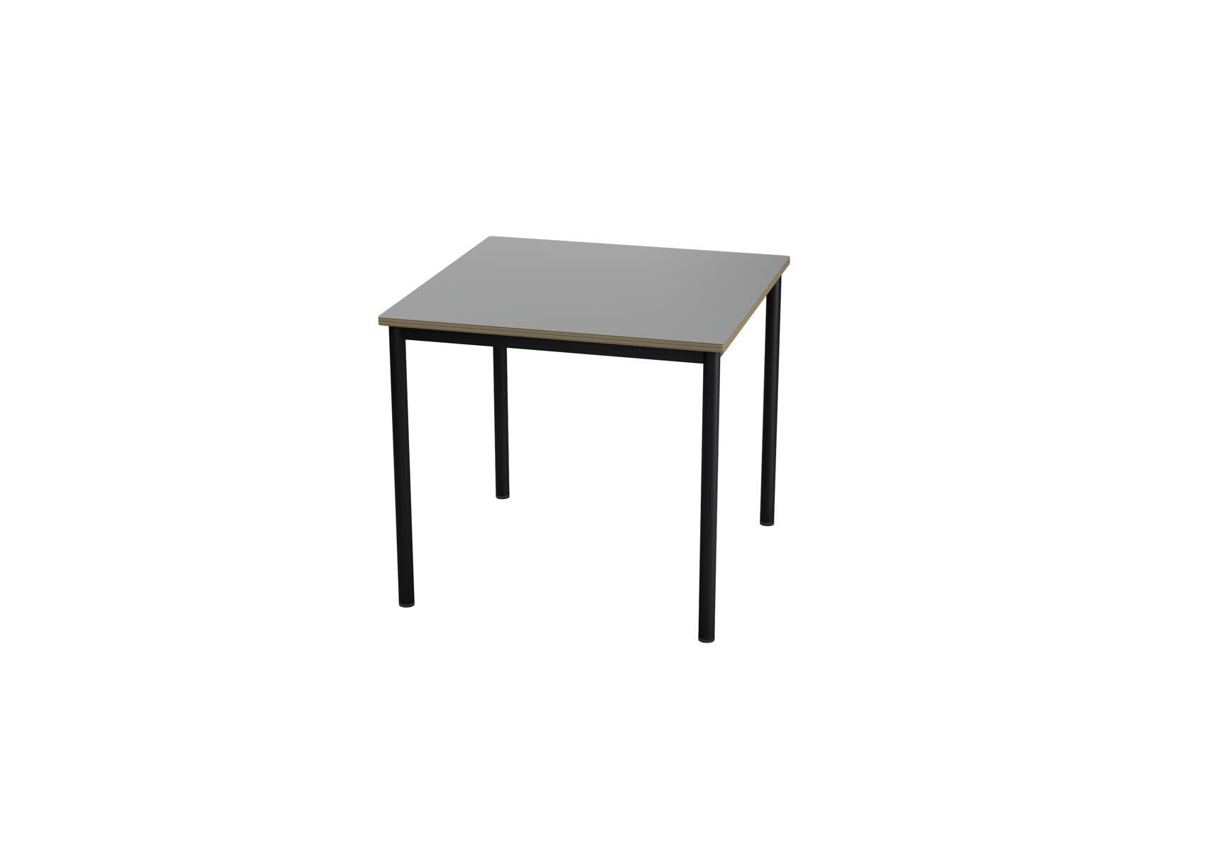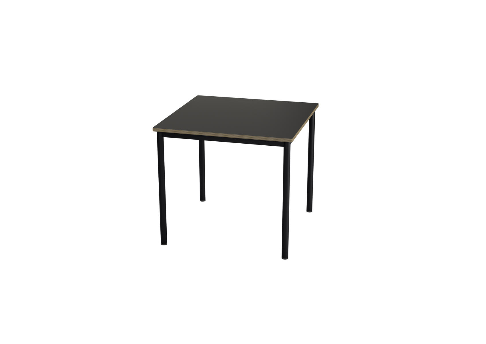 Bordplade i 20 mm krydsfinér med højtrykslaminat. Vælg mellem 2 ben med stilleskruer og 2 ben med hjul, eller kun ben med plastprop. Fuldsvejset stel 9005. Mål: 80x80xH90 cm.