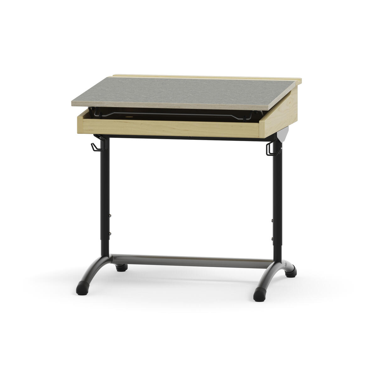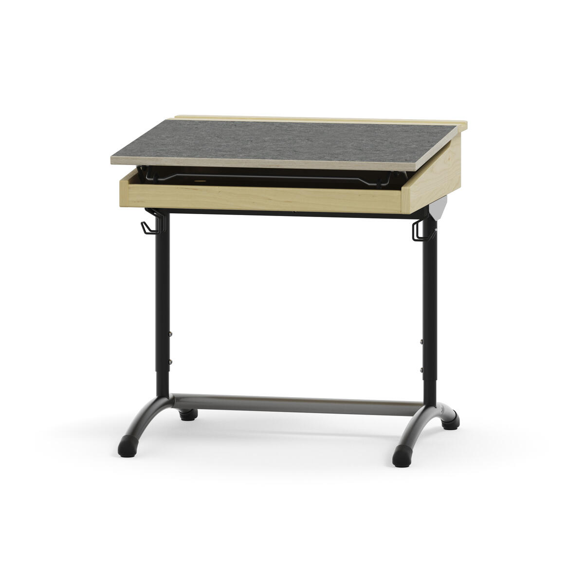 Skolepult med opbevaringsrum på 30 liter og låg, der kan vinkles 6 grader. Svejset understel, som giver en pult, der er ekstra stabil og kræver mindre vedligeholdelse. Indersiden af låget er beklædt med laminat, som er nemt at holde rent. Justeringsskruer på det forreste benpar og dobbelt taskekroge. Mål: B65xD58 cm. Mål på bordplade: B65xD46 cm. Arbejdshøjden kan indstilles til de faste højder 65, 70, 75, 80, 85, 90 og 95 cm. Blyantrende og ramme til opbevaringsrum i birk. Bordplade i højtrykslaminat. Sortlakeret understel i RAL 9005.