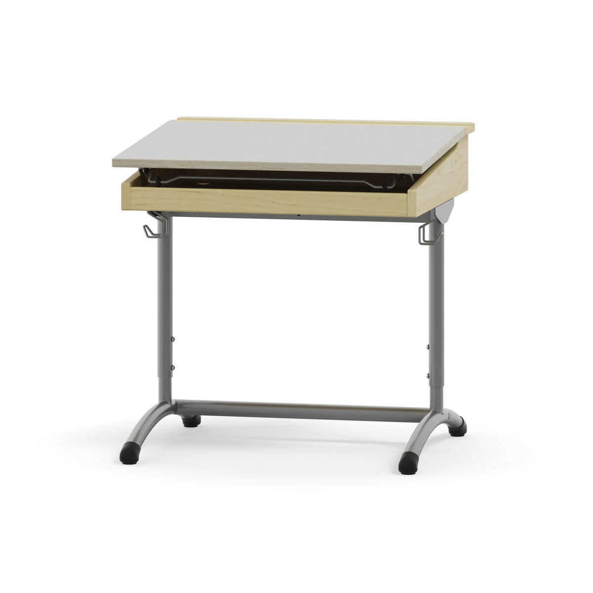 Skolepult med opbevaringsrum på 30 liter og låg, der kan vinkles 6 grader. Svejset understel, som giver en pult, der er ekstra stabil og kræver mindre vedligeholdelse. Indersiden af låget er beklædt med laminat, som er nemt at holde rent. Justeringsskruer på det forreste benpar og dobbelt taskekroge. Mål: B65xD58 cm. Mål på bordplade: B65xD46 cm. Arbejdshøjden kan indstilles til de faste højder 65, 70, 75, 80, 85, 90 og 95 cm. Blyantrende og ramme til opbevaringsrum i birk. Bordplade i akustisk laminat. Understel lakeret i sølv, RAL 9006.