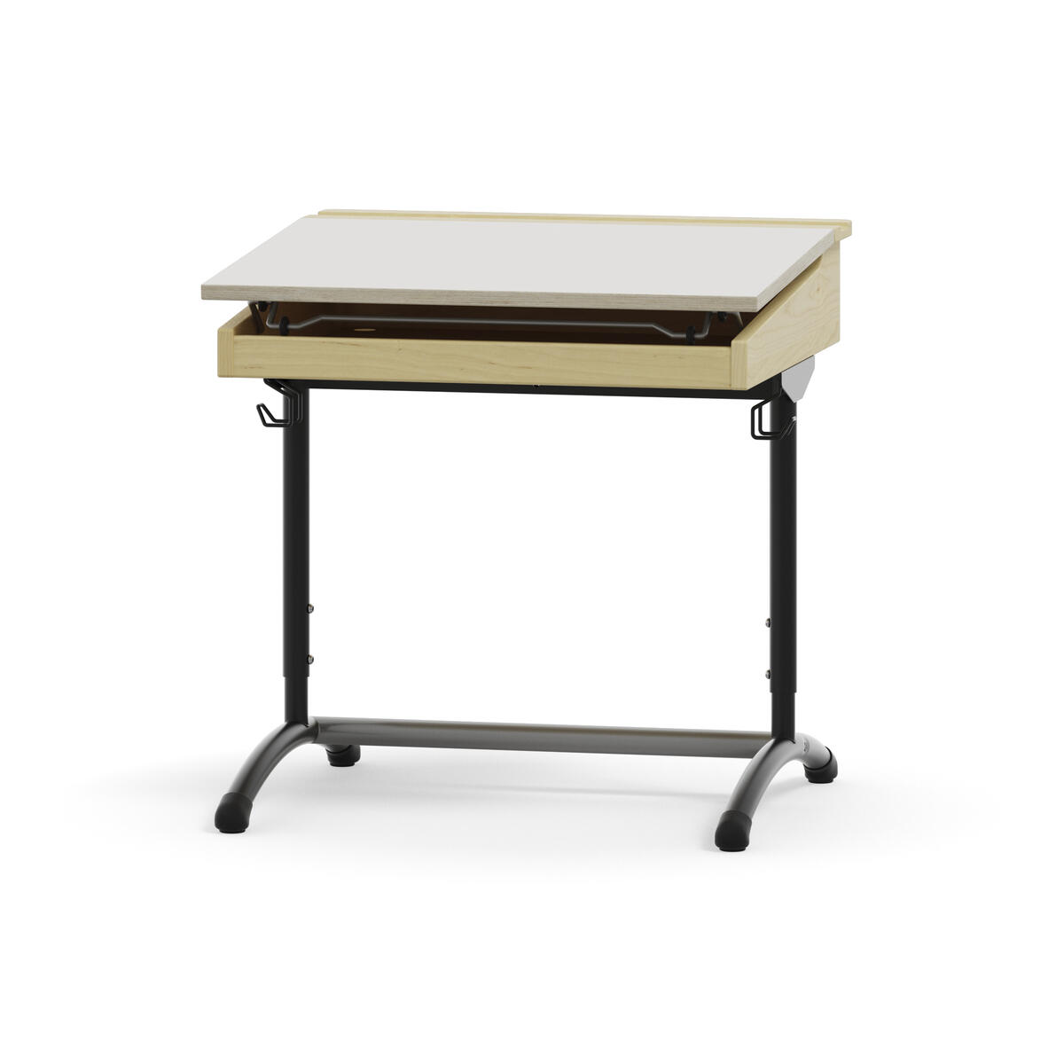 Skolepult med opbevaringsrum på 30 liter og låg, der kan vinkles 6 grader. Svejset understel, som giver en pult, der er ekstra stabil og kræver mindre vedligeholdelse. Indersiden af låget er beklædt med laminat, som er nemt at holde rent. Justeringsskruer på det forreste benpar og dobbelt taskekroge. Mål: B65xD58 cm. Mål på bordplade: B65xD46 cm. Arbejdshøjden kan indstilles til de faste højder 65, 70, 75, 80, 85, 90 og 95 cm. Blyantrende og ramme til opbevaringsrum i birk. Bordplade i akustisk laminat. Understel lakeret i sort, RAL 9005.