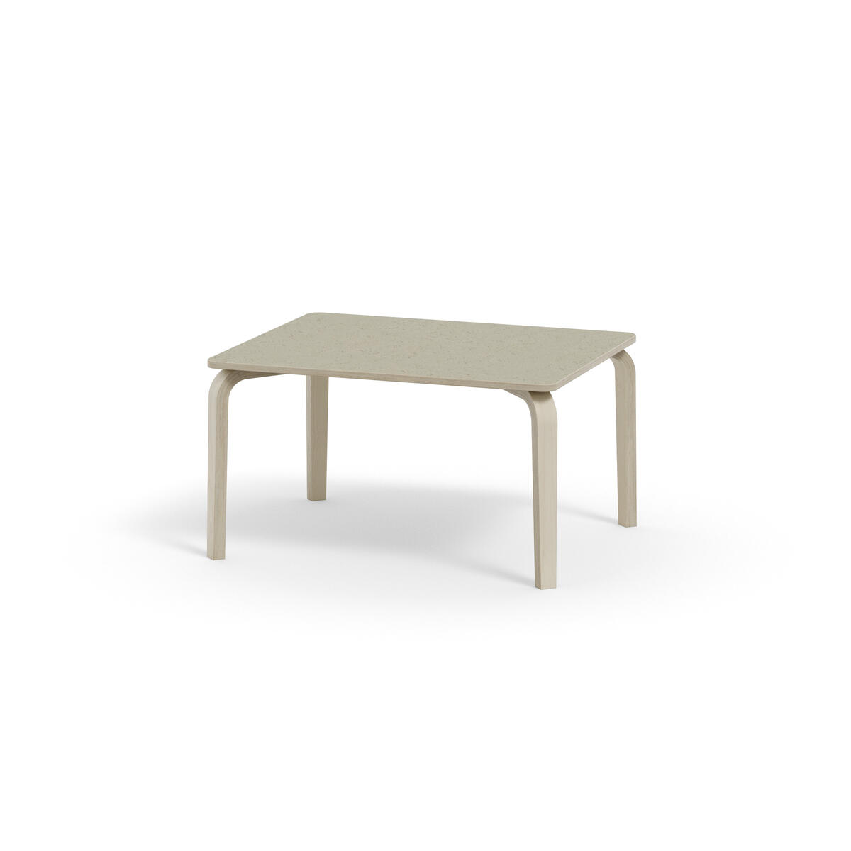 Bordserien Arcus har et praktisk design uden sarg, hvilket giver mere plads til benene. Overfladen er beklædt med linoleum. Hjørneradius på 40 mm. Formspændte bordben i hvidpigmenteret birkekrydsfiner med let tilspidset form.
