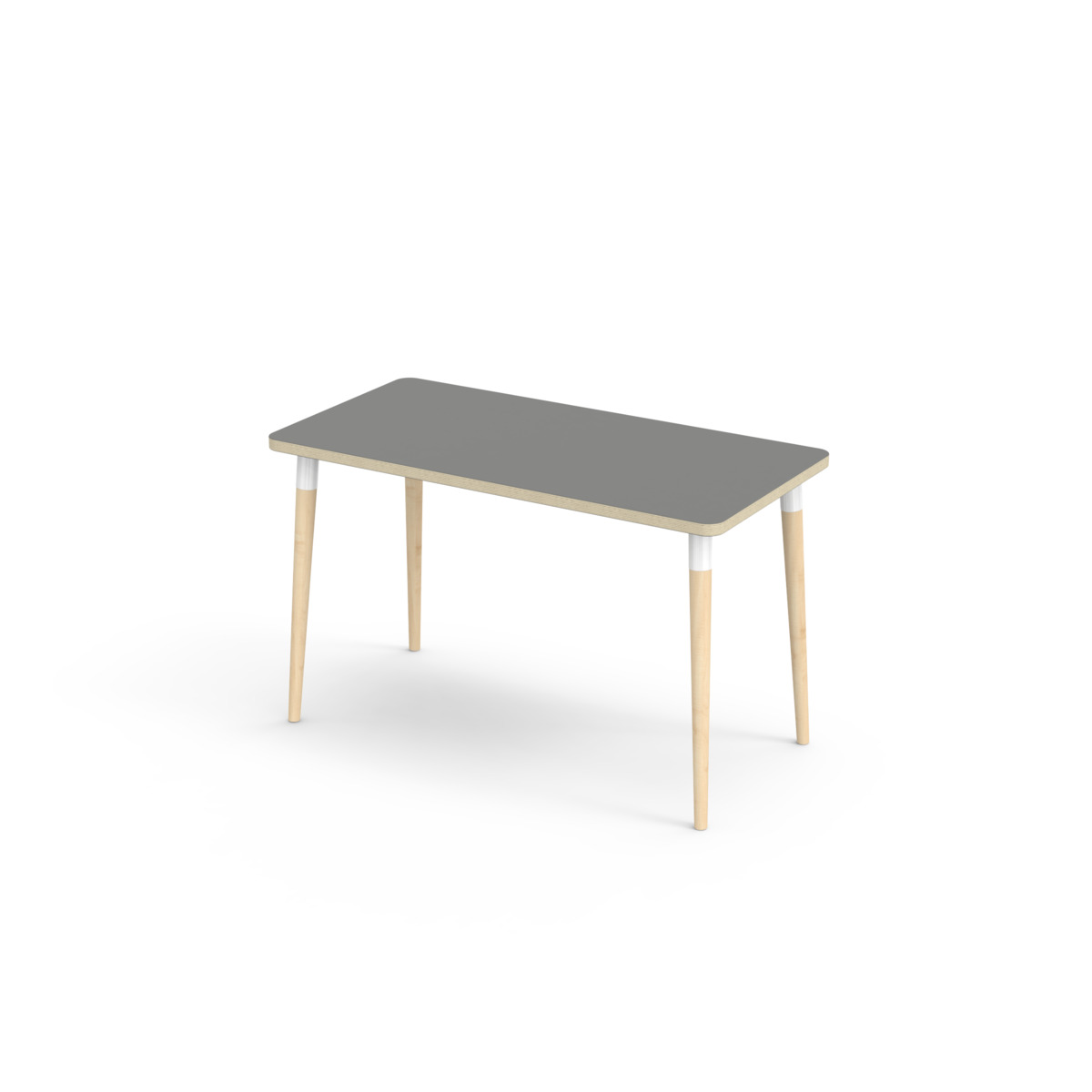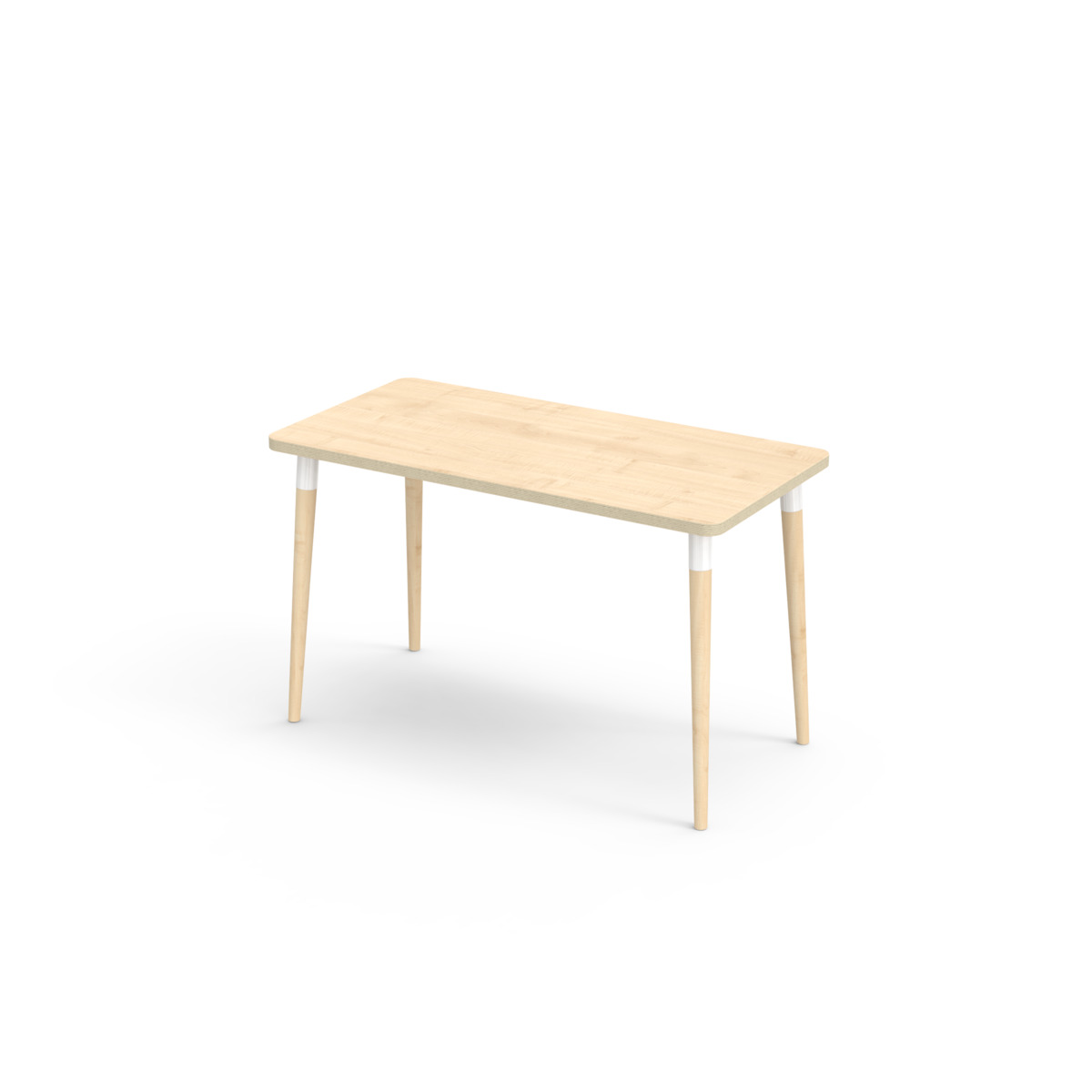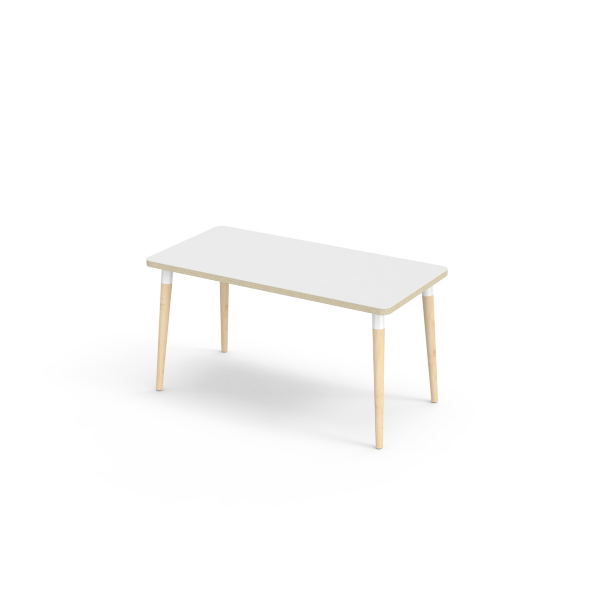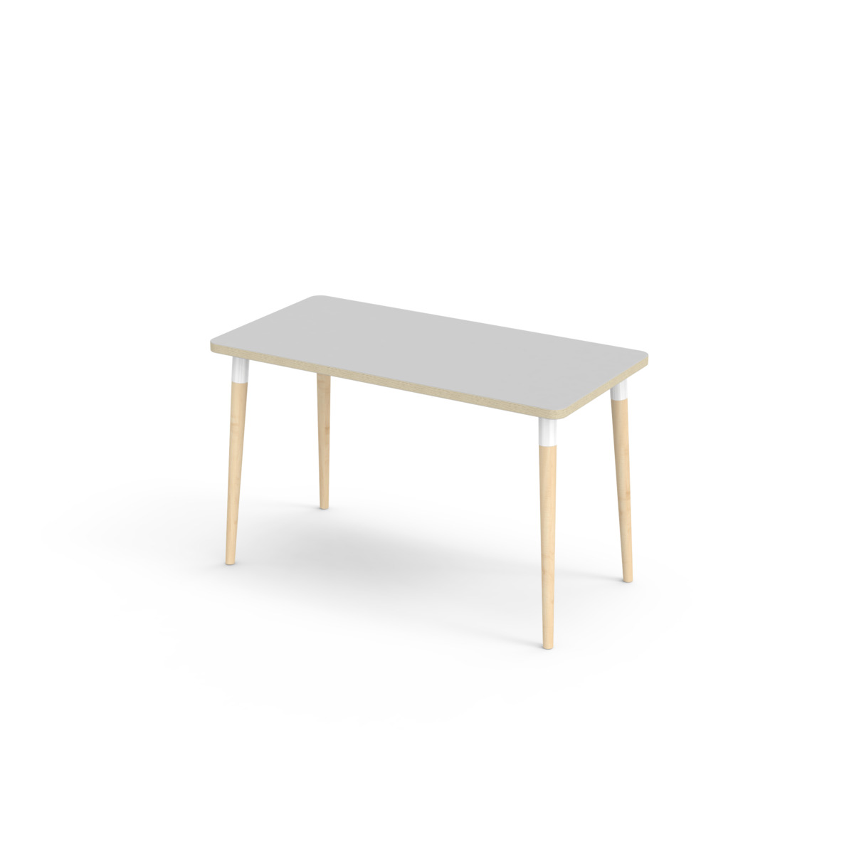 Bordplade belagt med laminat. Med en hjørneradius på 40 mm får bordet et moderne og stilrent design. Benene er fremstillet af klarlakeret massiv birk og monteret i en robust hvid manchet. Denne konstruktion sikre både stabilitet og holdbarhed. Benene er let vinklet ud mod bordpladens hjørner, hvilket giver bordet et unikt og æstetisk udseende. Monteringen er enkel og let – du skal blot fastgøre metaldelene i de forberedte monteringspunkter i bordpladen.