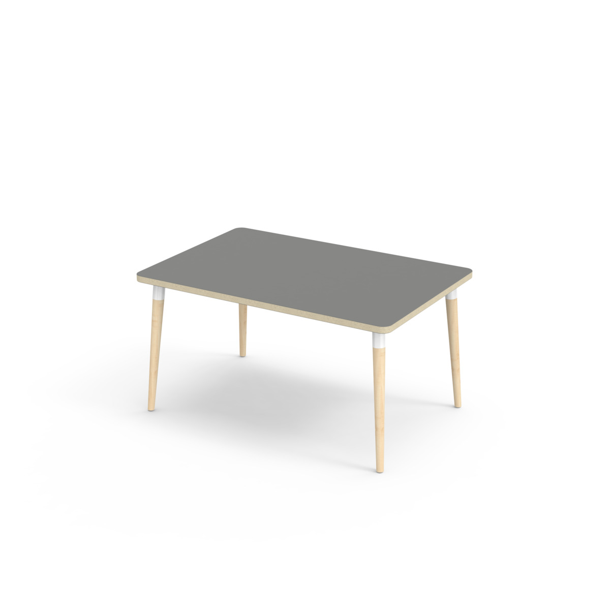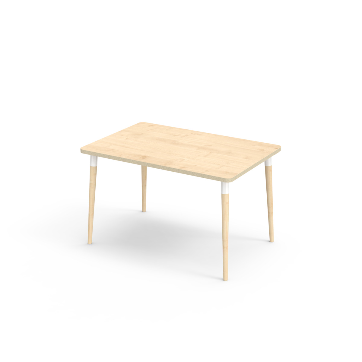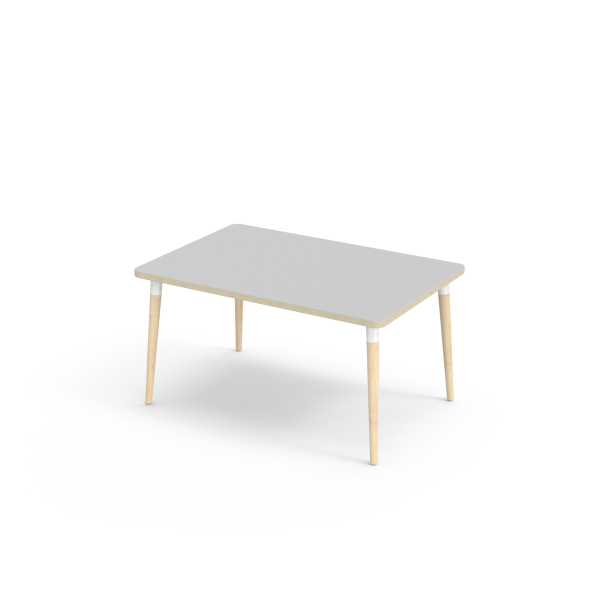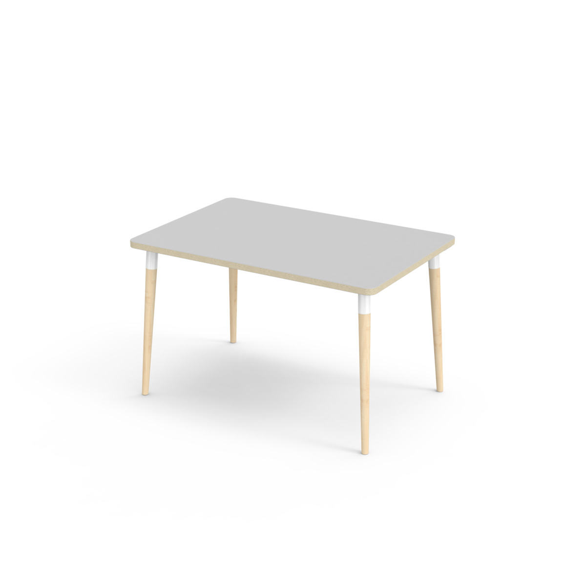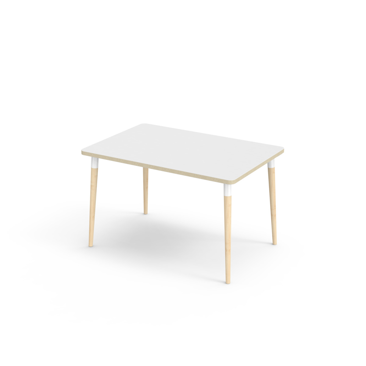 Bordplade belagt med laminat. Med en hjørneradius på 40 mm får bordet et moderne og stilrent design. Benene er fremstillet af klarlakeret massiv birk og monteret i en robust hvid manchet. Denne konstruktion sikre både stabilitet og holdbarhed. Benene er let vinklet ud mod bordpladens hjørner, hvilket giver bordet et unikt og æstetisk udseende. Monteringen er enkel og let – du skal blot fastgøre metaldelene i de forberedte monteringspunkter i bordpladen.