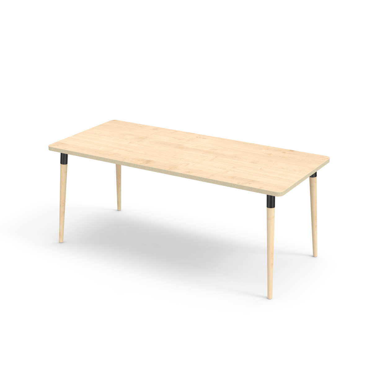 Bordplade belagt med laminat. Med en hjørneradius på 40 mm får bordet et moderne og stilrent design. Benene er fremstillet af klarlakeret massiv birk og monteret i en robust sort manchet. Denne konstruktion sikre både stabilitet og holdbarhed. Benene er let vinklet ud mod bordpladens hjørner, hvilket giver bordet et unikt og æstetisk udseende. Monteringen er enkel og let – du skal blot fastgøre metaldelene i de forberedte monteringspunkter i bordpladen.