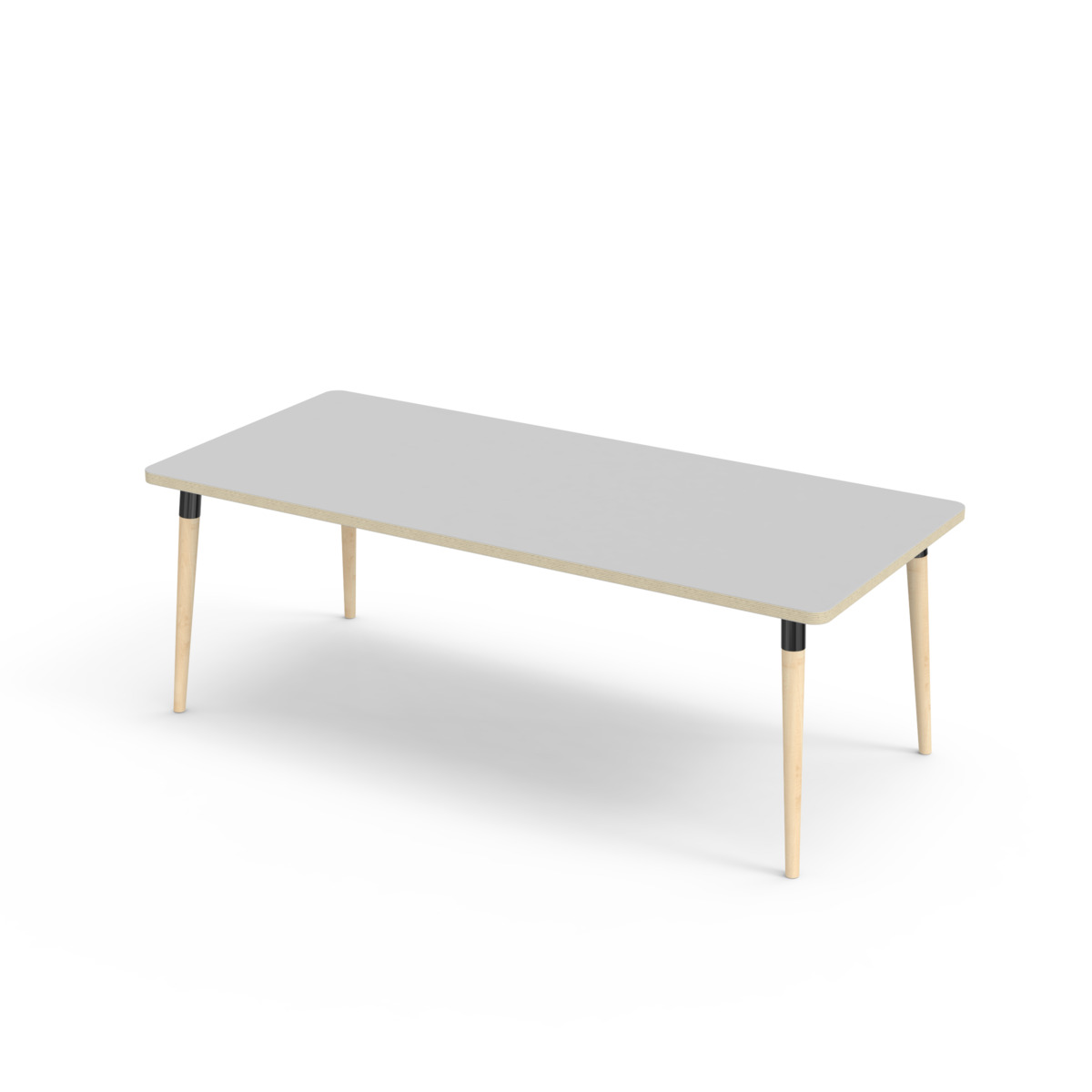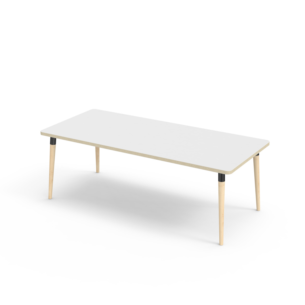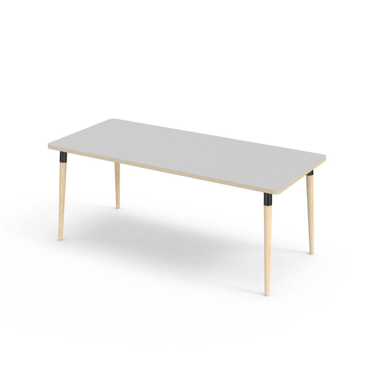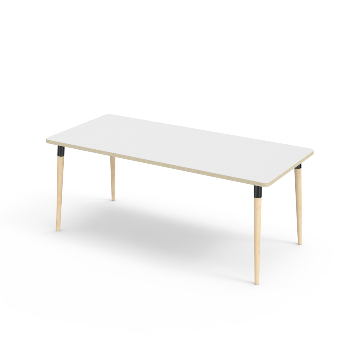 Bordplade belagt med laminat. Med en hjørneradius på 40 mm får bordet et moderne og stilrent design. Benene er fremstillet af klarlakeret massiv birk og monteret i en robust hvid manchet. Denne konstruktion sikre både stabilitet og holdbarhed. Benene er let vinklet ud mod bordpladens hjørner, hvilket giver bordet et unikt og æstetisk udseende. Monteringen er enkel og let – du skal blot fastgøre metaldelene i de forberedte monteringspunkter i bordpladen.