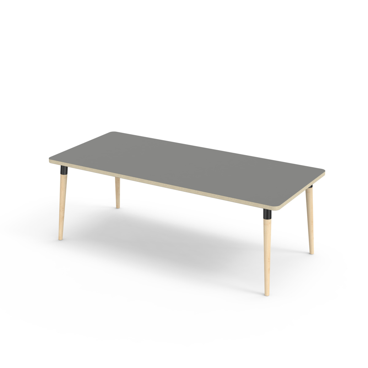 Bordplade belagt med akustik linoleum, hvilket giver en blød og behagelig overflade, samtidig med at den bidrager til en bedre lydmiljø. Med en hjørneradius på 40 mm får bordet et moderne og stilrent design. Benene er fremstillet af klarlakeret massiv birk og monteret i en robust sort manchet. Denne konstruktion sikre både stabilitet og holdbarhed. Benene er let vinklet ud mod bordpladens hjørner, hvilket giver bordet et unikt og æstetisk udseende. Monteringen er enkel og let – du skal blot fastgøre metaldelene i de forberedte monteringspunkter i bordpladen.