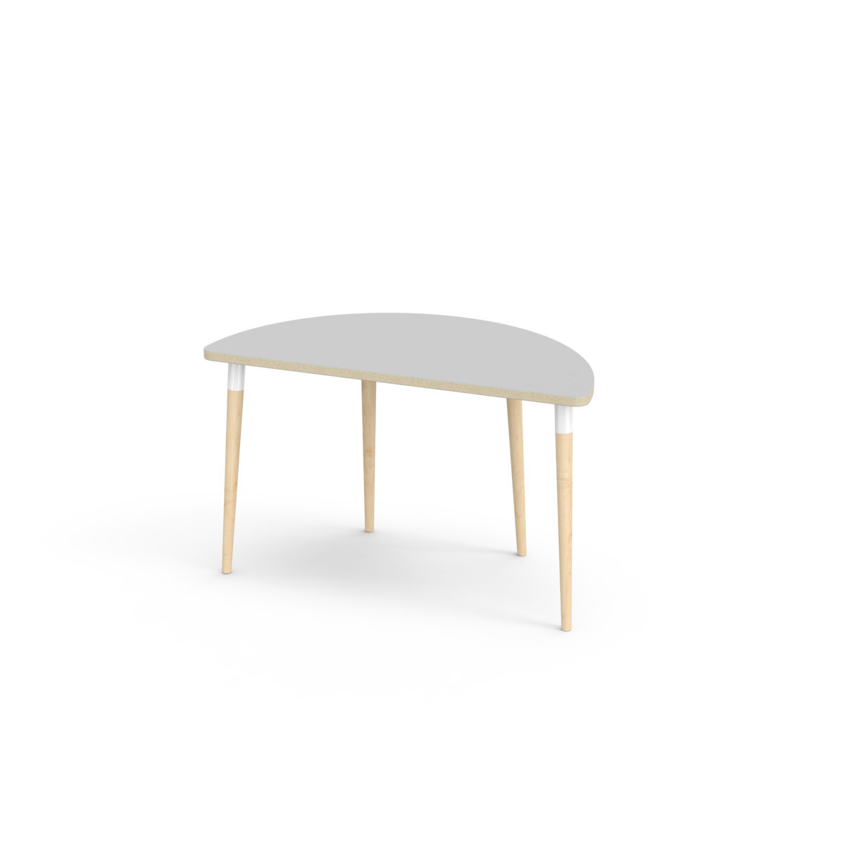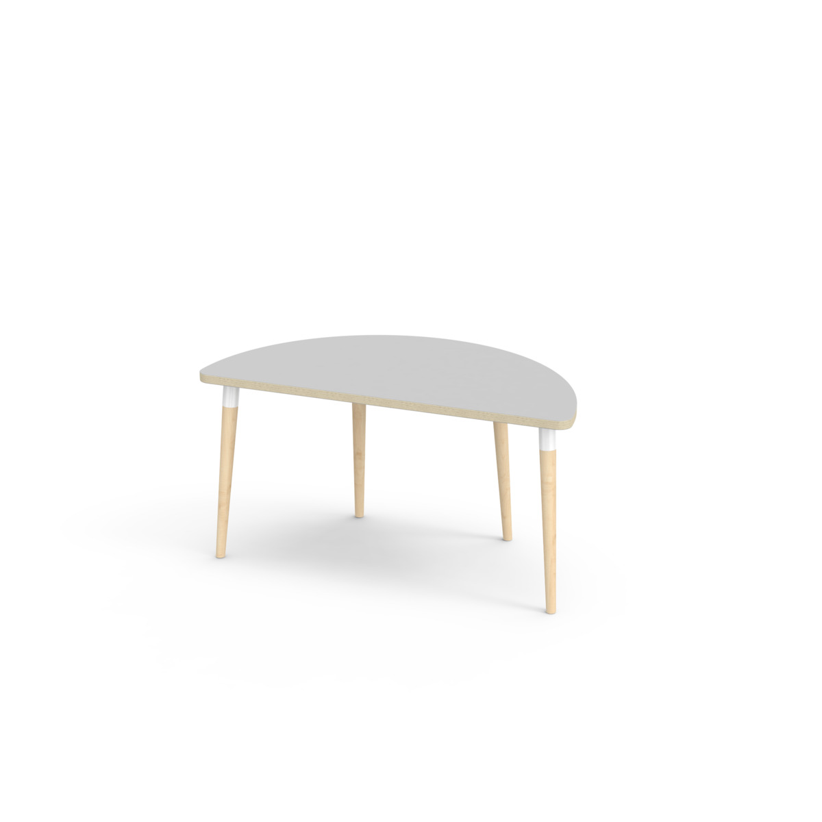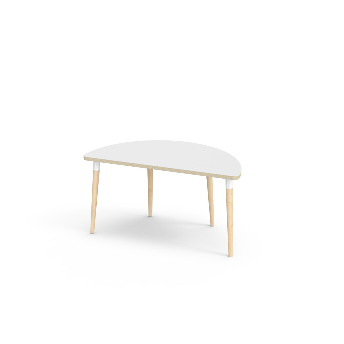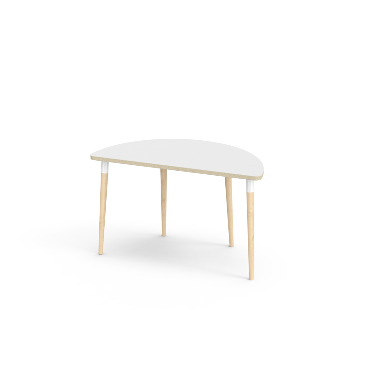Bordplade belagt med laminat. Med en hjørneradius på 40 mm får bordet et moderne og stilrent design. Benene er fremstillet af klarlakeret massiv birk og monteret i en robust hvid manchet. Denne konstruktion sikre både stabilitet og holdbarhed. Benene er let vinklet ud mod bordpladens hjørner, hvilket giver bordet et unikt og æstetisk udseende. Monteringen er enkel og let – du skal blot fastgøre metaldelene i de forberedte monteringspunkter i bordpladen.