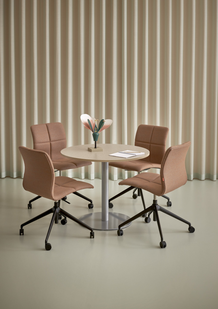 Søjlebord med lakeret understel i RAL 9005. Bordplade i støjdæmpende akustik linoleum og belagt med slidstærkt linoleum. Testet og godkendt i henhold til EN 15372:2016 som opfylder krav til stabilitet, holdbarhed og sikkerhed.