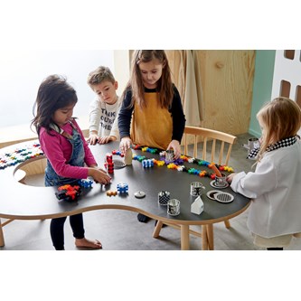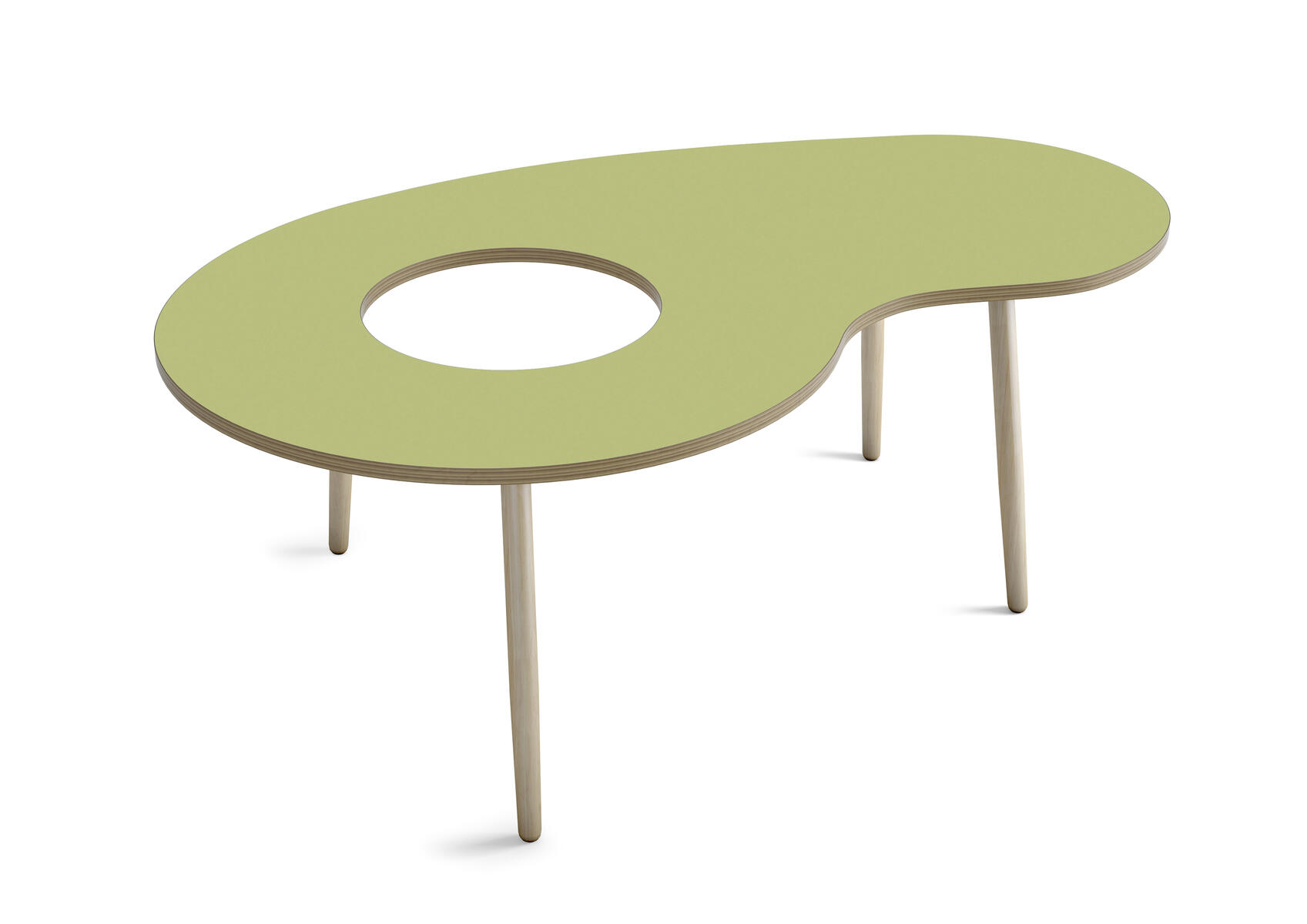 Bord i organisk form til udforskning. Bordpladen er i krydsfinér med lamineret overflade. Mål: 150x96x55 cm. Hullet har en diameter på 40 cm. Skålen på billederne er en del af et sæt, som kan købes på varenr. 13128.