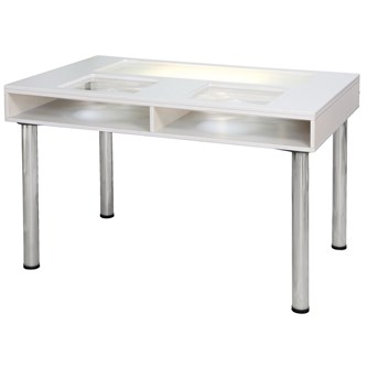 Kombineret lys- og forstørrelsesbord. Indeholder pladser med optiske linser til forstørrelse og lysbord. Fremstillet i hvidpigmenteret birkekrydsfinér med bordplade i grå laminat. Låg til topplade medfølger, så bordet kan anvendes til andre gøremål. Sikkerhedsgodkendt el. Mål: 120x60 cm, højde 77 cm. Leveres med runde metalben.