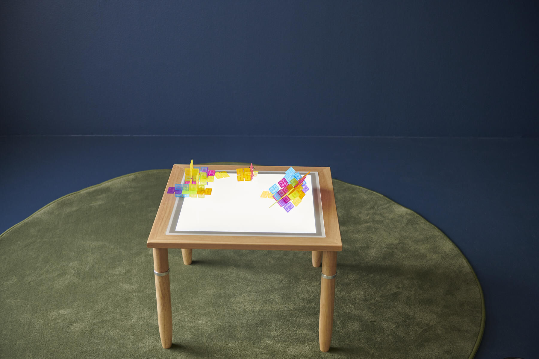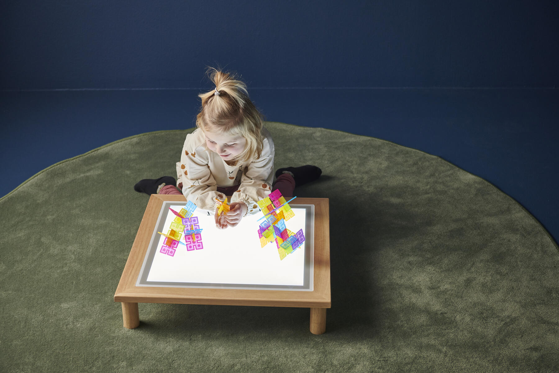 Et massivt træbord med bordplade i form af et lysbord, hvilket giver en alsidig anvendelse. Lysbordet opmuntrer til kreativ læring, hvor barnet får mulighed for at observere og udforske lysets effekter og arbejde med kontraster. Lysbordets ben er justerbare og kan nemt indstilles til 4 forskellige højder, så børn i forskellige størrelser kan sidde, stå eller bruge det som lyspanel på et andet bord. De forskellige højder er 2 cm, 12 cm, 30 cm eller 42 cm. Mål på bordplade: 60x60 cm, lysoverflade 50x50 cm. LED-belysning med en brændetid på 50.000 timer. Fra 3 år.