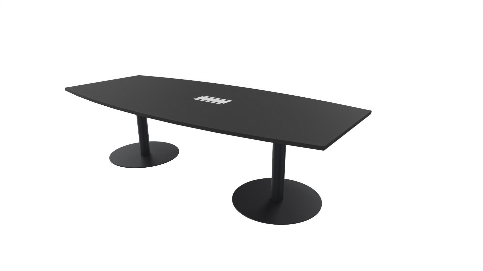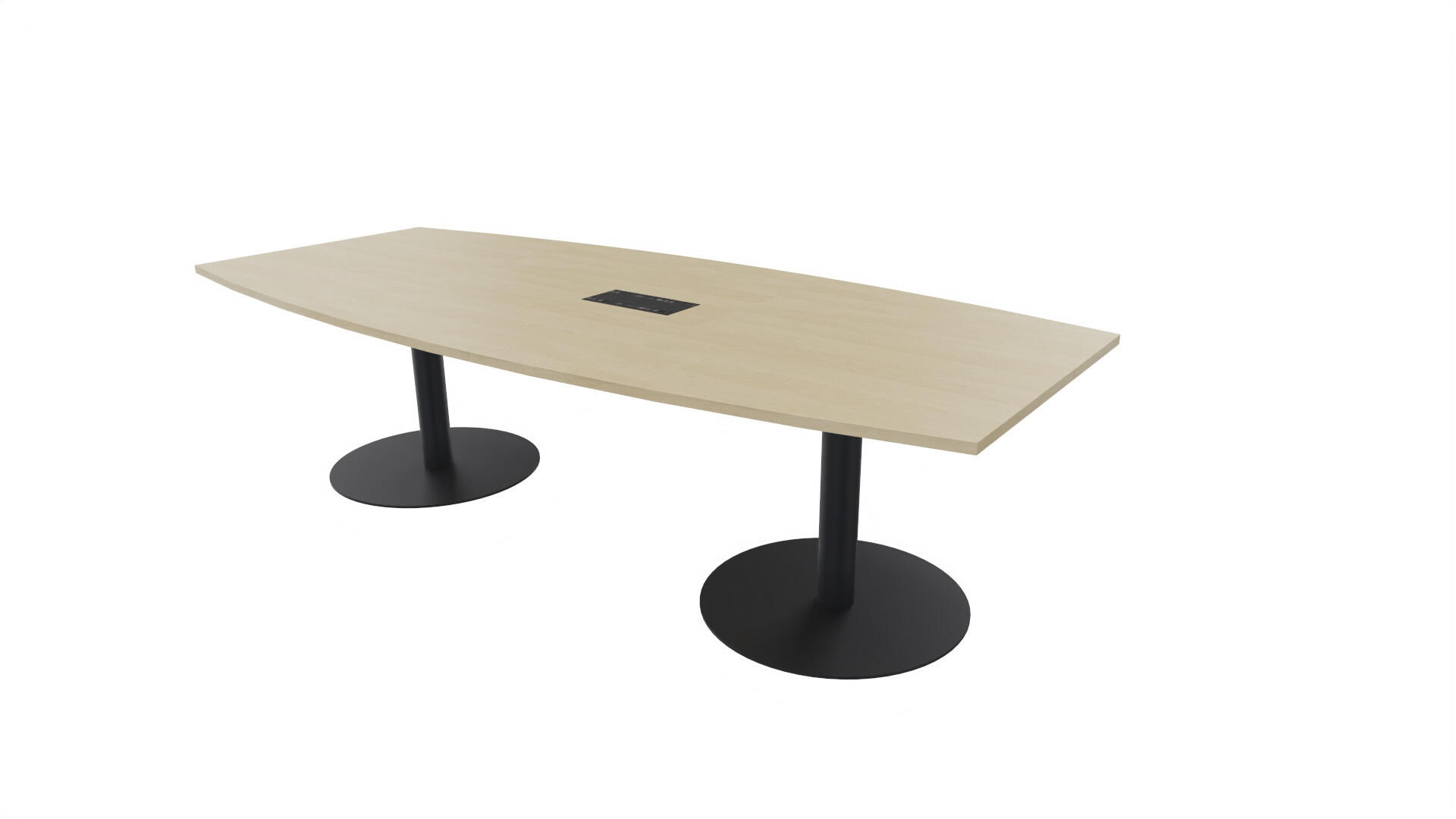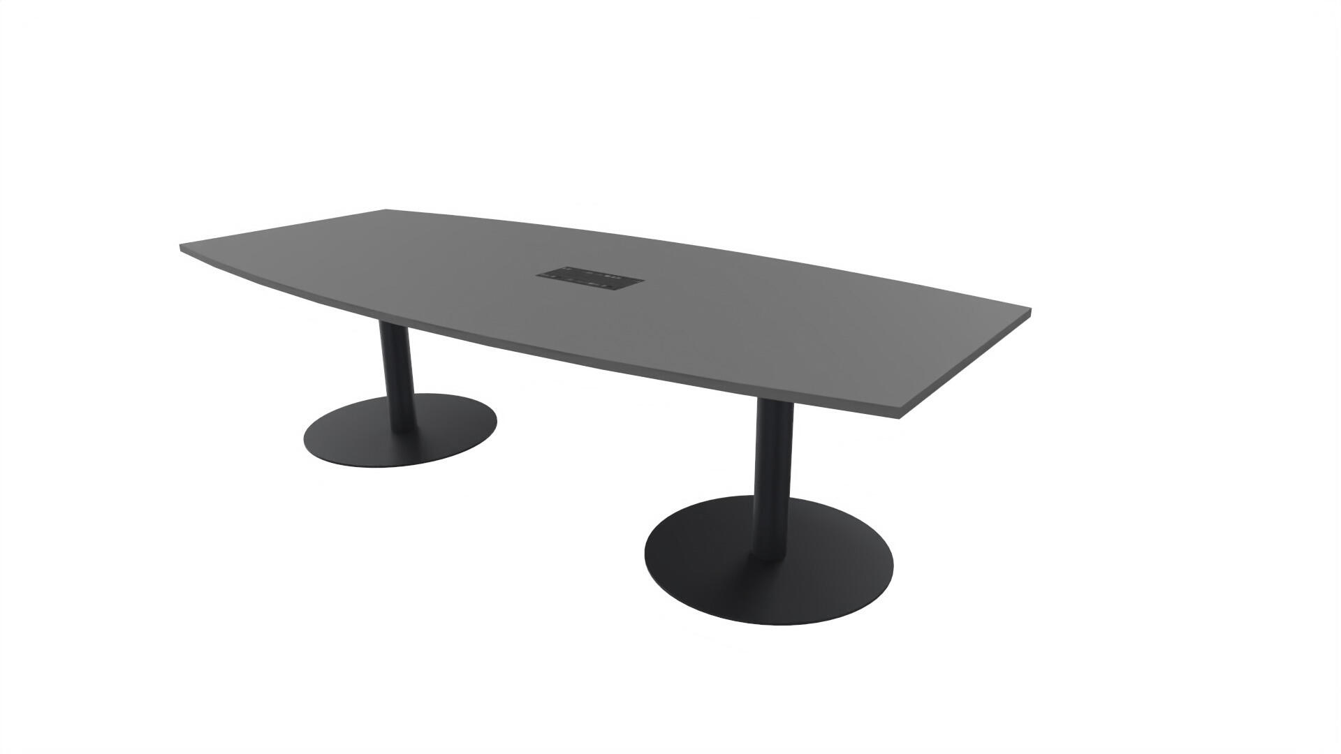 Et konferencebord med en bordplade som er smallere i den ene ende for at give alle frit udsyn mod f.eks. en skærm eller et whiteboard. Kerne af spånplade beklædt med laminat og ABS-kantliste. 2 søjleben Ø10,2 cm, fod Ø72 cm. Udover standardlaminat fås bordet også med et sort nanolaminat, som har en overflade, som er mat og modstandsdygtigt mod fingeraftryk. Som tilvalg fås også en mediaboks (32x15 cm) indfældet i bordet. Mediaboksen består af 2x 230V stikkontakter, 1x USB og 1x HDMI.