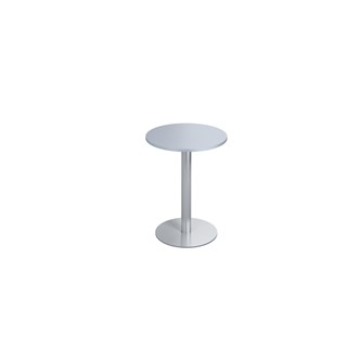 Børstet rustfrit stålrør. Højde 60 cm. Ø70 cm. Bordplade i højtrykslaminat.