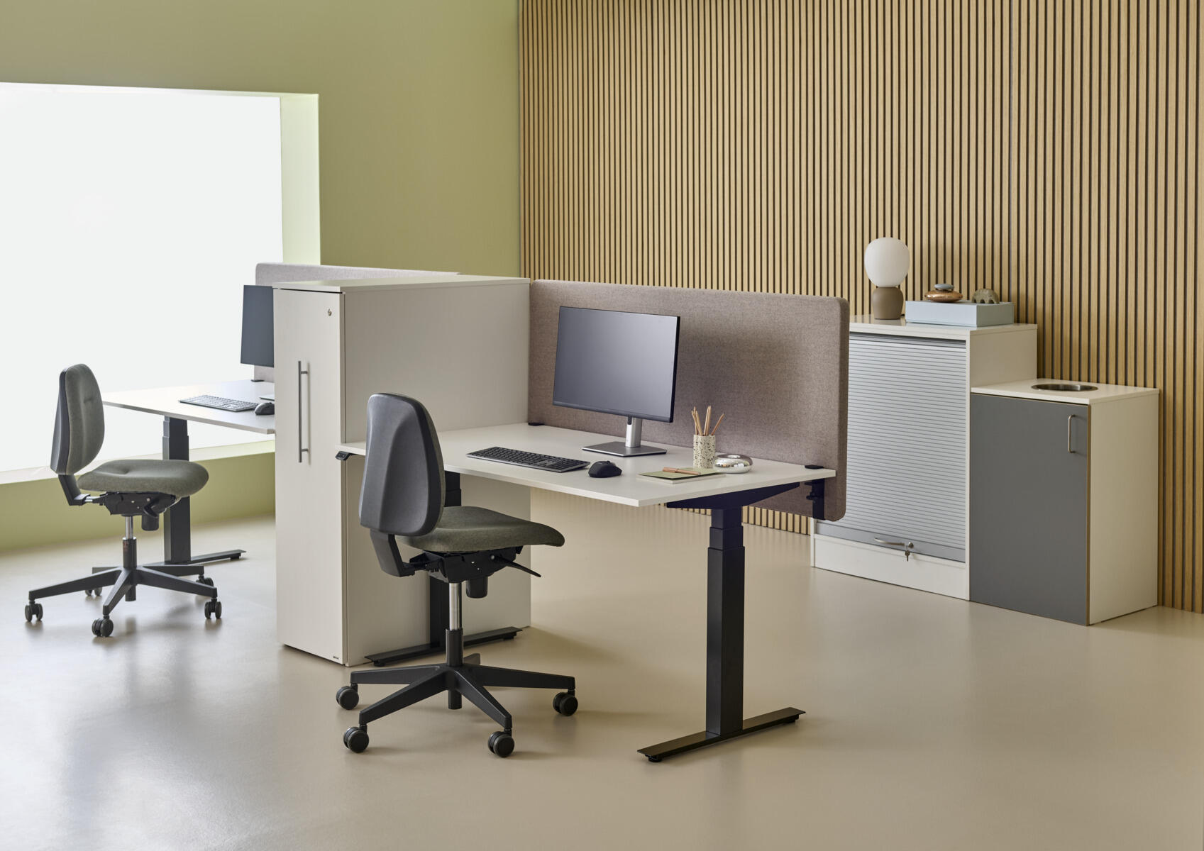 Chat skrivebord har en bordplade i decor laminat med ABS-kant. Med sit brede justeringsinterval (615 - 1275 mm ±5 mm ekskl. bordplade) kan skrivebordet nemt tilpasses til at imødekomme forskellige brugeres behov. Den trinløse højdejustering sikrer en glidende overgang mellem forskellige højder, hvilket gør det nemt at skifte mellem siddende og stående arbejdsstillinger og dermed fremmer en aktiv arbejdsdag samt bidrager til en mere ergonomisk og sund arbejdsplads. Skrivebordet er udstyret med en anti-kollisionsfunktion, der registrerer forhindringer, når skrivebordet sænkes eller hæves, og reagerer hurtigt ved at stoppe. Stellet er udstyret med justerbare fødder til ujævne underlag. Mål på fod: L61xB6 cm.