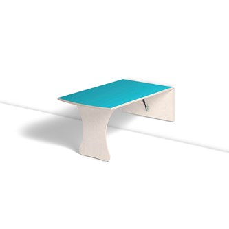 Væghængt bord med ophængslås og gasdæmper som giver et sikkert bord, der sænkes langsomt og kontrolleret. Kræver montering. Hvidpigmenteret birk. Bordplade med akustik linoleum og lakeret underside. Dybde fra væg i opklappet tilstand: 55 mm. Total bredde inkl. bænk 123 cm