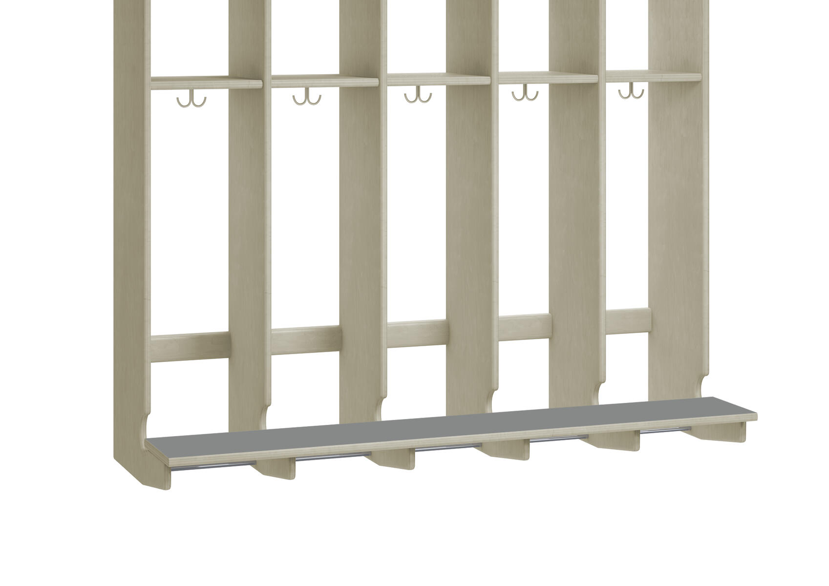 Flexi-garderoben er udviklet til børnehaver, skoler og SFO'er. Fremstillet i 18 mm birkekrydsfinér. Flexi fås både som væghængt model og fritstående gulvmodel i tre forskellige bredder som standard med invendige mål: 22 cm, 25 cm eller 28 cm. Op til 5 rum kan bygges sammen. Gulvmodellen fås også som dobbeltsidet. Skohylden er med rør, så snavs ryger ned på gulvet. Dobbeltkrog til tøj og tasker i hvert rum. Låger både oppe og nede kan tilkøbes i forskellige farver. Mål: Højde 143 cm. Dybde 24 cm, med siddebænk 44 cm. Afstand fra krog til skohylde 100 cm. Husk træ er et levende og naturligt materiale og farvenuancer kan derfor forekomme. Væghængt garderobe med bænk. Indvendig mål pr. rum 28 cm. Svanemærket licensnummer 5031 0099.