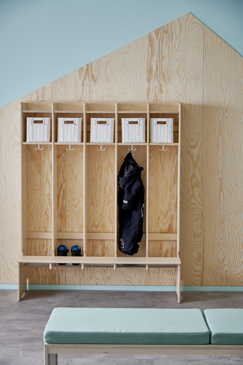 Flexi-garderoben er udviklet til børnehaver, skoler og SFO'er. Fremstillet i 18 mm birkekrydsfinér. Flexi fås både som væghængt model og fritstående gulvmodel i tre forskellige bredder som standard med invendige mål: 22 cm, 25 cm eller 28 cm. Op til 5 rum kan bygges sammen. Gulvmodellen fås også som dobbeltsidet. Skohylden er med rør, så snavs ryger ned på gulvet. Dobbeltkrog til tøj og tasker i hvert rum. Låger både oppe og nede kan tilkøbes i forskellige farver. Mål: Højde 168 cm. Dybde 24 cm, med siddebænk 44 cm. Afstand fra krog til skohylde 100 cm. Husk træ er et levende og naturligt materiale og farvenuancer kan derfor forekomme. Væghængt garderobe med bænk. Indvendig mål pr. rum 28 cm. Svanemærket licensnummer 5031 0099.