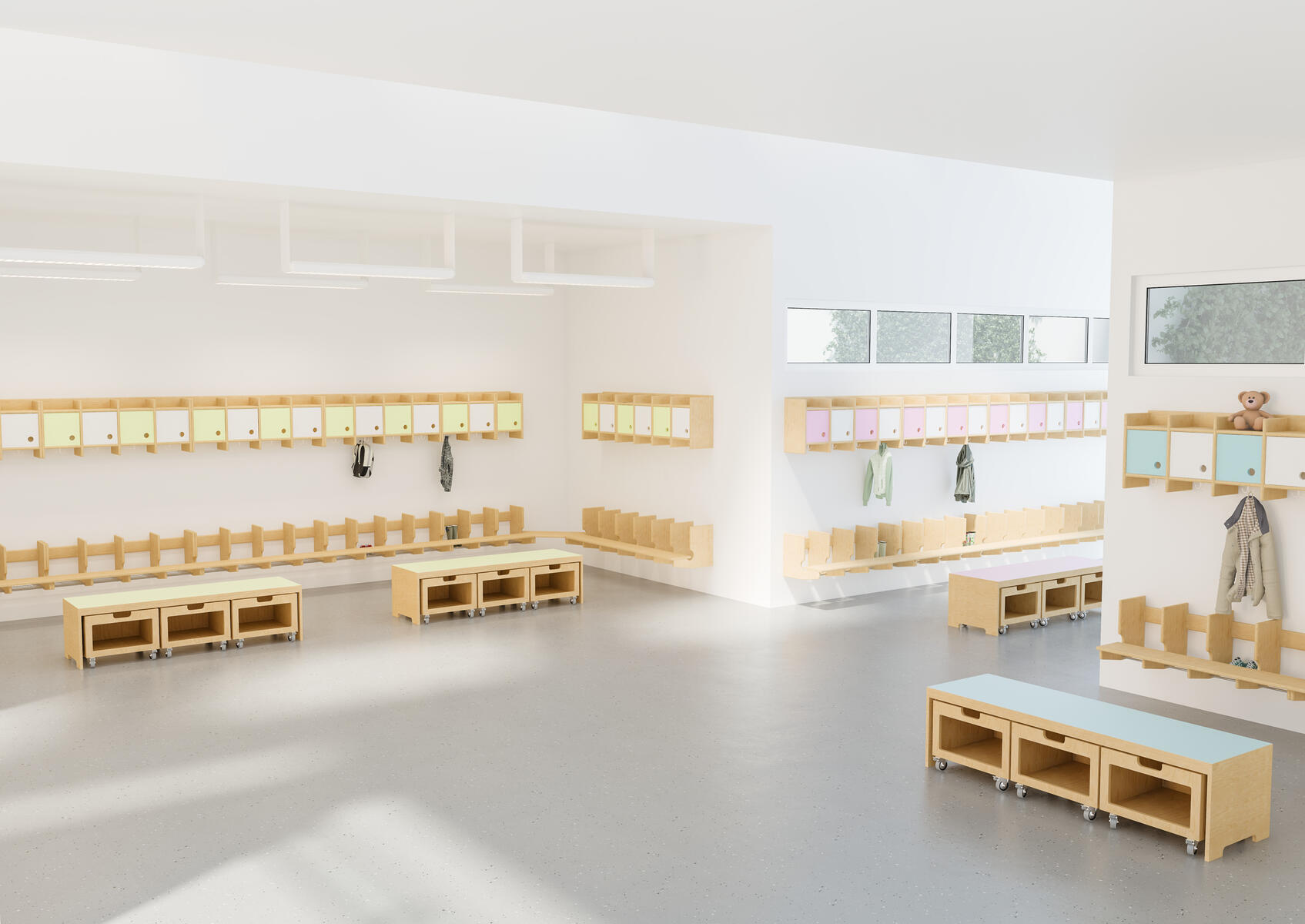 Flexi-garderobeoverdel udviklet til børnehaver, skoler og SFO'er. Fremstillet i 18 mm birkekrydsfinér, klar lak eller. Flexi leveres i tre forskellige bredder som standard med indvendige mål: 22 cm, 25 cm eller 28 cm. Dobbeltkrog til tøj og tasker i hvert rum. Låger kan tilkøbes i forskellige farver. Op til 5 rum kan bygges sammen. Husk træ er et levende og naturligt materiale og farvenuancer kan derfor forekomme. Kan kombineres med væghængt bænk og skohylde. Indvendig mål pr. rum 22 cm. Svanemærket licensnummer 5031 0099.