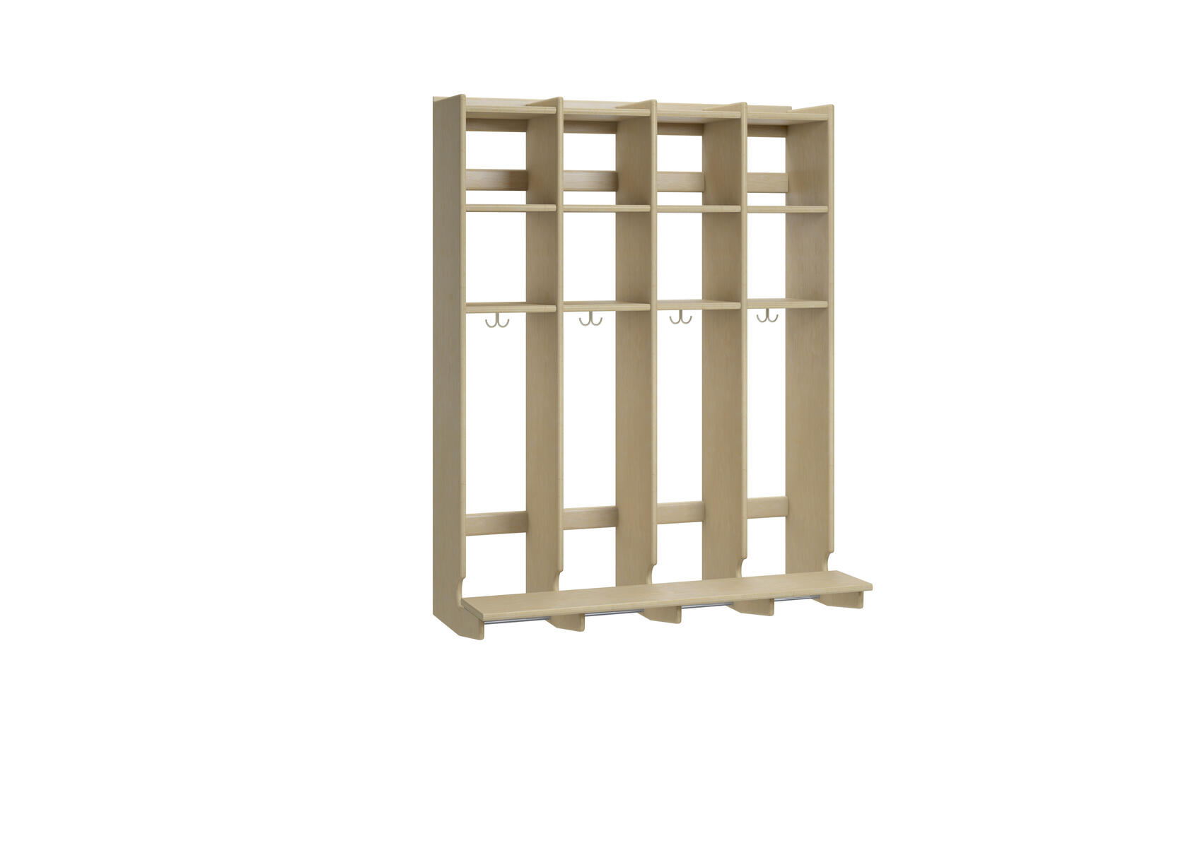 Flexi-garderobeoverdel udviklet til børnehaver, skoler og SFO'er. Fremstillet i 18 mm birkekrydsfinér, klar lak eller. Flexi leveres i tre forskellige bredder som standard med indvendige mål: 22 cm, 25 cm eller 28 cm. Dobbeltkrog til tøj og tasker i hvert rum. Låger kan tilkøbes i forskellige farver. Op til 5 rum kan bygges sammen. Husk træ er et levende og naturligt materiale og farvenuancer kan derfor forekomme. Kan kombineres med væghængt bænk og skohylde. Indvendig mål pr. rum 28 cm. Svanemærket licensnummer 5031 0099.