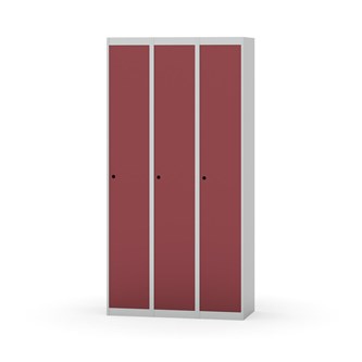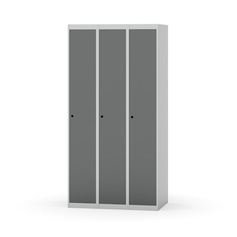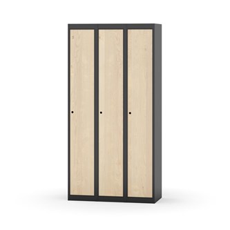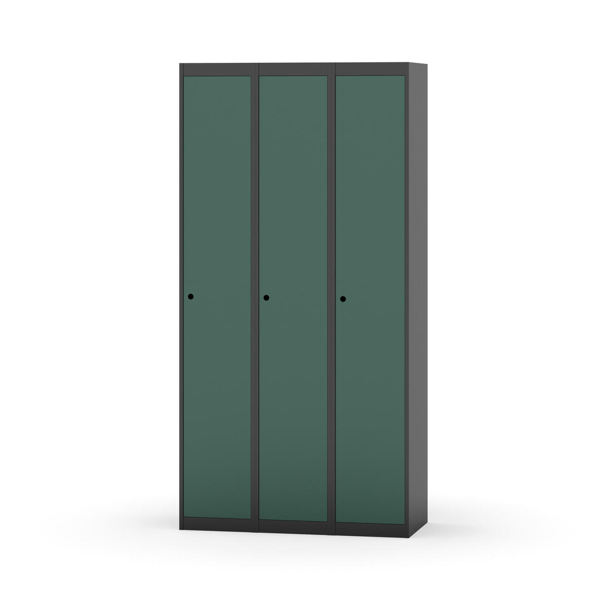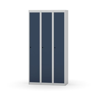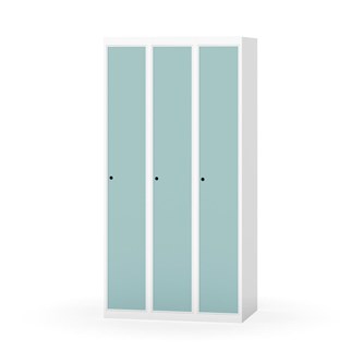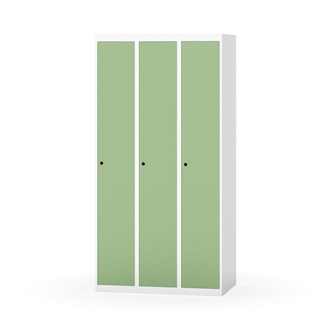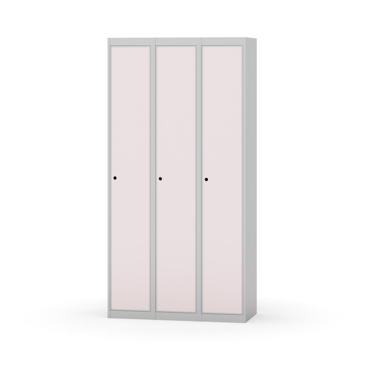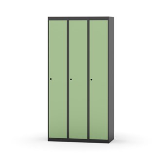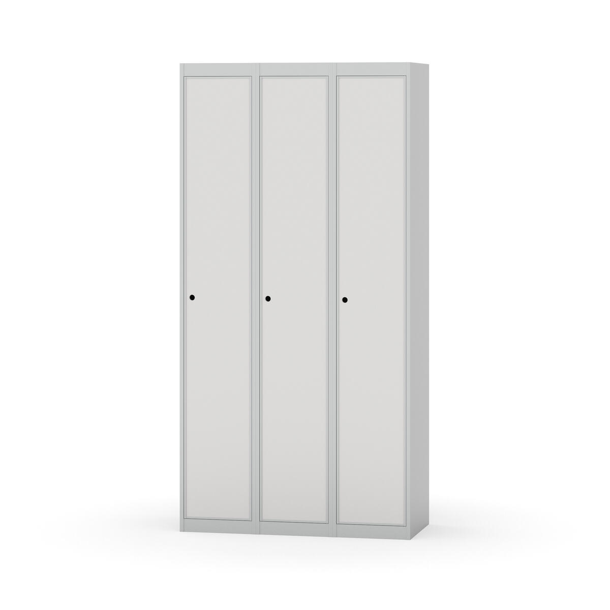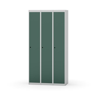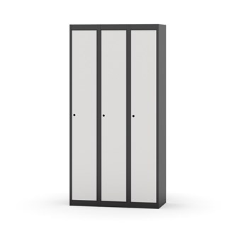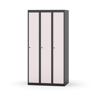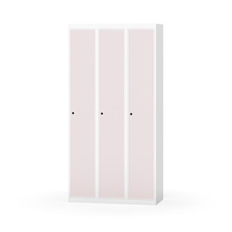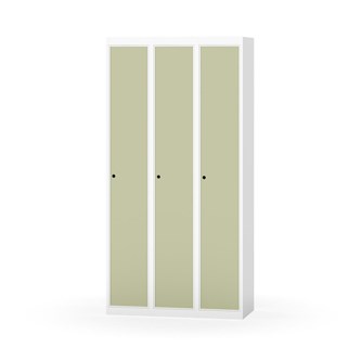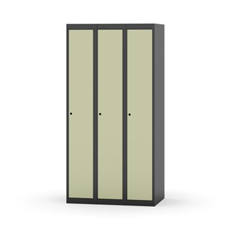Garderobeskab med fuldsvejset stel. Vælg mellem låge i metal eller laminat. Metallågen er udstyret med dørstopper i stål og indvendig forstærkningsplade omkring låsehullet. Laminatlågen er indstøbt i en stålramme, som er udstyret med dørstopper i stål. Lågerne kan åbnes 90 grader. Indretning: Bøjlestang med to praktiske ankerkroge. Plan bund uden kant. Ventilation gennem huller i top-/bundplade. Bemærk, at lås samt sokkel/ben bestilles på separate varenumre. Leveres med færdigmonteret lås. Det valgte understel monteres ved levering.