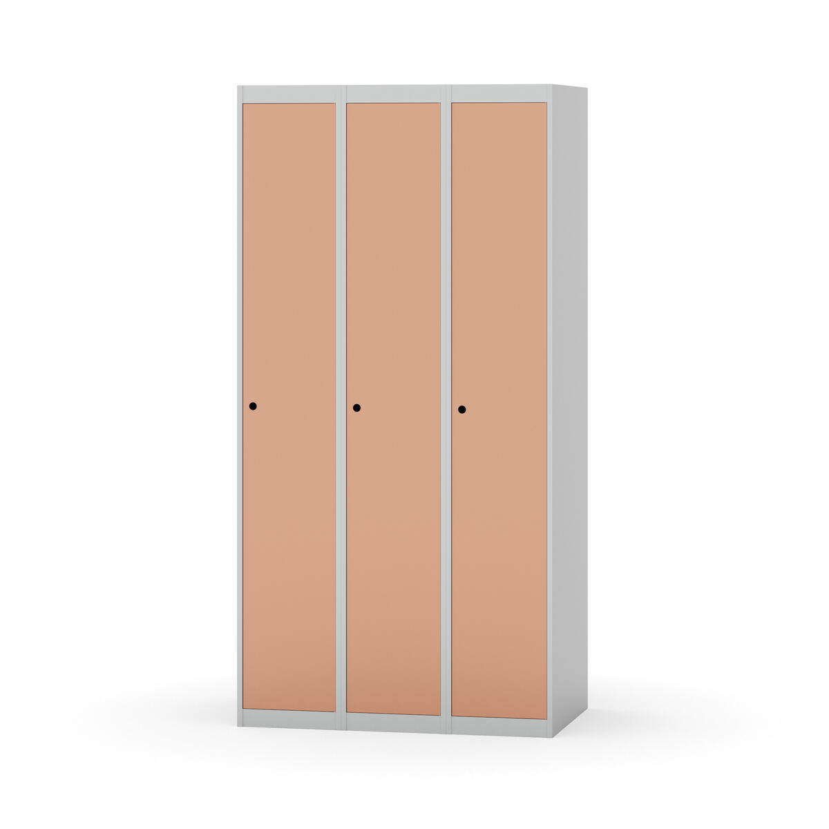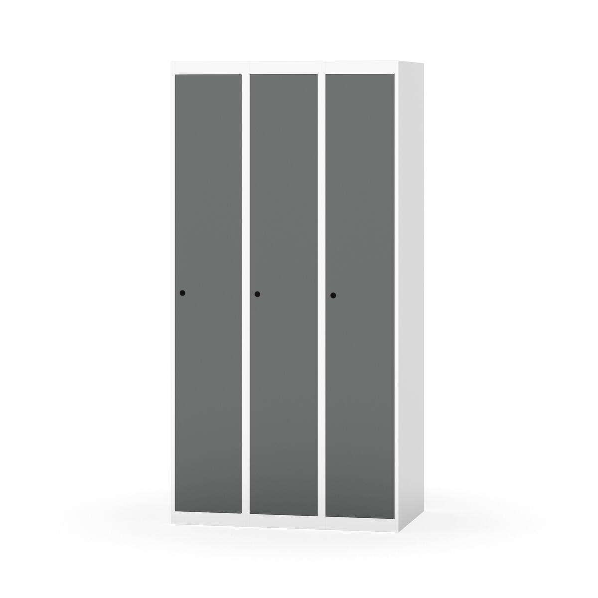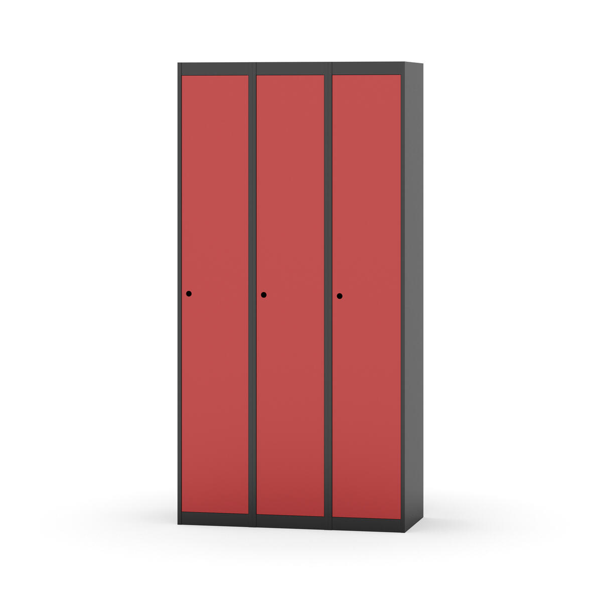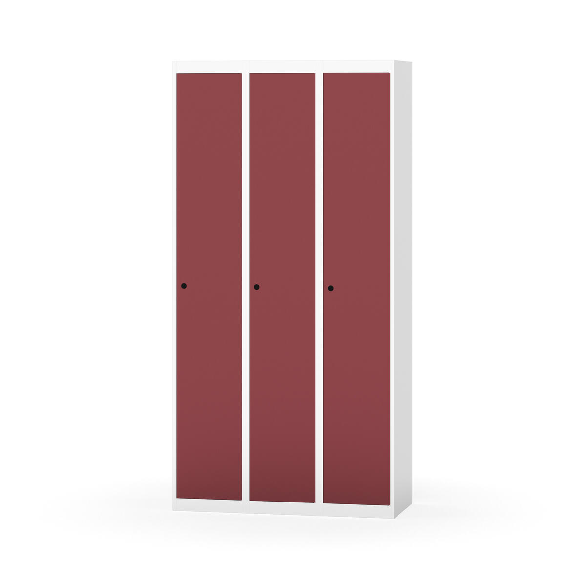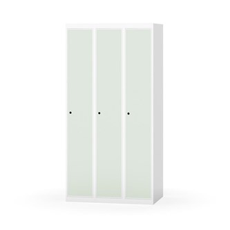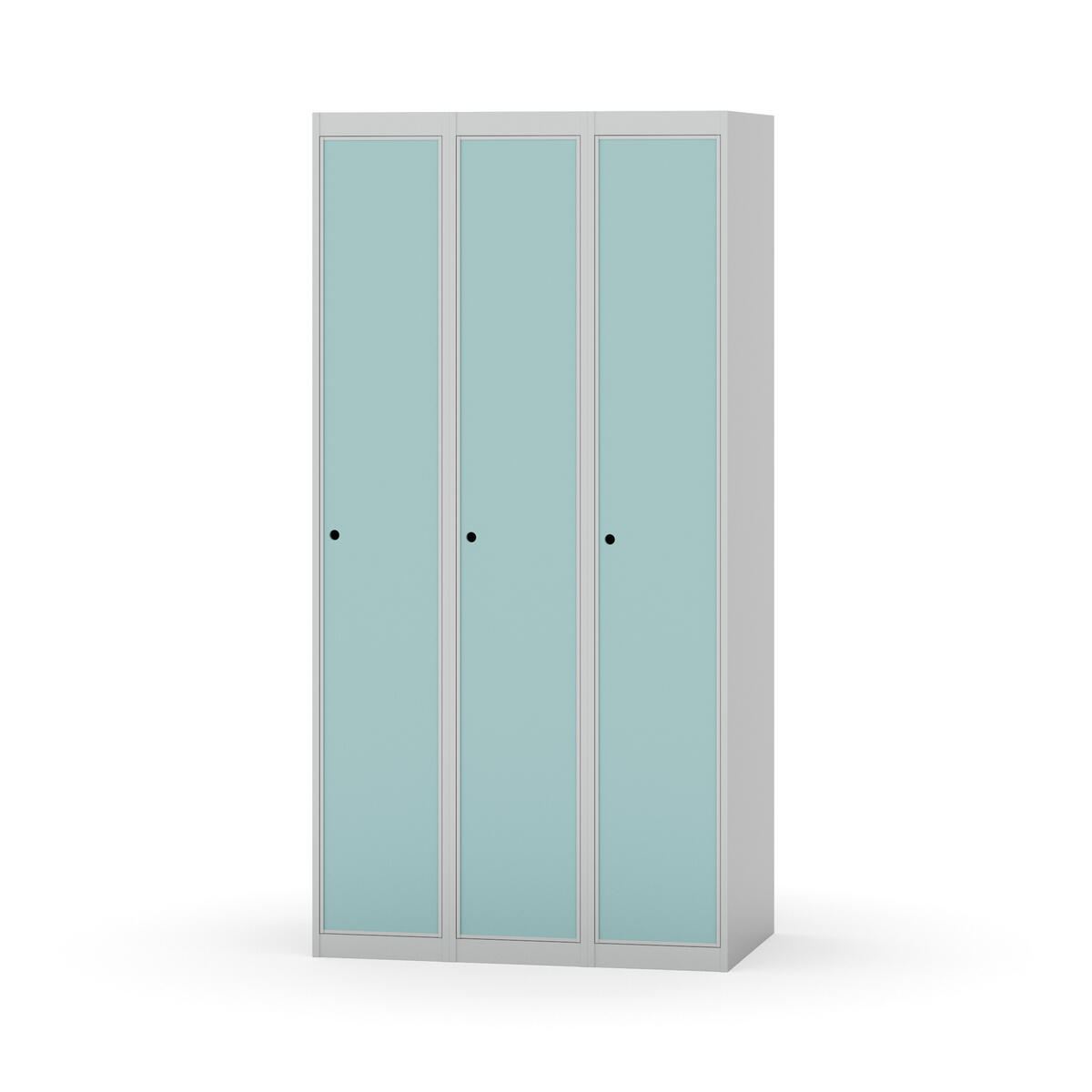 Garderobeskab med fuldsvejset stel. Vælg mellem låge i metal eller laminat. Metallågen er udstyret med dørstopper i stål og indvendig forstærkningsplade omkring låsehullet. Laminatlågen er indstøbt i en stålramme, som er udstyret med dørstopper i stål. Lågerne kan åbnes 90 grader. Indretning: Bøjlestang med to praktiske ankerkroge. Plan bund uden kant. Ventilation gennem huller i top-/bundplade. Bemærk, at lås samt sokkel/ben bestilles på separate varenumre. Leveres med færdigmonteret lås. Det valgte understel monteres ved levering.