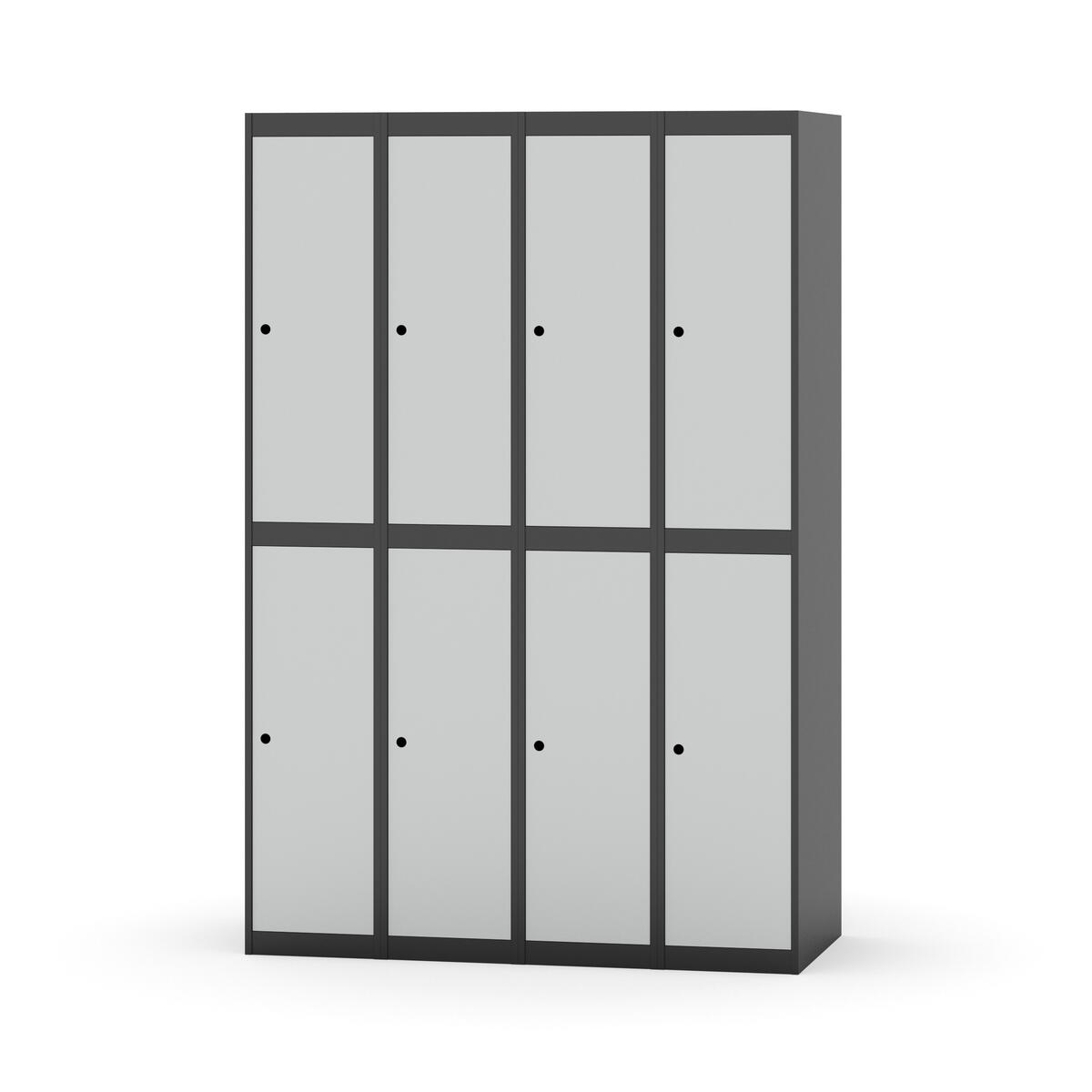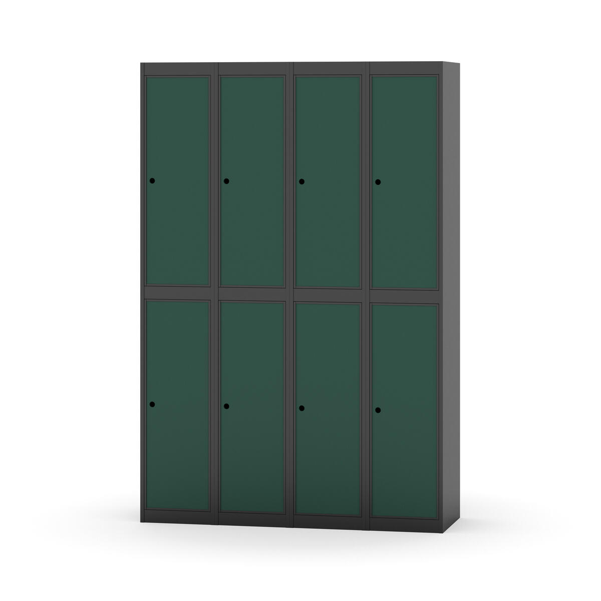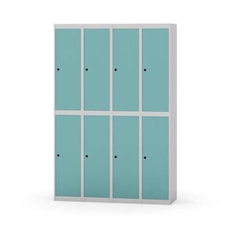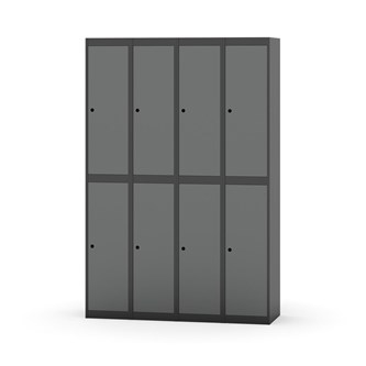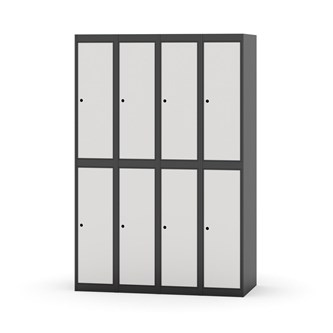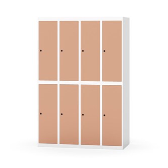 Garderobeskab med fuldsvejset stel. Vælg mellem låge i metal eller laminat. Metallågen er udstyret med dørstopper i stål og indvendig forstærkningsplade omkring låsehullet. Laminatlågen er indstøbt i en stålramme, som er udstyret med dørstopper i stål. Lågerne kan åbnes 90 grader. Indretning: Hylde og bøjlestang med to praktiske ankerkroge. Plan bund uden kant. Ventilation gennem huller i top-/bundplade. Bemærk, at lås samt sokkel/ben bestilles på separate varenumre. Leveres med færdigmonteret lås. Det valgte understel monteres ved levering.