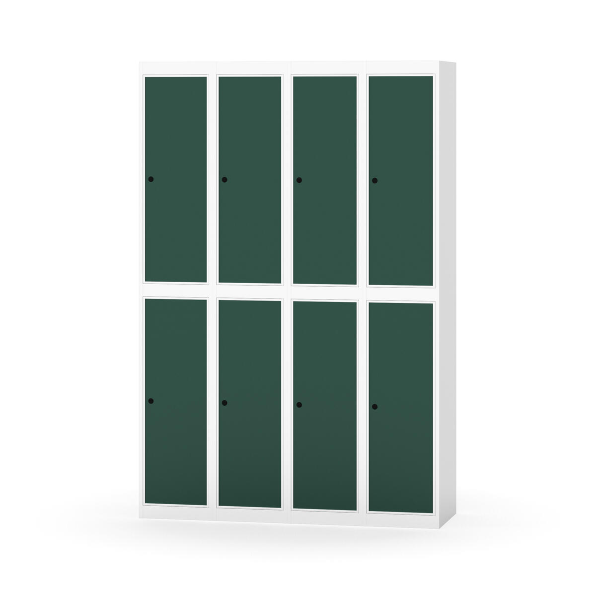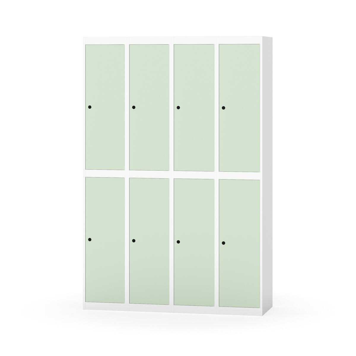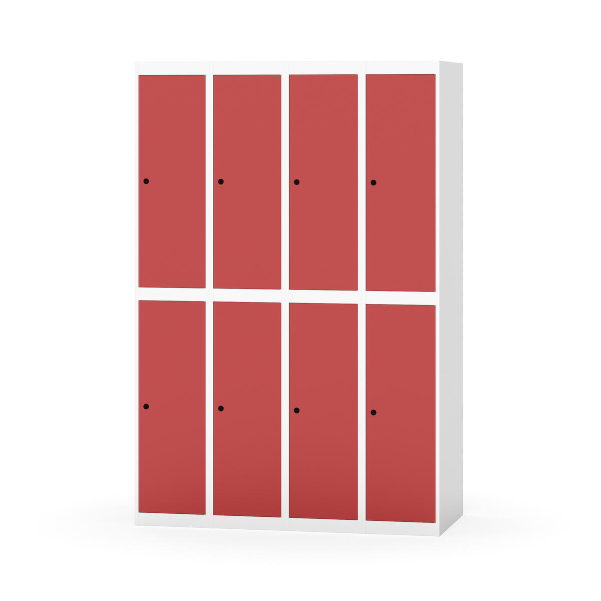 Garderobeskab med fuldsvejset stel. Vælg mellem låge i metal eller laminat. Metallågen er udstyret med dørstopper i stål og indvendig forstærkningsplade omkring låsehullet. Laminatlågen er indstøbt i en stålramme, som er udstyret med dørstopper i stål. Lågerne kan åbnes 90 grader. Indretning: Hylde og bøjlestang med to praktiske ankerkroge. Plan bund uden kant. Ventilation gennem huller i top-/bundplade. Bemærk, at lås samt sokkel/ben bestilles på separate varenumre. Leveres med færdigmonteret lås. Det valgte understel monteres ved levering.