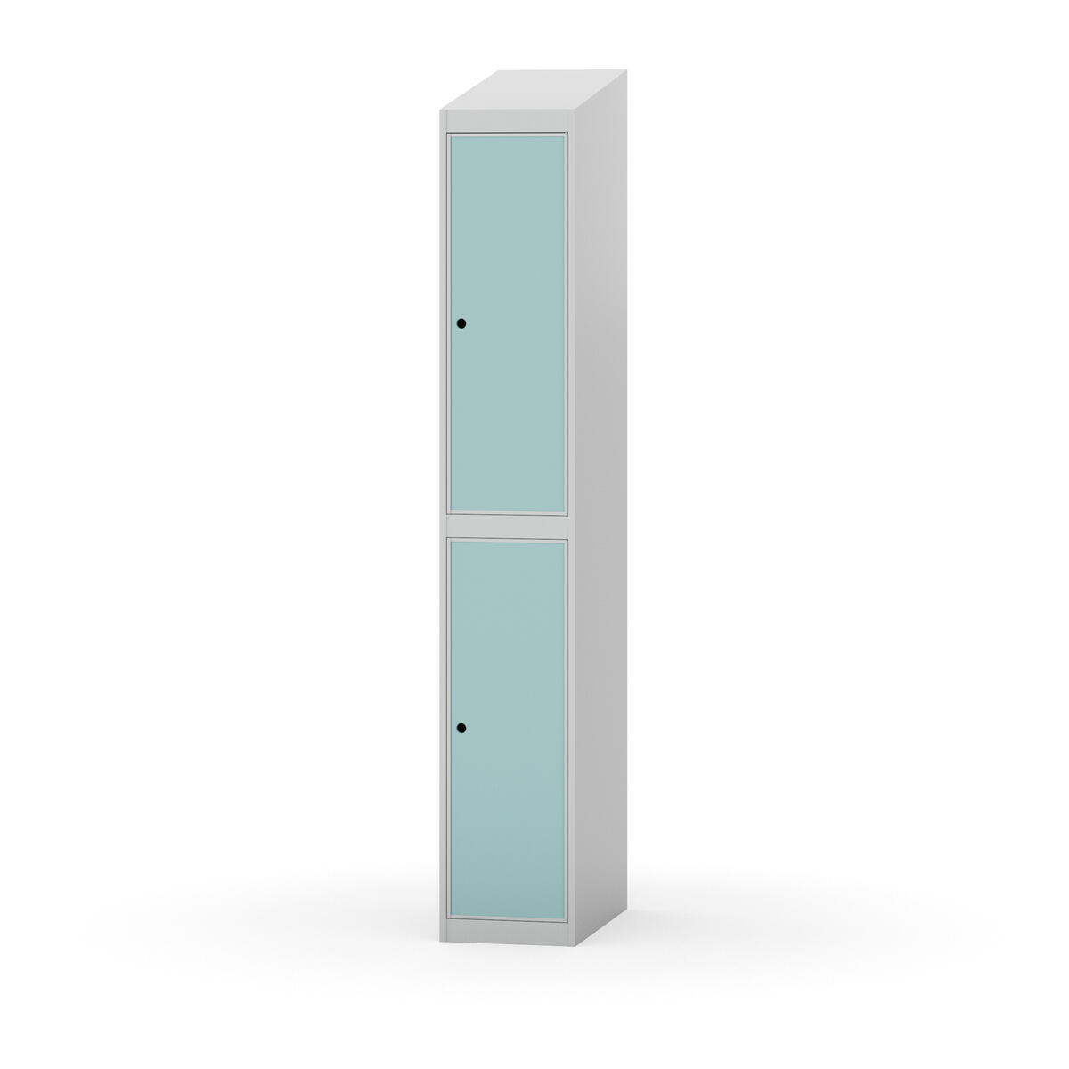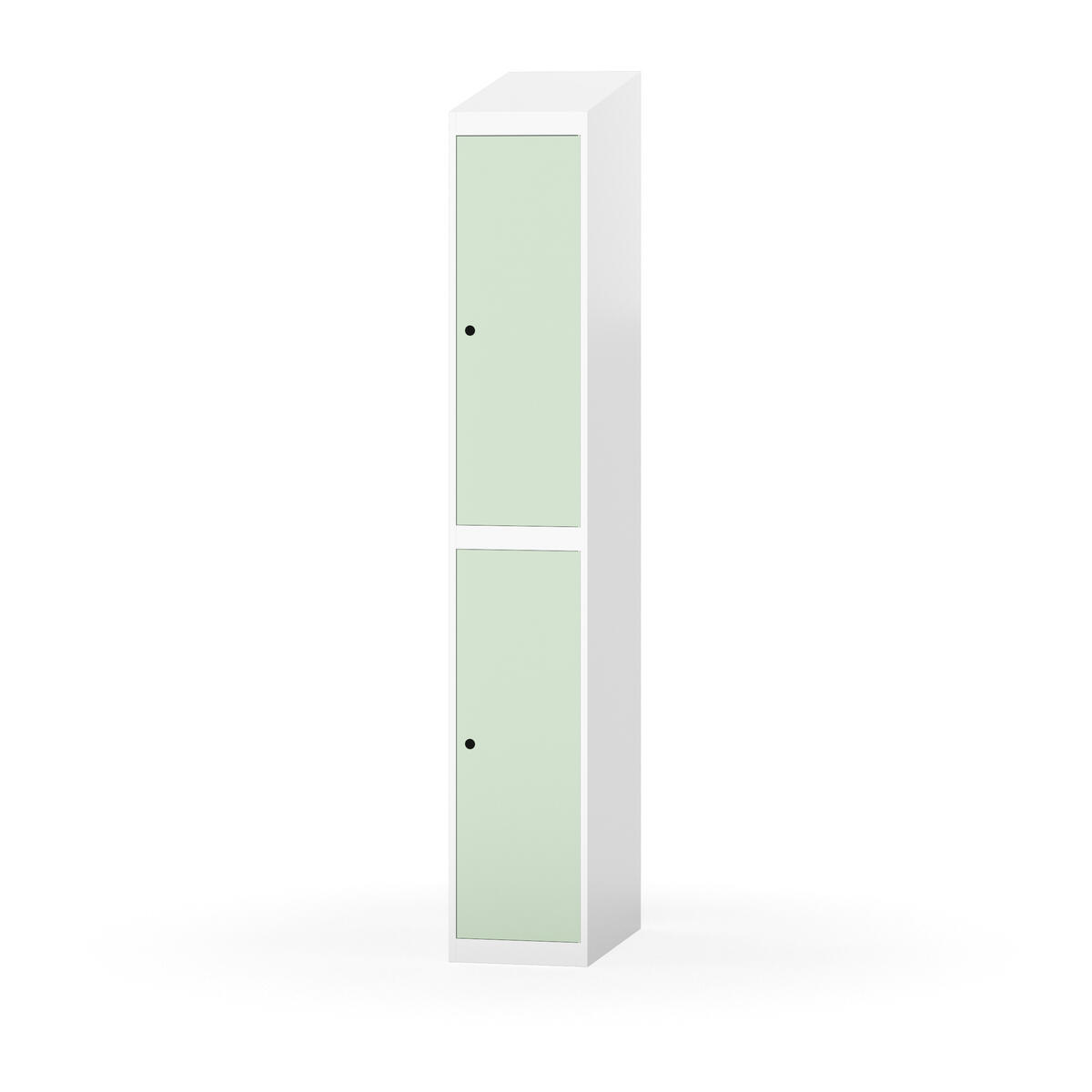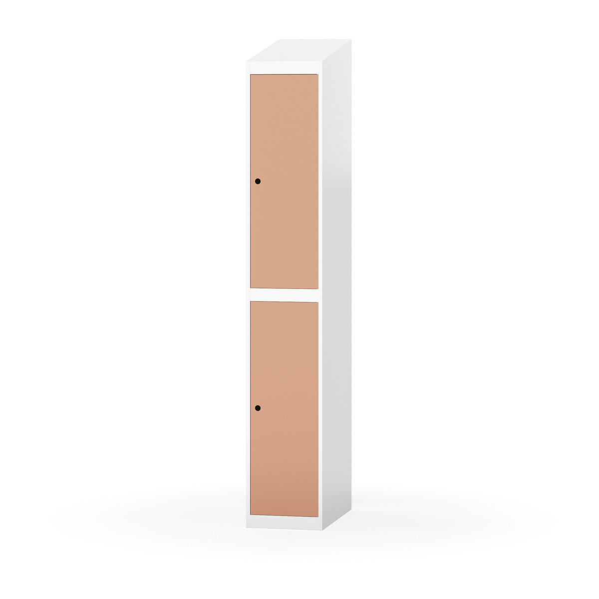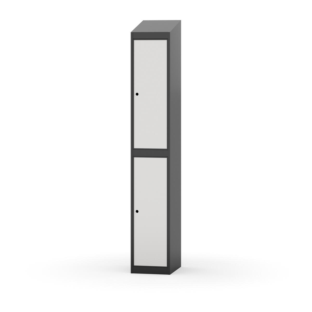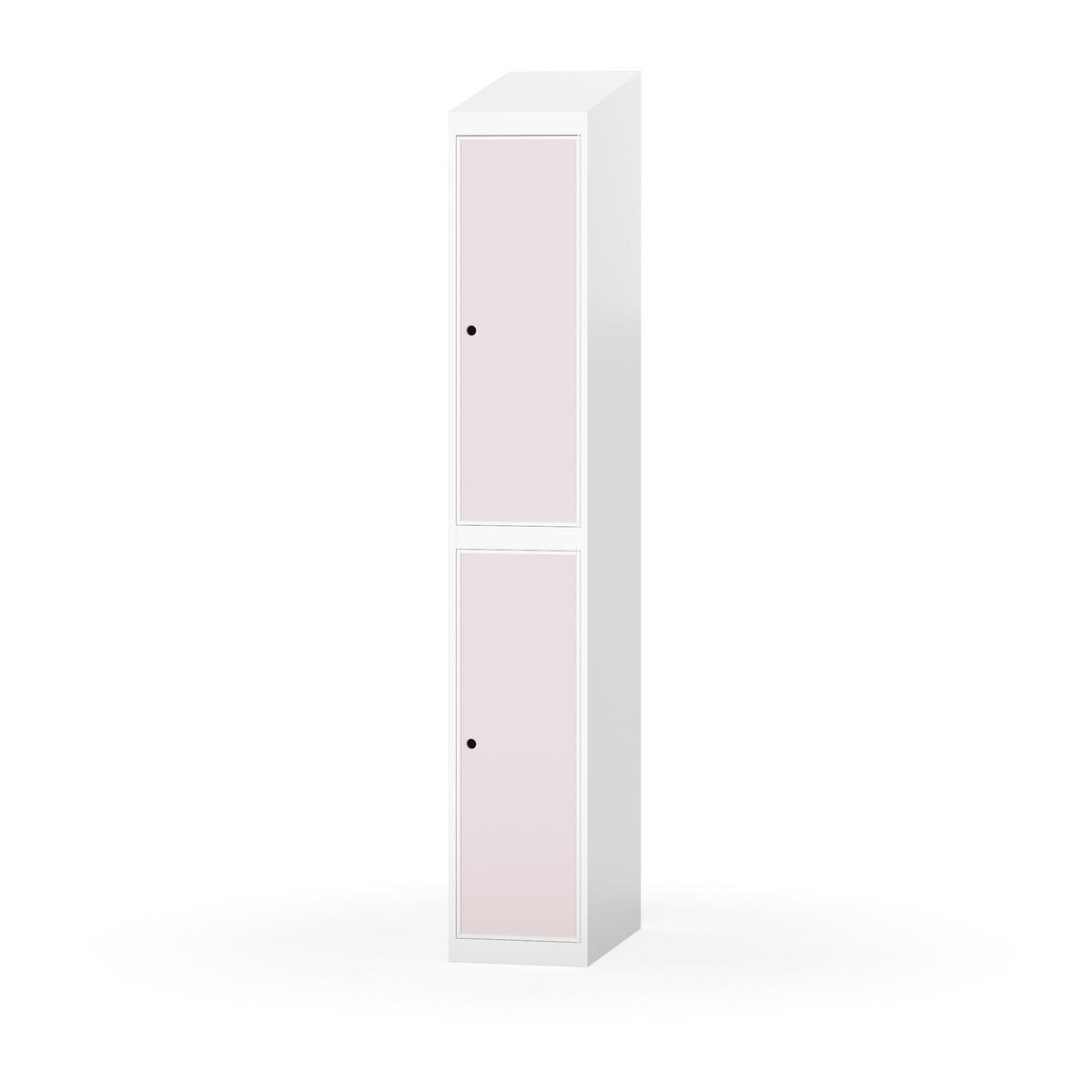 Garderobeskab med fuldsvejset stel. Vælg mellem låge i metal eller laminat. Metallågen er udstyret med dørstopper i stål og indvendig forstærkningsplade omkring låsehullet. Laminatlågen er indstøbt i en stålramme, som er udstyret med dørstopper i stål. Lågerne kan åbnes 90 grader. Indretning: Hylde og bøjlestang med to praktiske ankerkroge. Plan bund uden kant. Ventilation gennem huller i top-/bundplade. Bemærk, at lås samt sokkel/ben bestilles på separate varenumre. Leveres med færdigmonteret lås. Det valgte understel monteres ved levering.