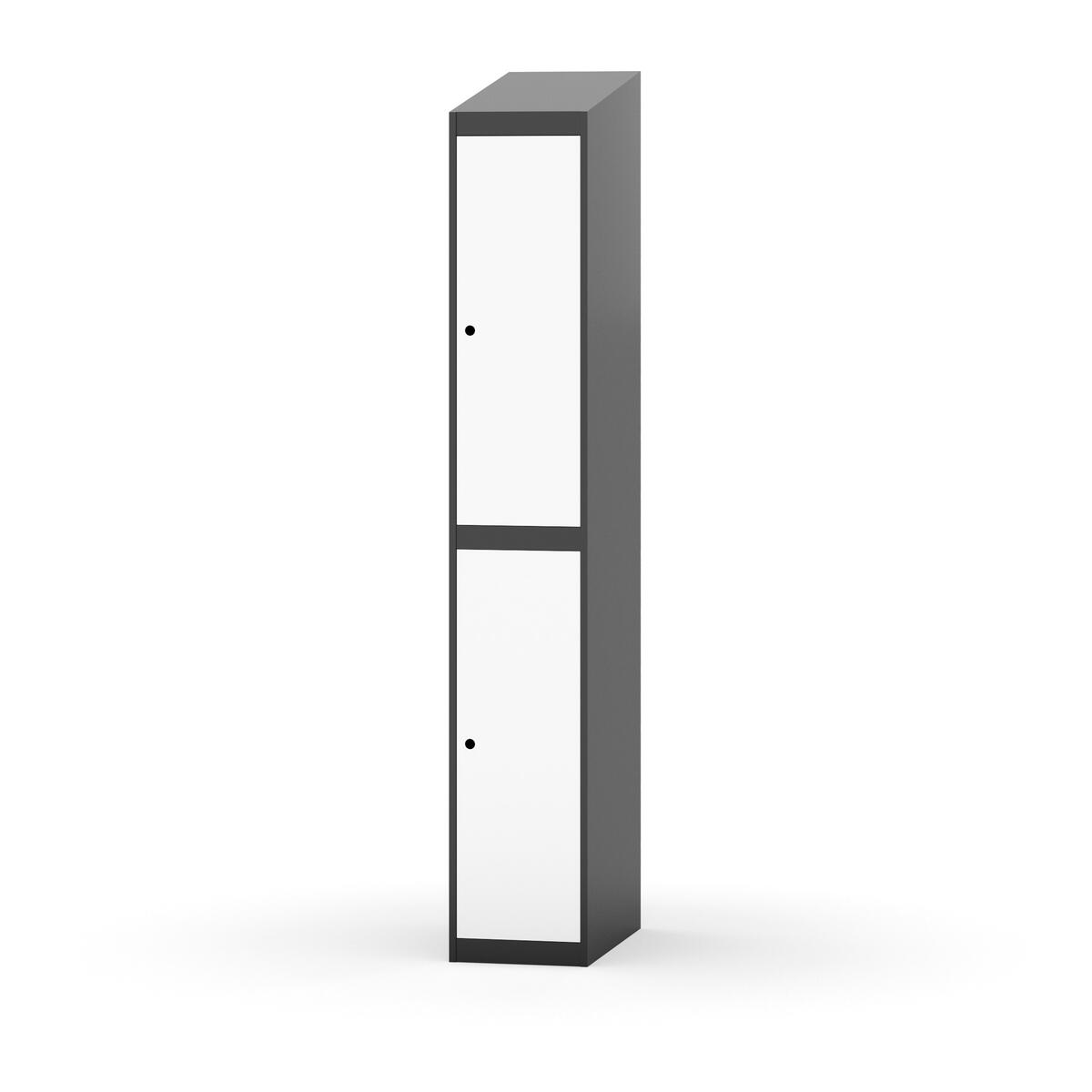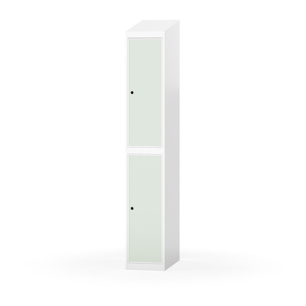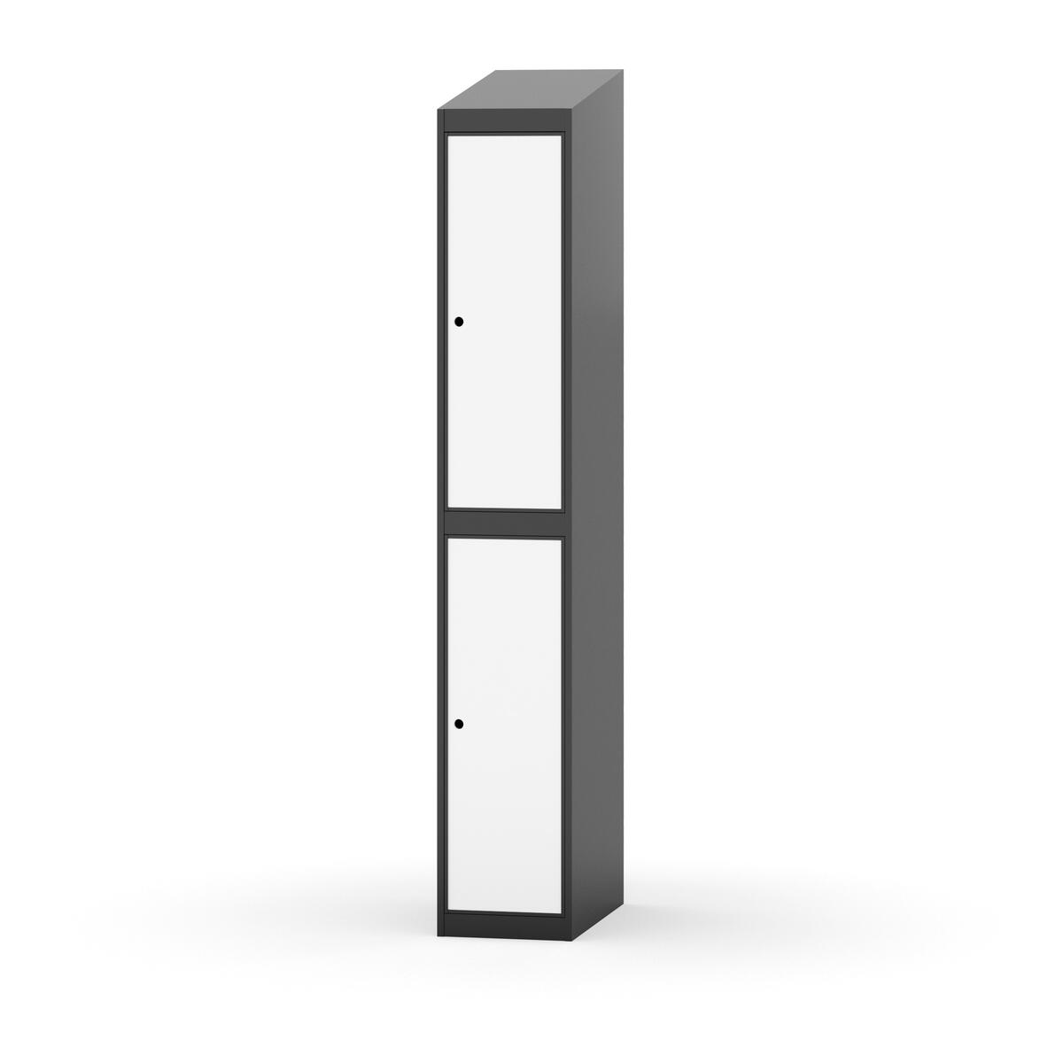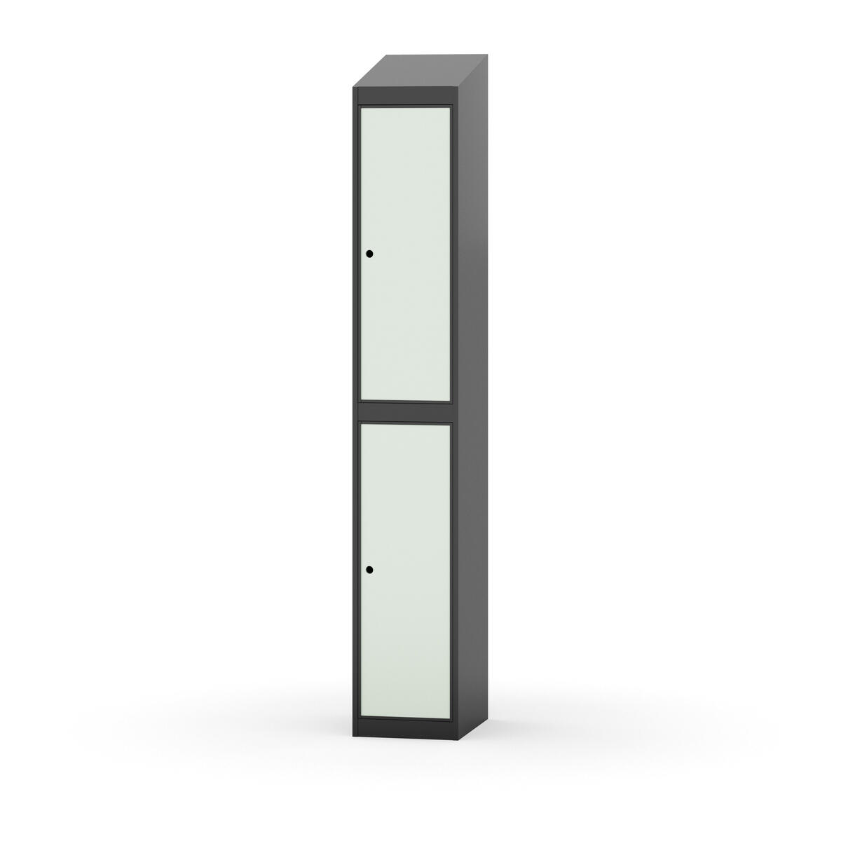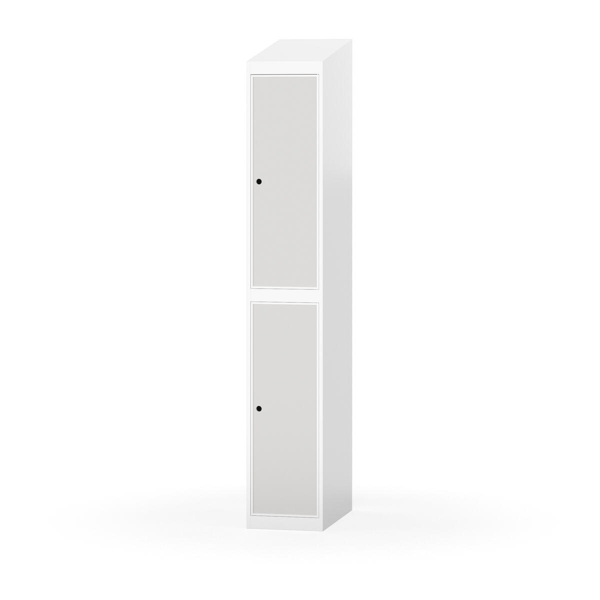 Garderobeskab med fuldsvejset stel. Vælg mellem låge i metal eller laminat. Metallågen er udstyret med dørstopper i stål og indvendig forstærkningsplade omkring låsehullet. Laminatlågen er indstøbt i en stålramme, som er udstyret med dørstopper i stål. Lågerne kan åbnes 90 grader. Indretning: Hylde og bøjlestang med to praktiske ankerkroge. Plan bund uden kant. Ventilation gennem huller i top-/bundplade. Bemærk, at lås samt sokkel/ben bestilles på separate varenumre. Leveres med færdigmonteret lås. Det valgte understel monteres ved levering.