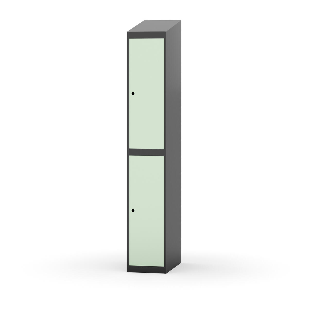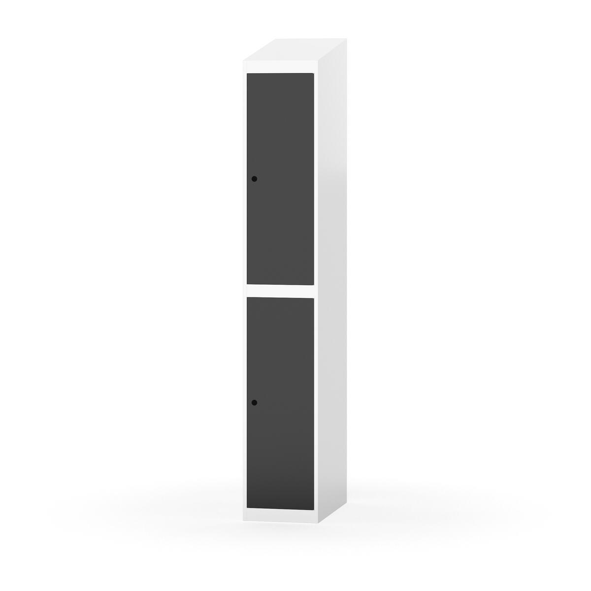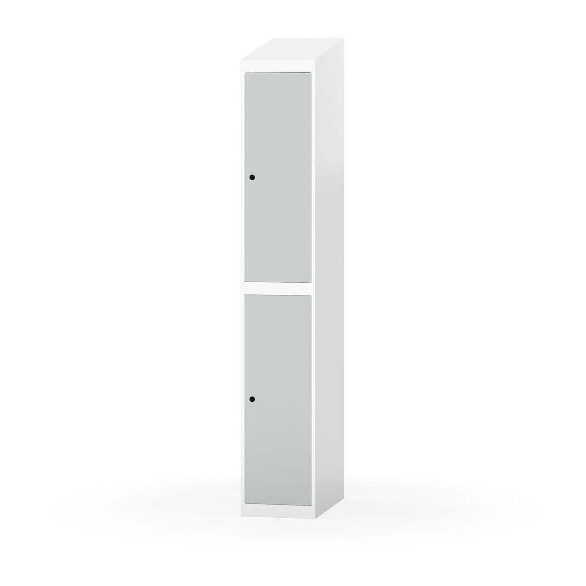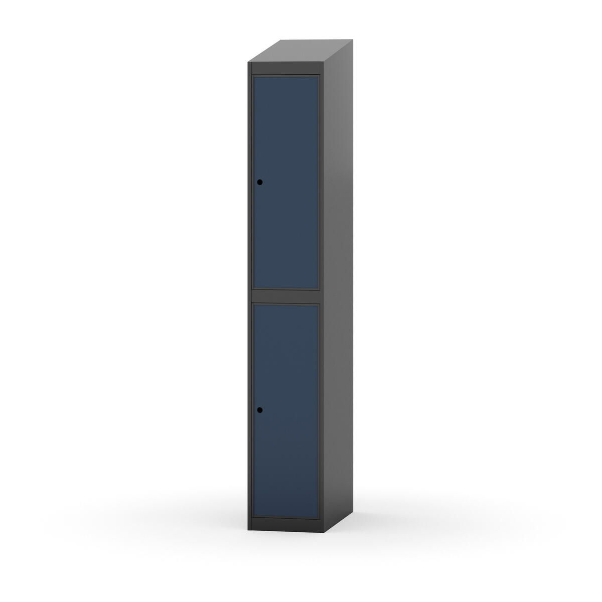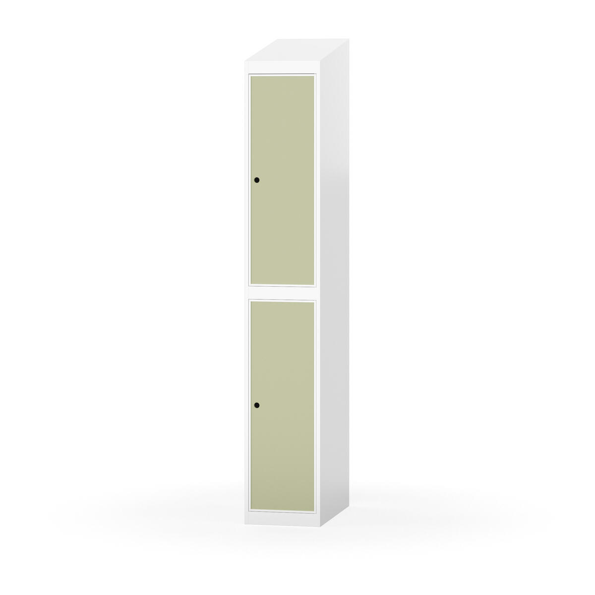 Garderobeskab med fuldsvejset stel. Vælg mellem låge i metal eller laminat. Metallågen er udstyret med dørstopper i stål og indvendig forstærkningsplade omkring låsehullet. Laminatlågen er indstøbt i en stålramme, som er udstyret med dørstopper i stål. Lågerne kan åbnes 90 grader. Indretning: Hylde og bøjlestang med to praktiske ankerkroge. Plan bund uden kant. Ventilation gennem huller i top-/bundplade. Bemærk, at lås samt sokkel/ben bestilles på separate varenumre. Leveres med færdigmonteret lås. Det valgte understel monteres ved levering.