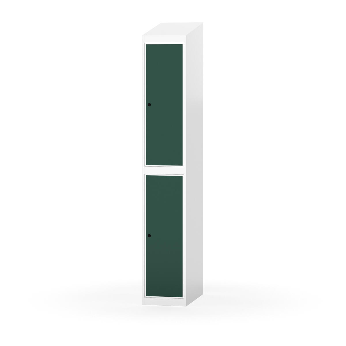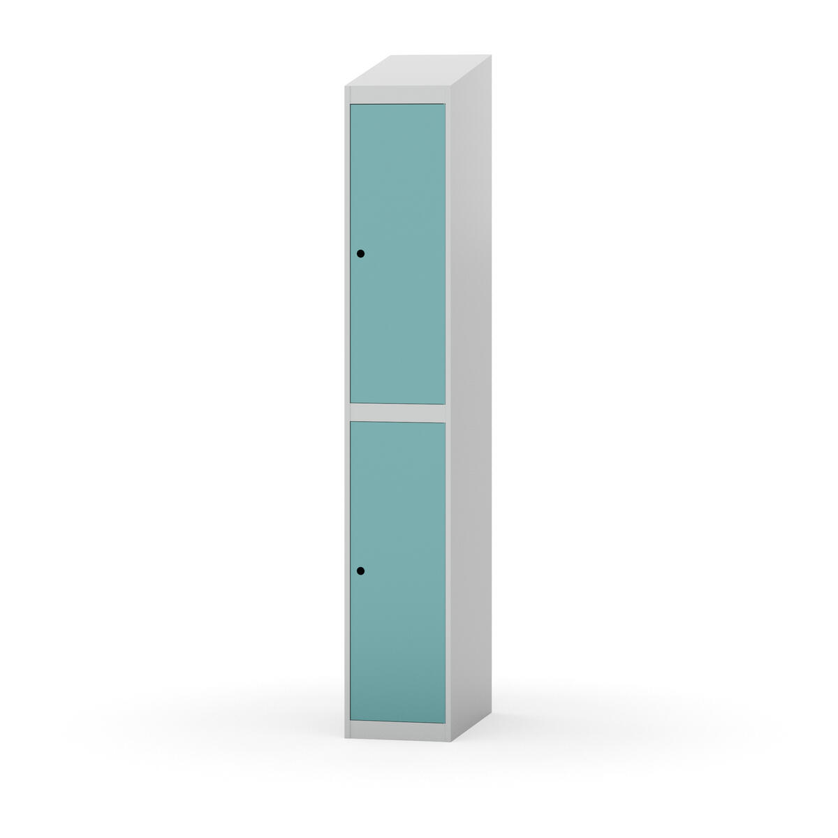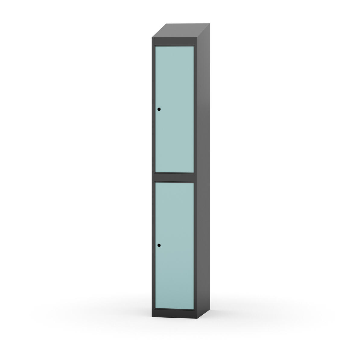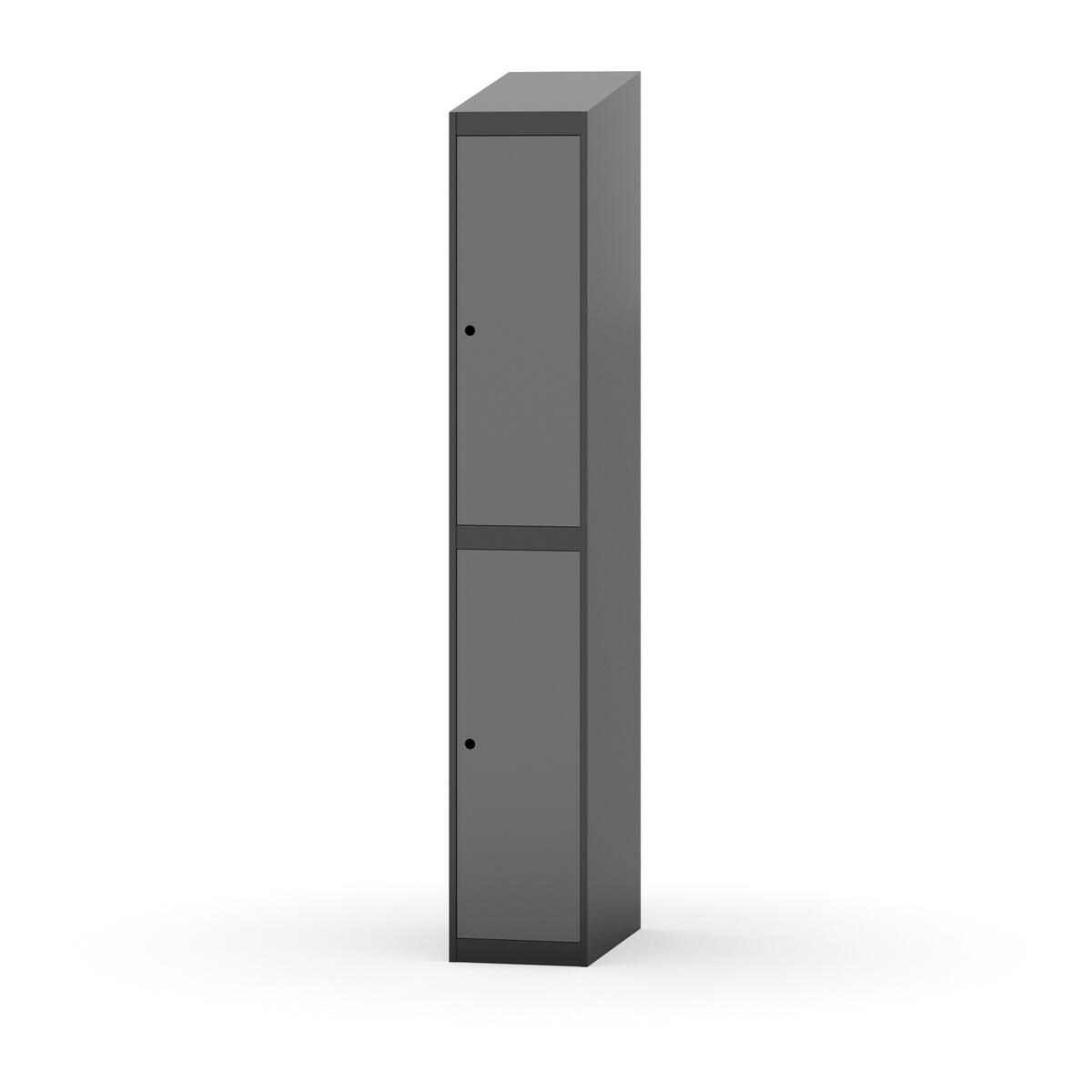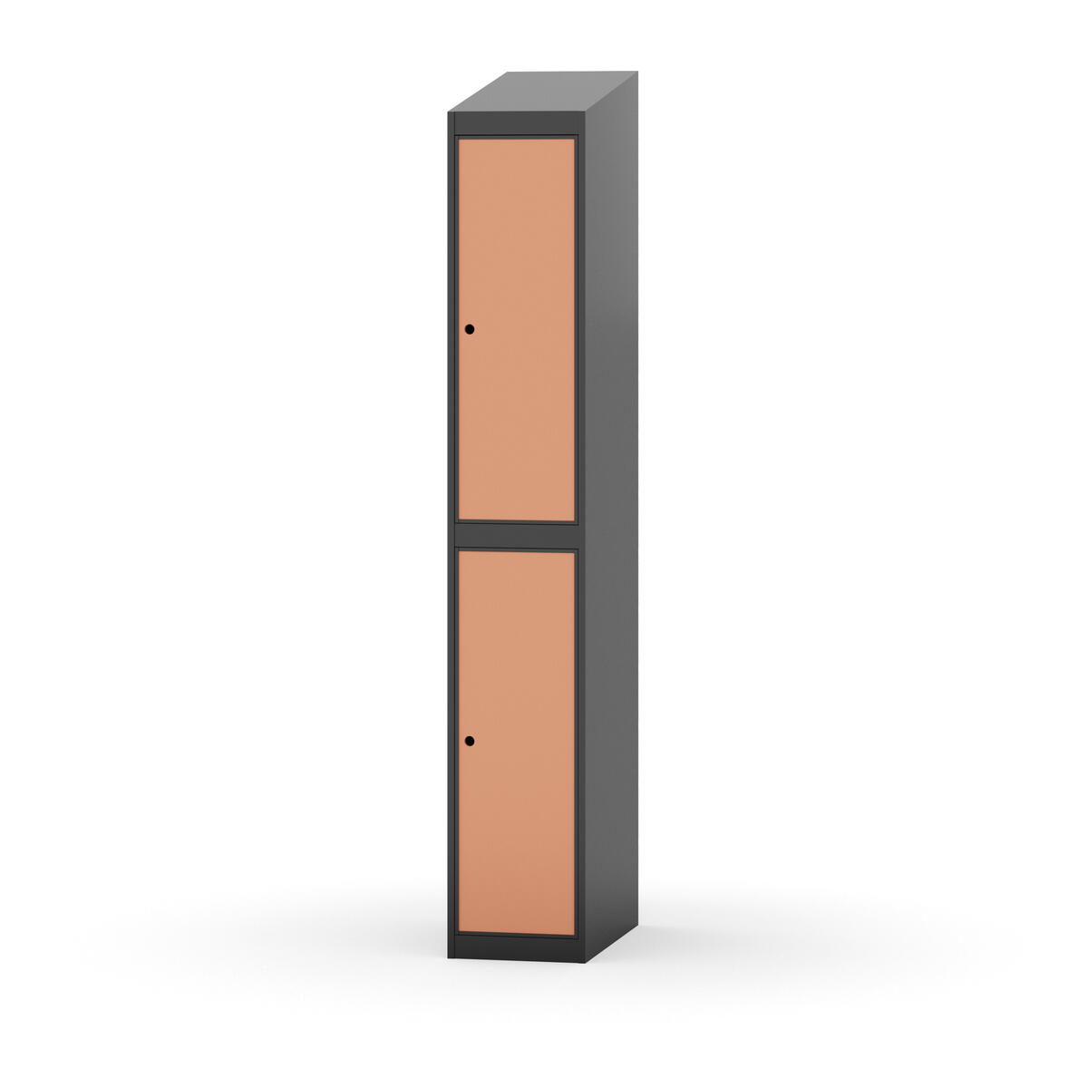 Garderobeskab med fuldsvejset stel. Vælg mellem låge i metal eller laminat. Metallågen er udstyret med dørstopper i stål og indvendig forstærkningsplade omkring låsehullet. Laminatlågen er indstøbt i en stålramme, som er udstyret med dørstopper i stål. Lågerne kan åbnes 90 grader. Indretning: Hylde og bøjlestang med to praktiske ankerkroge. Plan bund uden kant. Ventilation gennem huller i top-/bundplade. Bemærk, at lås samt sokkel/ben bestilles på separate varenumre. Leveres med færdigmonteret lås. Det valgte understel monteres ved levering.
