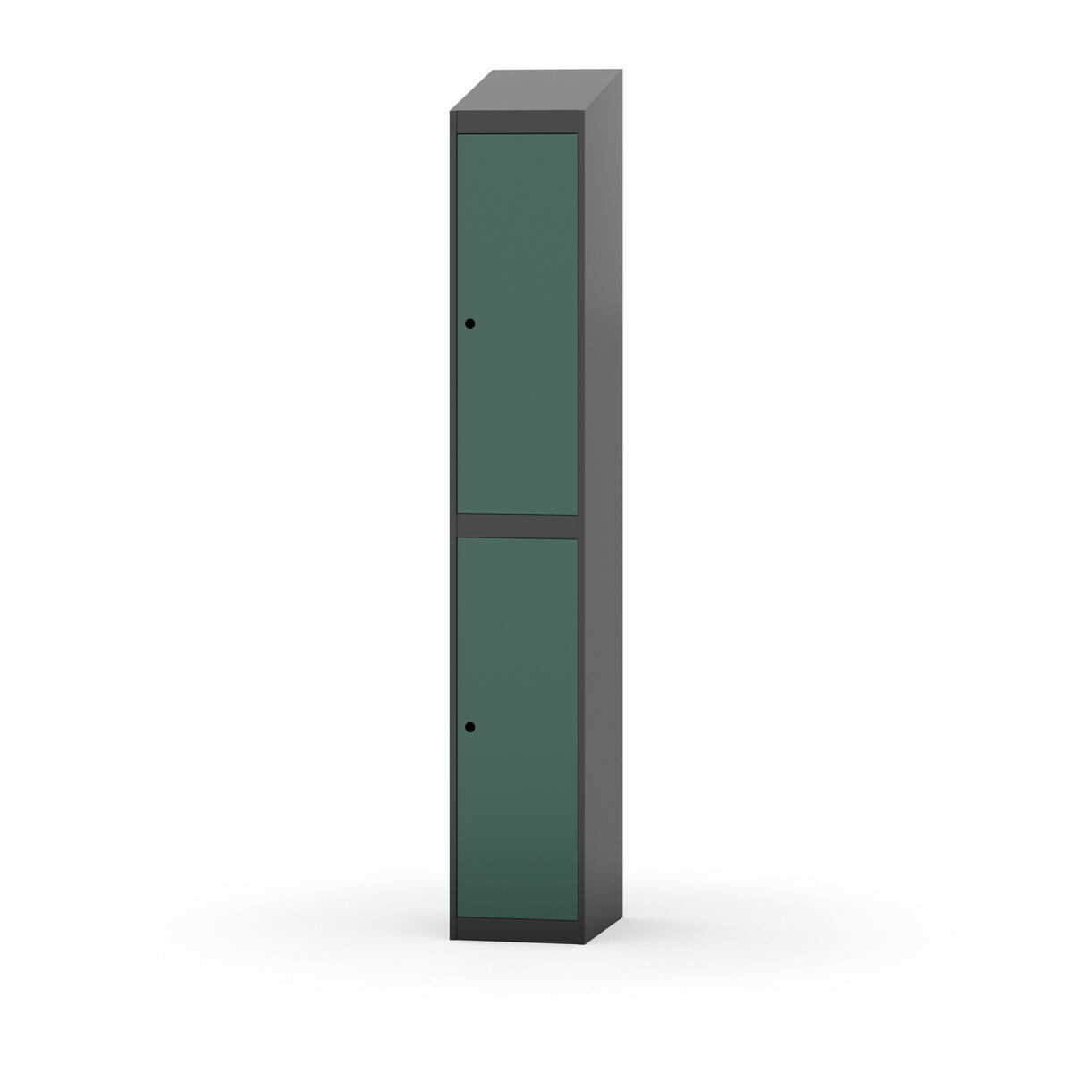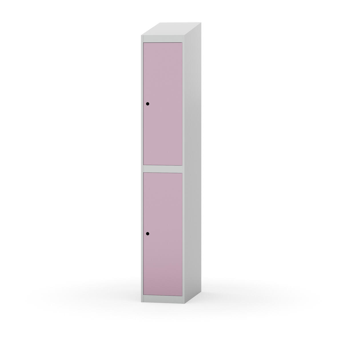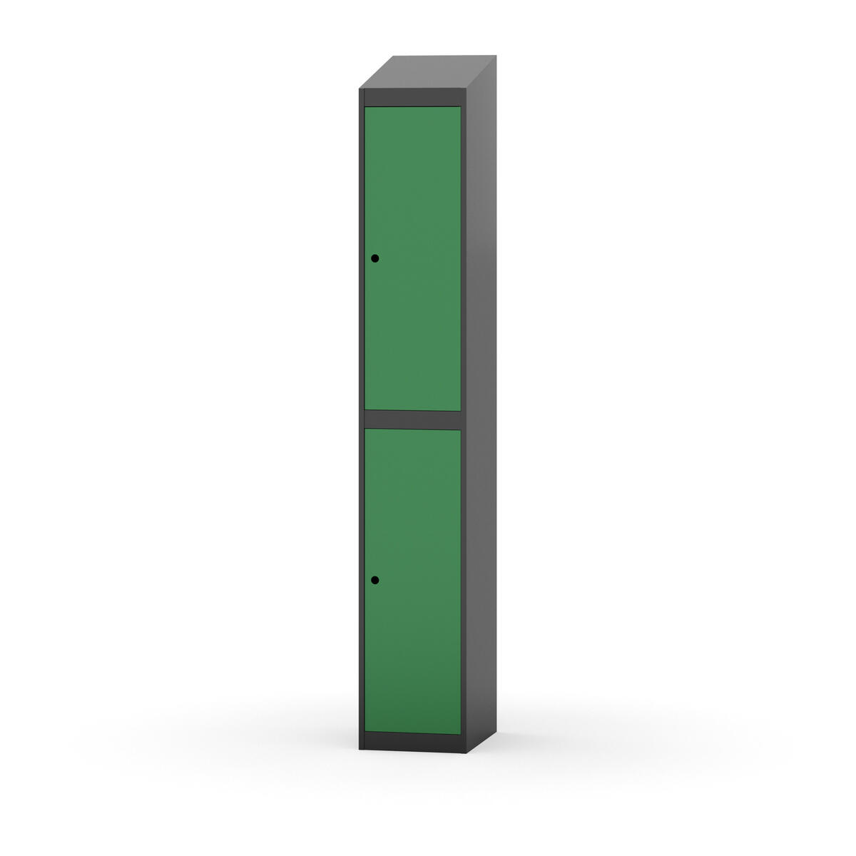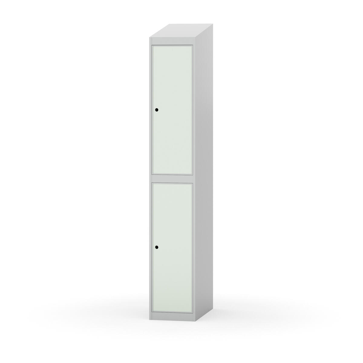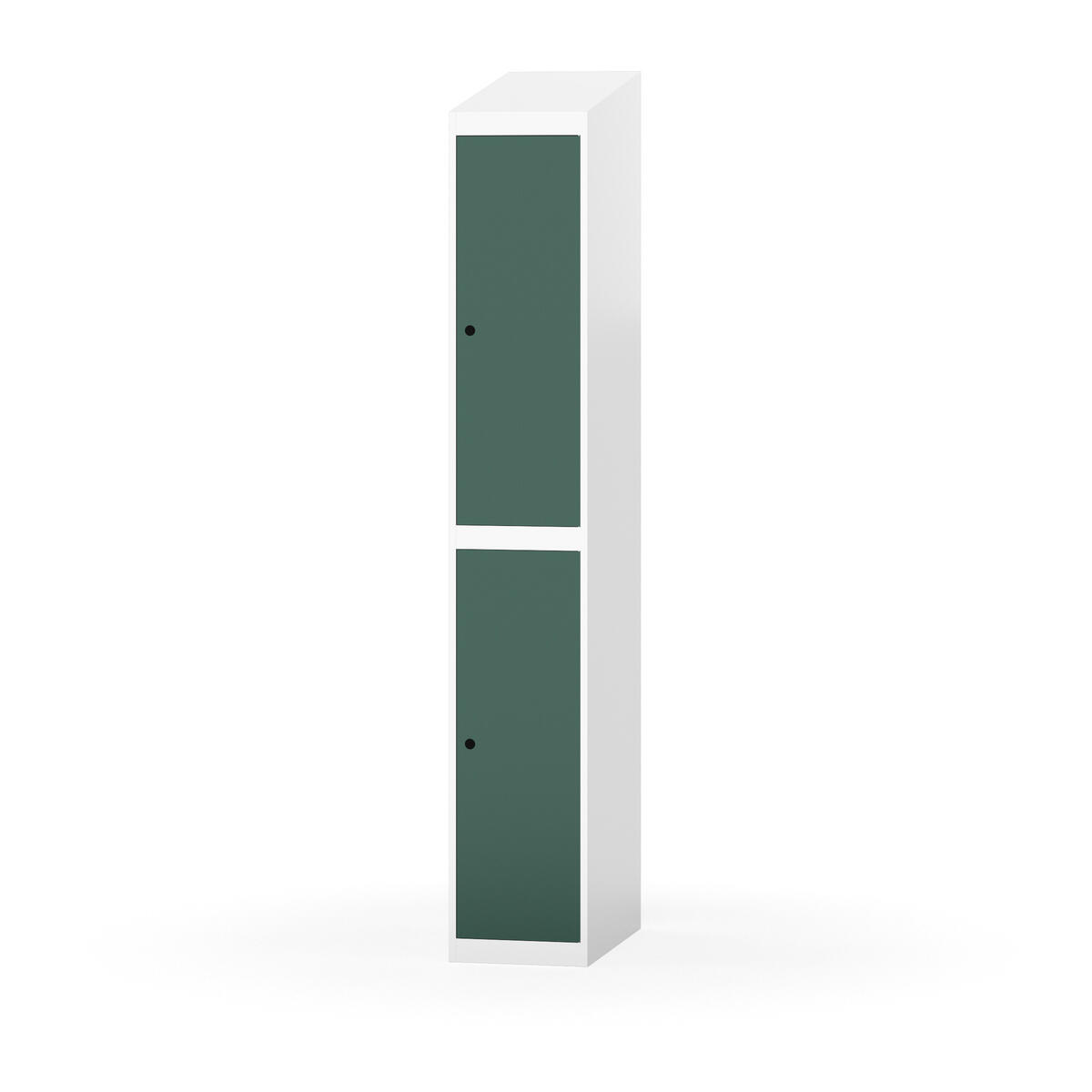 Garderobeskab med fuldsvejset stel. Vælg mellem låge i metal eller laminat. Metallågen er udstyret med dørstopper i stål og indvendig forstærkningsplade omkring låsehullet. Laminatlågen er indstøbt i en stålramme, som er udstyret med dørstopper i stål. Lågerne kan åbnes 90 grader. Indretning: Hylde og bøjlestang med to praktiske ankerkroge. Plan bund uden kant. Ventilation gennem huller i top-/bundplade. Bemærk, at lås samt sokkel/ben bestilles på separate varenumre. Leveres med færdigmonteret lås. Det valgte understel monteres ved levering.