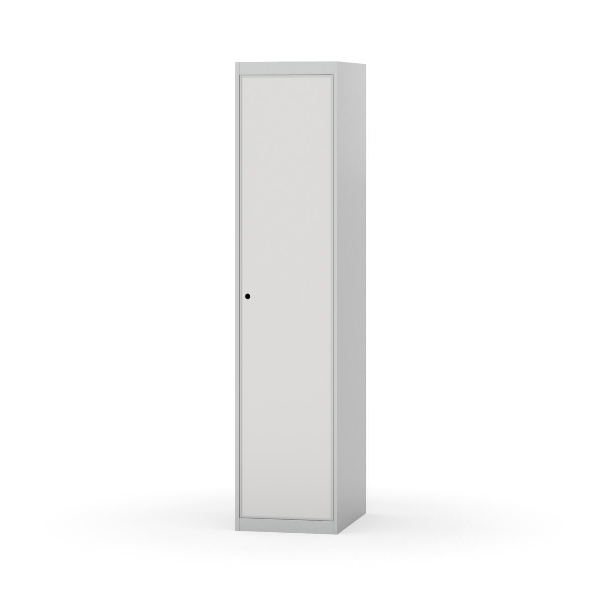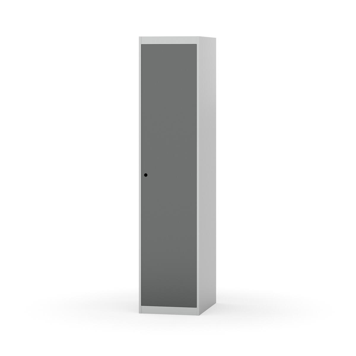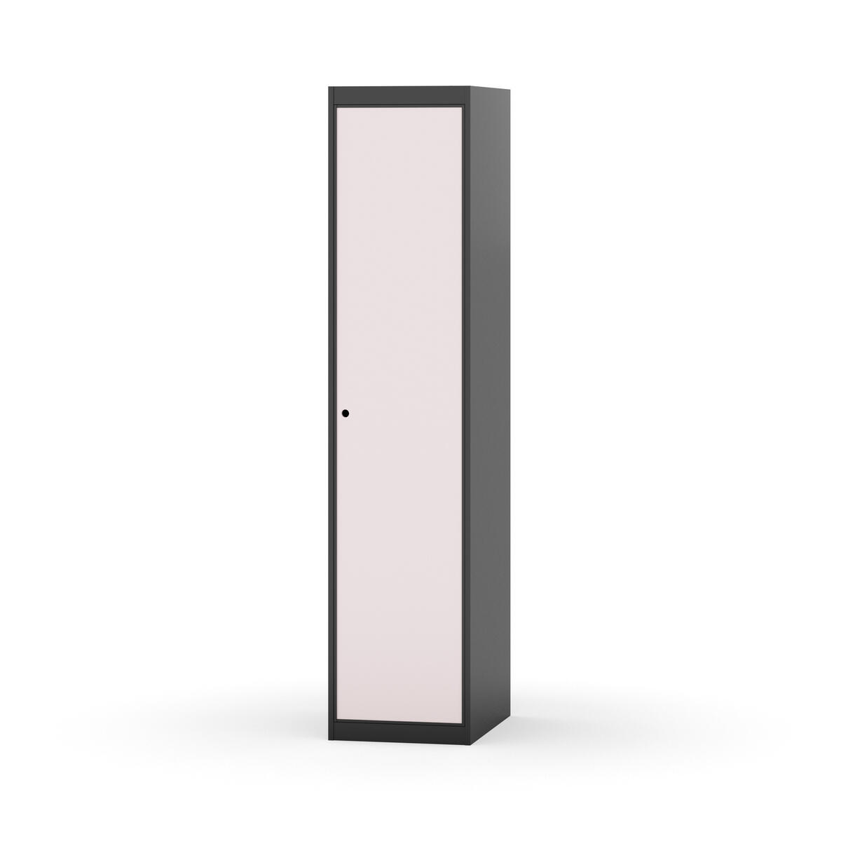 Garderobeskab med fuldsvejset stel. Vælg mellem låge i metal eller laminat. Metallågen er udstyret med dørstopper i stål og indvendig forstærkningsplade omkring låsehullet. Laminatlågen er indstøbt i en stålramme, som er udstyret med dørstopper i stål. Lågerne kan åbnes 90 grader. Indretning: Hylde og bøjlestang med to praktiske ankerkroge. Plan bund uden kant. Ventilation gennem huller i top-/bundplade. Bemærk, at lås samt sokkel/ben bestilles på separate varenumre. Leveres med færdigmonteret lås. Det valgte understel monteres ved levering.