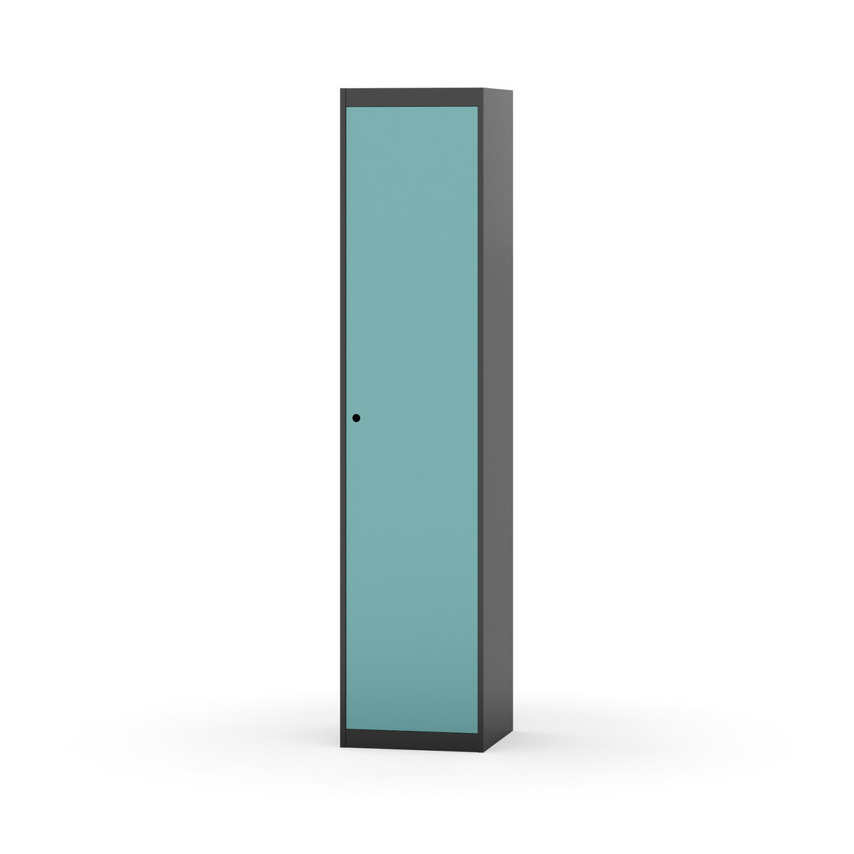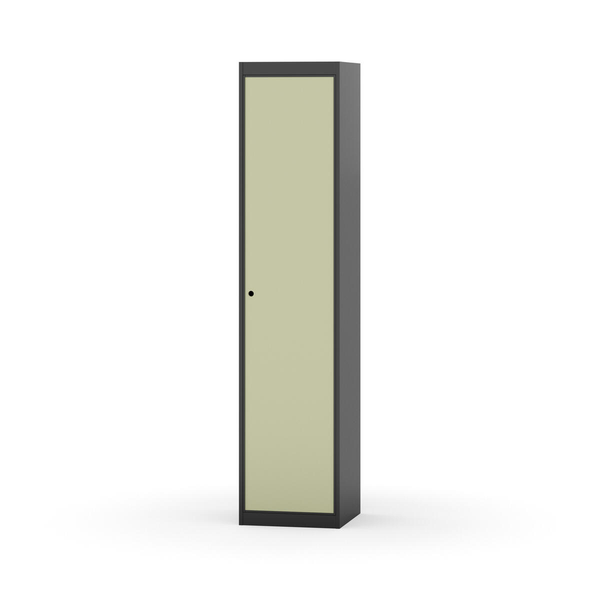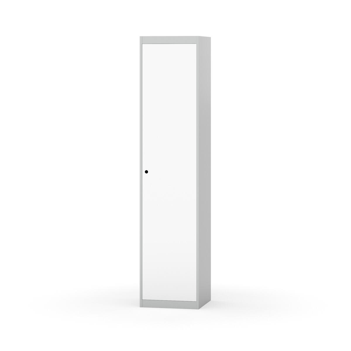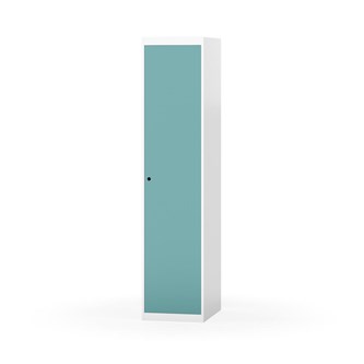 Garderobeskab med fuldsvejset stel. Vælg mellem låge i metal eller laminat. Metallågen er udstyret med dørstopper i stål og indvendig forstærkningsplade omkring låsehullet. Laminatlågen er indstøbt i en stålramme, som er udstyret med dørstopper i stål. Lågerne kan åbnes 90 grader. Indretning: Hylde og bøjlestang med to praktiske ankerkroge. Plan bund uden kant. Ventilation gennem huller i top-/bundplade. Bemærk, at lås samt sokkel/ben bestilles på separate varenumre. Leveres med færdigmonteret lås. Det valgte understel monteres ved levering.